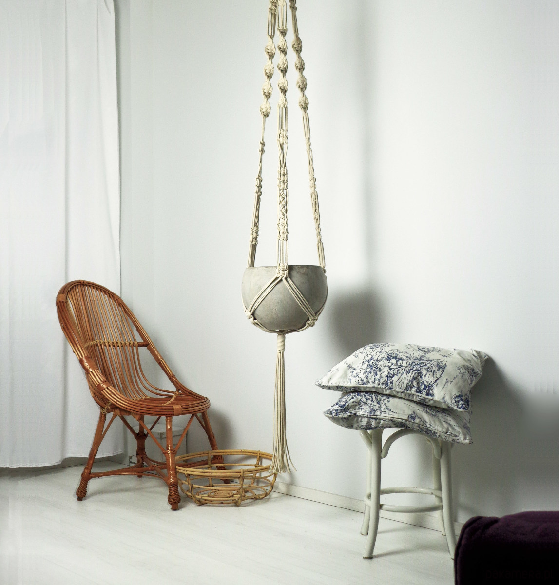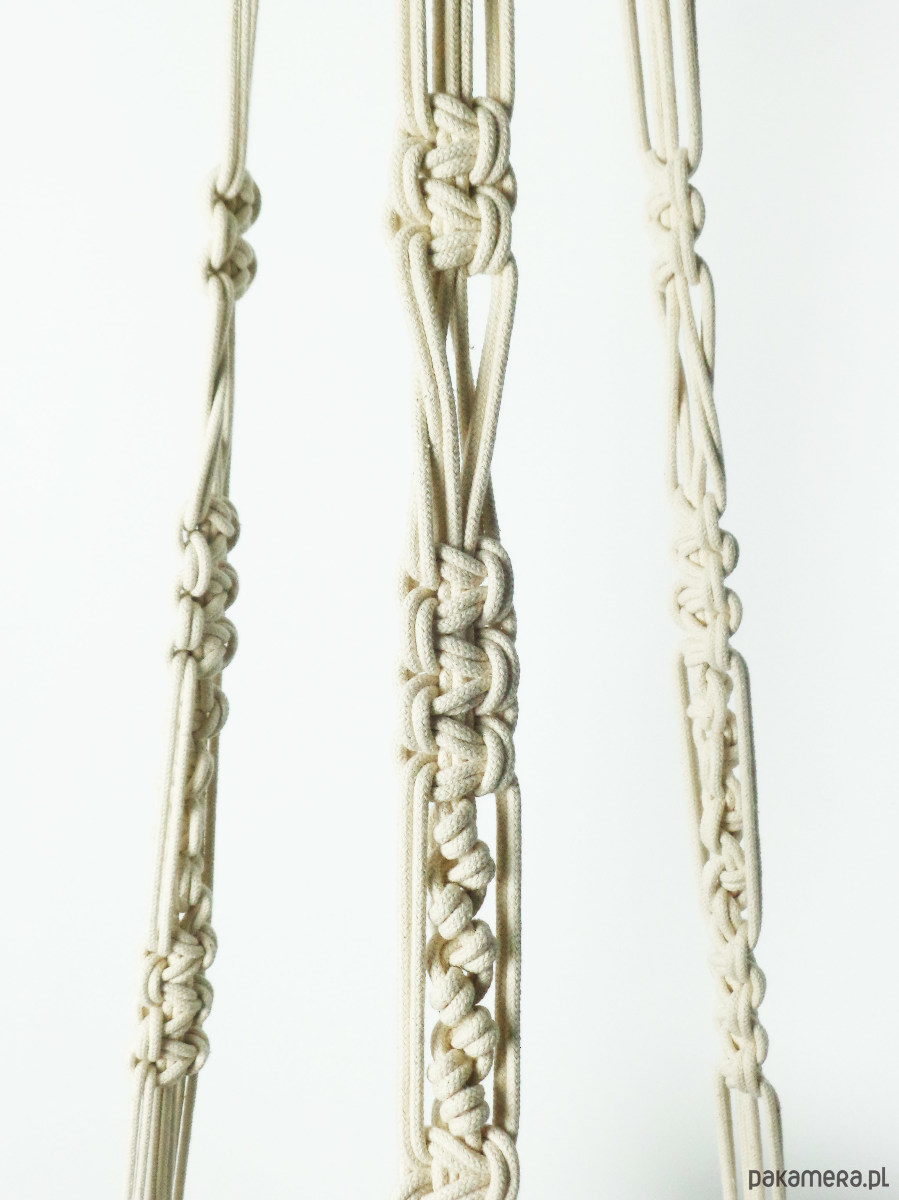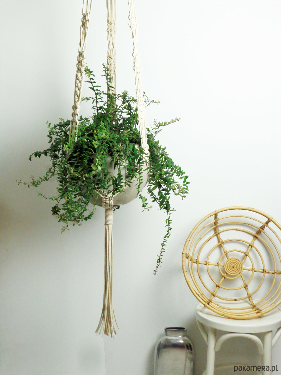 Makramowy kwietnik w rozmiarze XXXL, wykonany z naturalnego sznurka bawełnianego. Polecany do dużych przestrzeni, szczególnie salonu i sypialni.