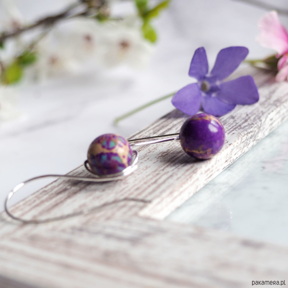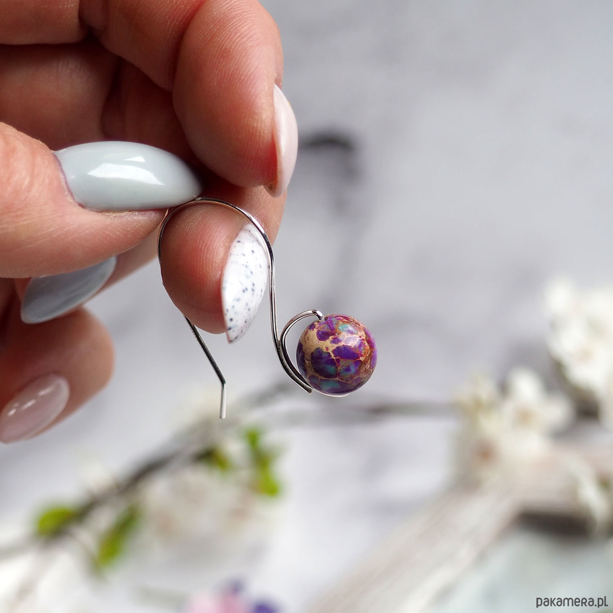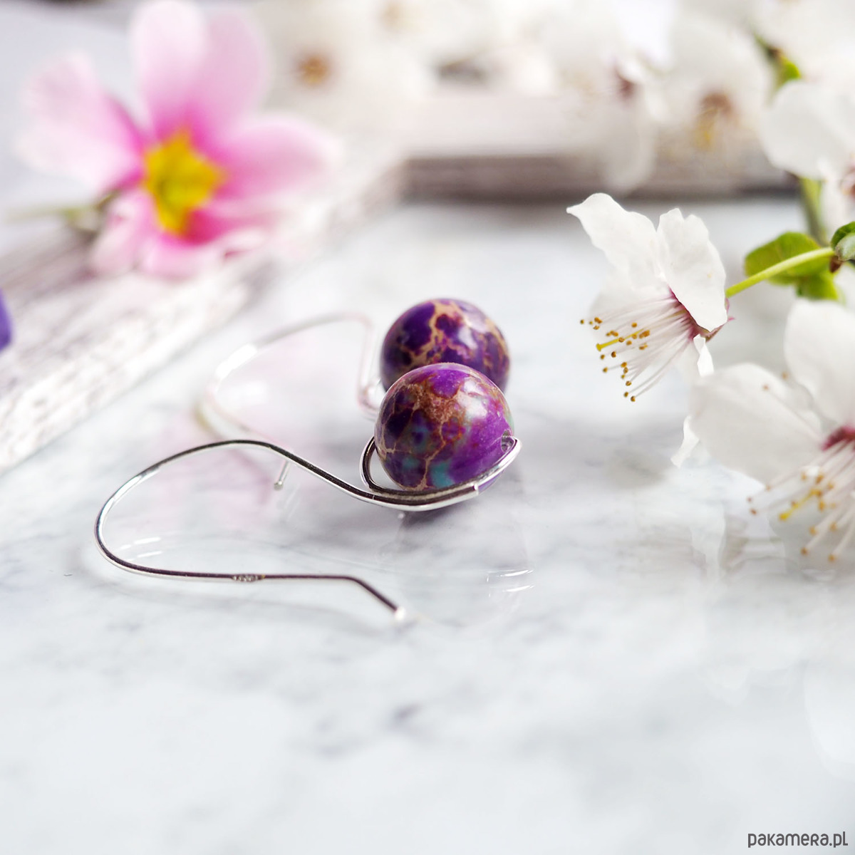 Niezwykłe, przepiękne kolczyki z jaspisu cesarskiego i srebra 925. Bez wątpienia uwagę i wzrok przykuwa interesujący kolor kul jaspisu.