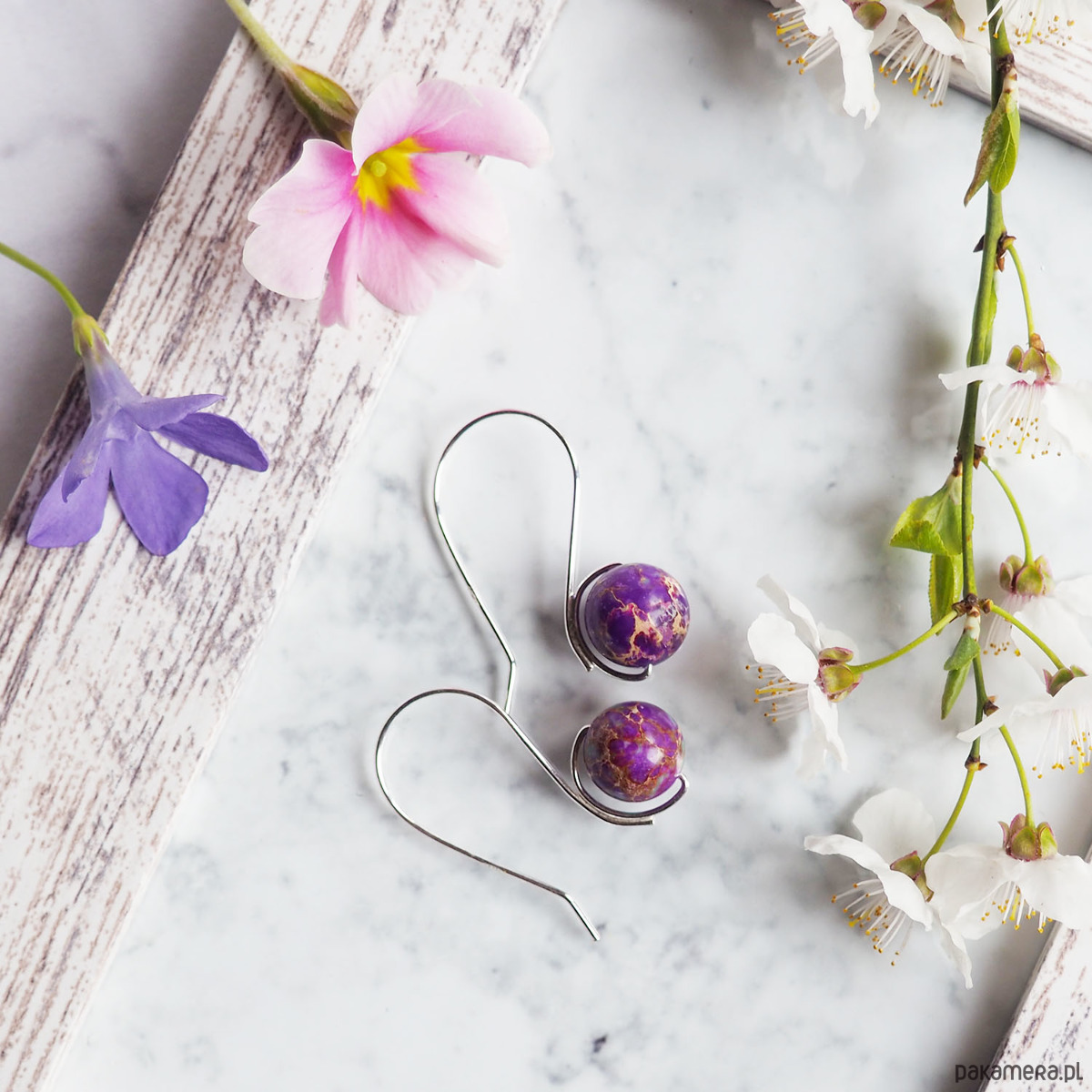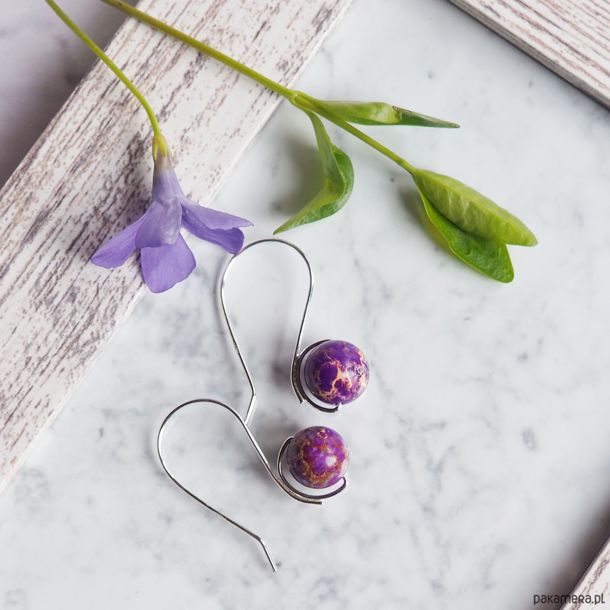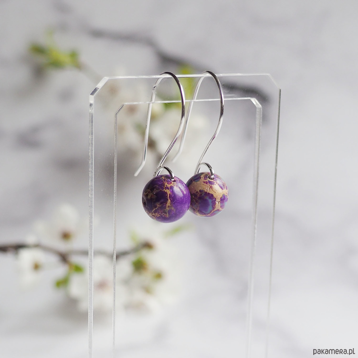 Niezwykłe, przepiękne kolczyki z jaspisu cesarskiego i srebra 925. Bez wątpienia uwagę i wzrok przykuwa interesujący kolor kul jaspisu.