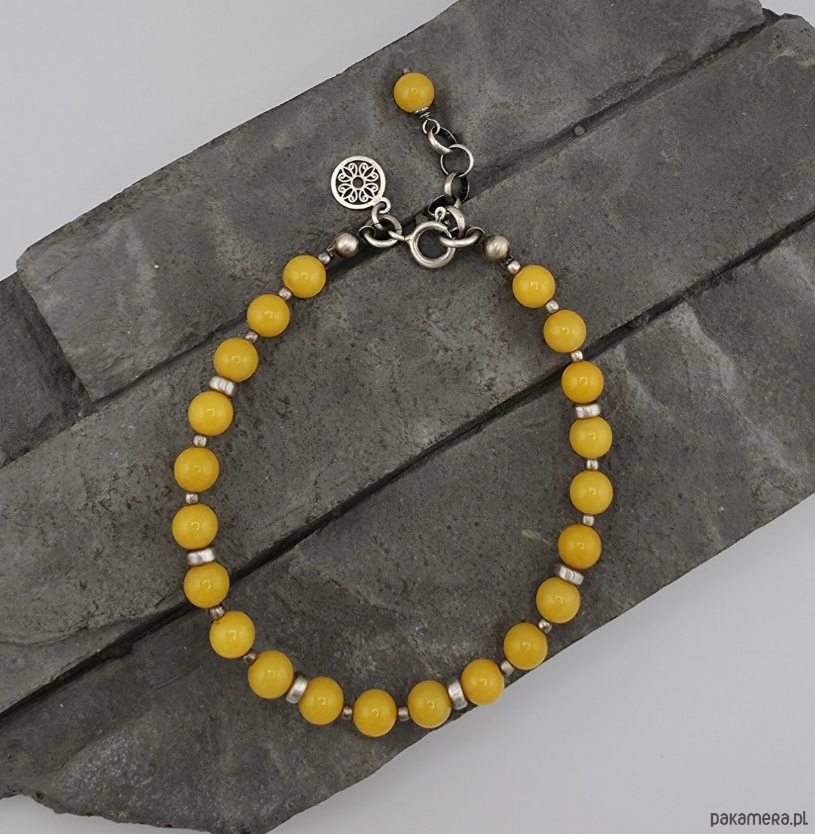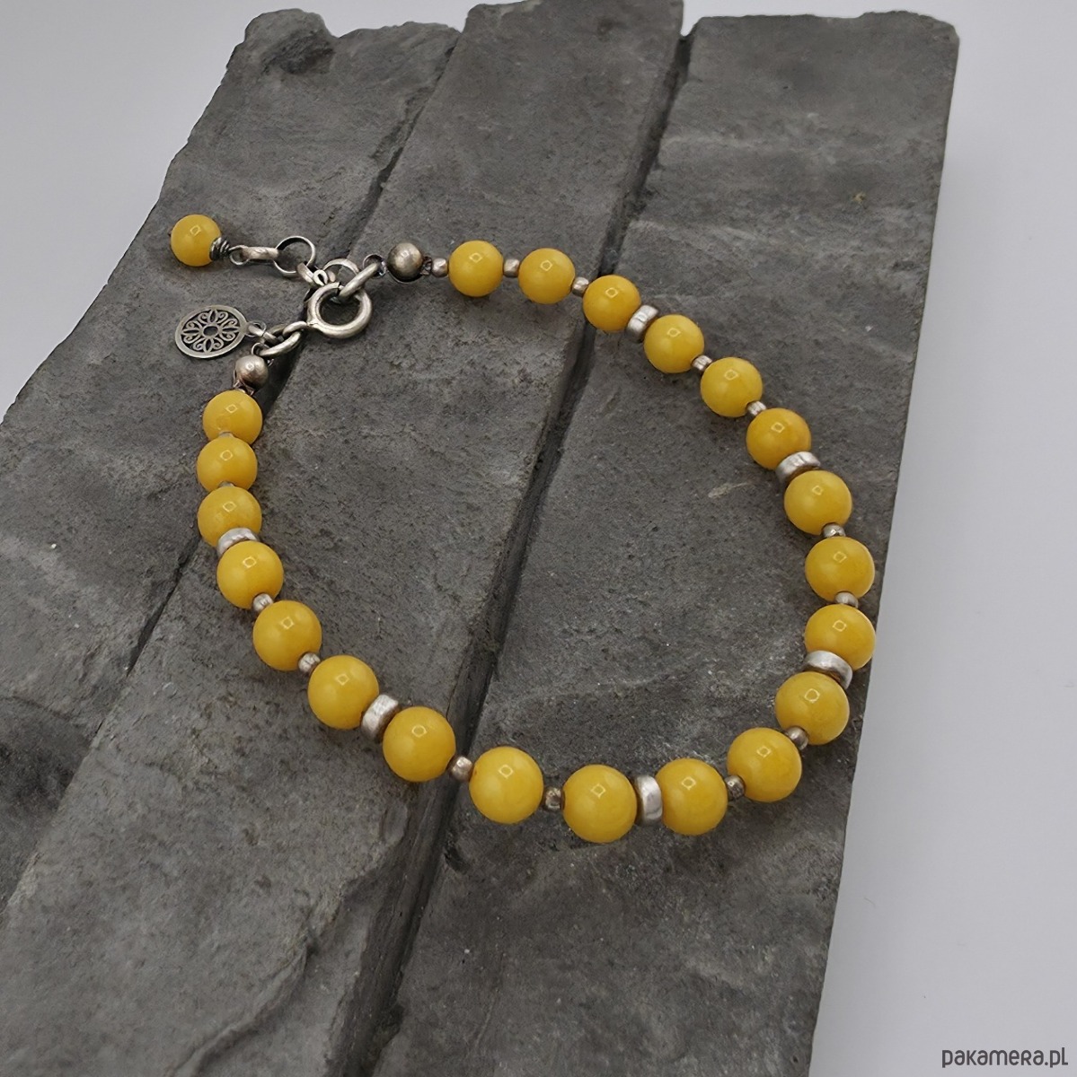 Minimalistyczna bransoletka na letnie dni. Wykonana w całości z oksydowanego srebra próby 925 oraz gładkich kulek żółtego jadeitu wielkości ok. 6 mm. Całkowita długość bransoletki regulowana od 19,5 cm do 21 cm. Na życzenie mogę wykonać podobną bransoletkę z innymi kamieniami albo jej nie oksydować. Ozdobnie zapakowana.