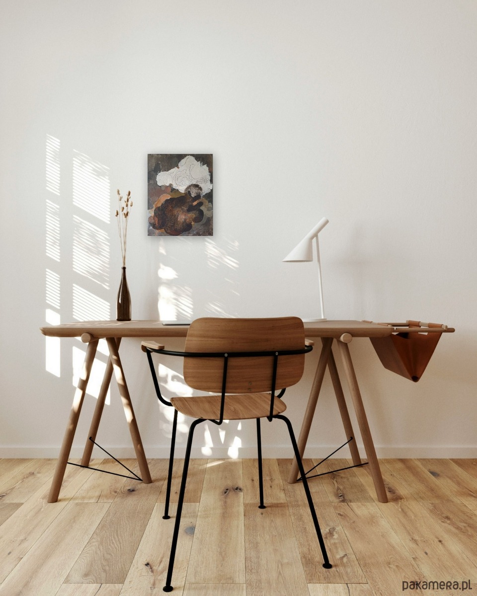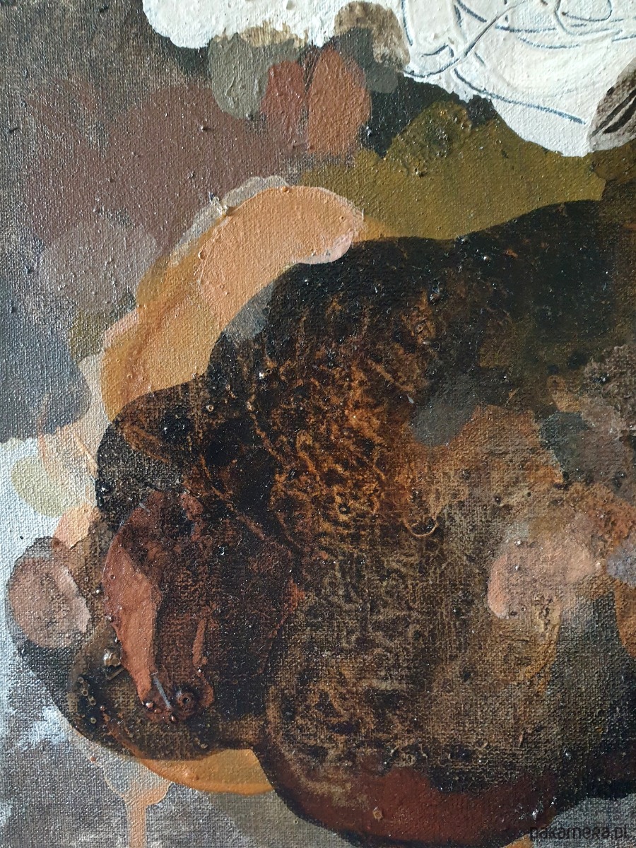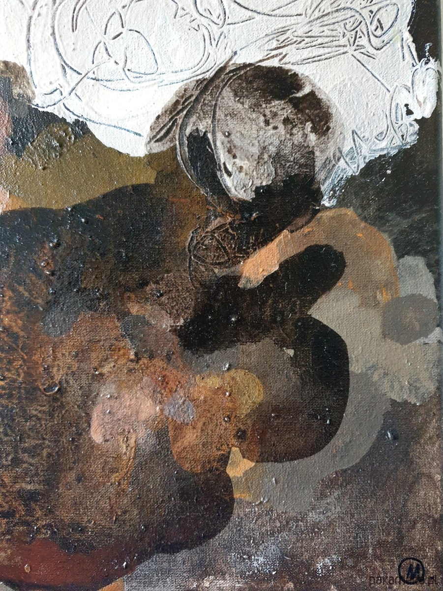 TECHNIKA I WYMIARY: Pigmenty ziemne, akryl, papier, węgiel, pastele, ołówek na płótnie bawełnianym, 24x30 cm