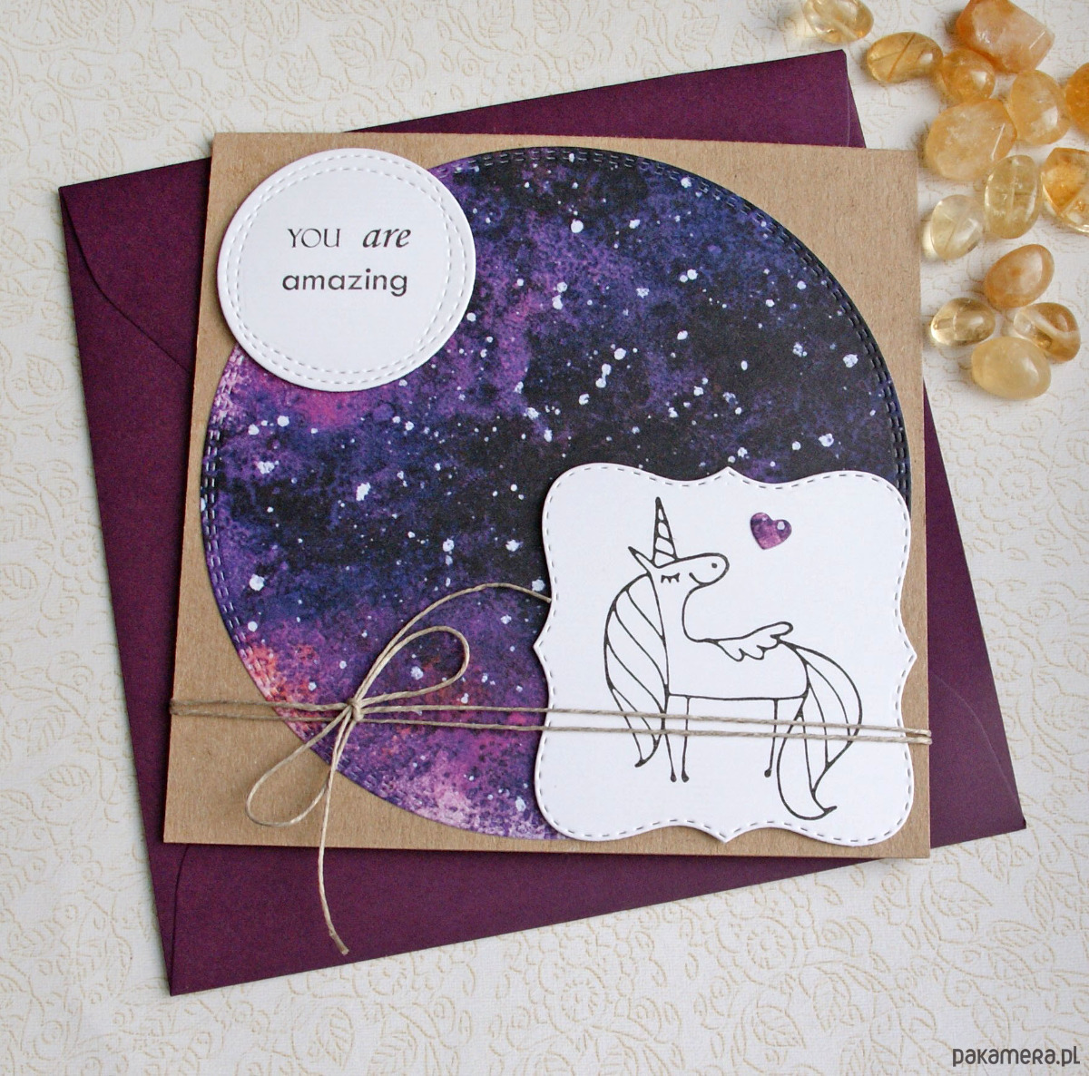 wykonana na bazie bardzo grubego papieru eko-kraft (100% makulatury), ozdobiona kolorowym kartonem z ozdobnymi przeszyciami na krawędziach elementami lekko przestrzennymi, stemplowanym jednorożcem i napisem YOU ARE AMAZING.