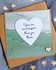 wykonana na bazie grubego kartonu EKO-kraft (100% makulatury), ozdobiona wzorzystym papierem, usztywnionym elementem przestrzennym z drukowanym napisem. przewiązana sznurkiem jutowym. Drewniane serduszko.