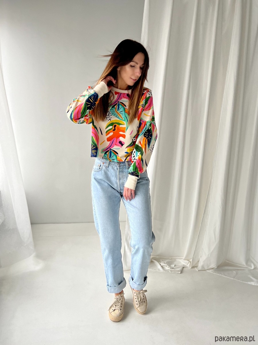 Bluzę charakteryzuje także swobodny, oversize'owy krój, w którym poczujesz się komfortowo i wygodnie w każdych okolicznościach. W dole wykończona jest luźno, co nadaje całokształtowi finezyjnej formy.