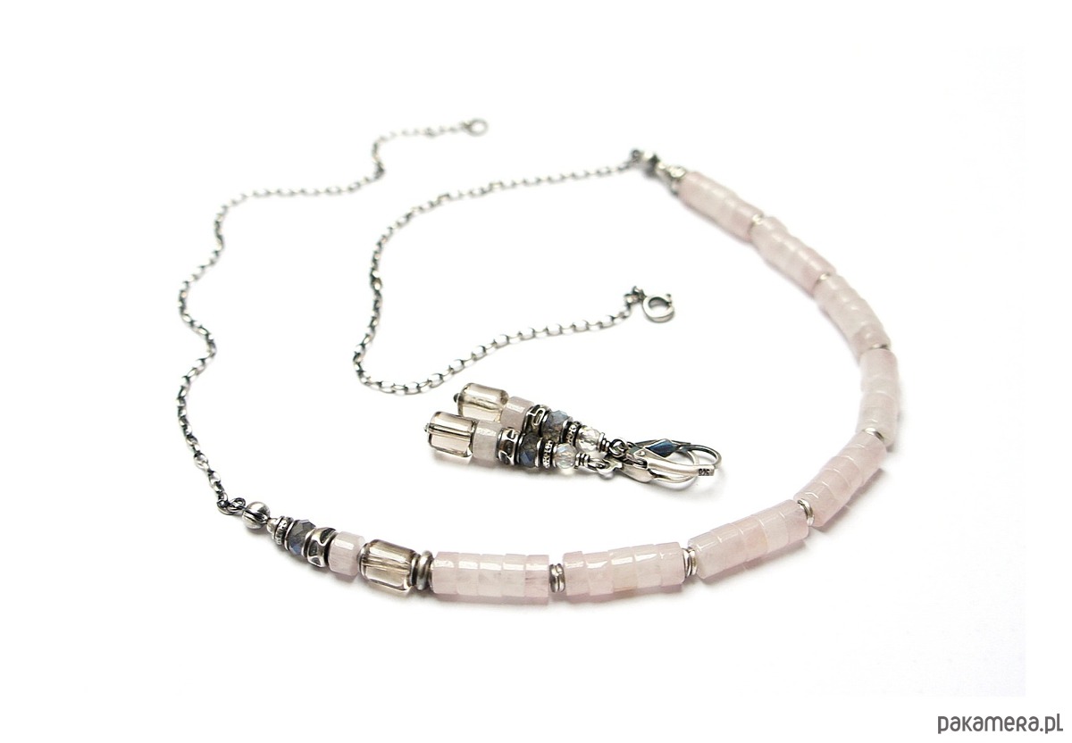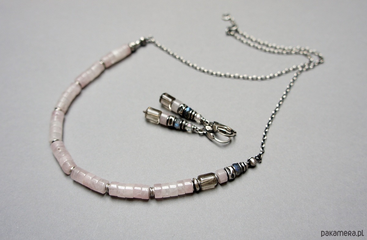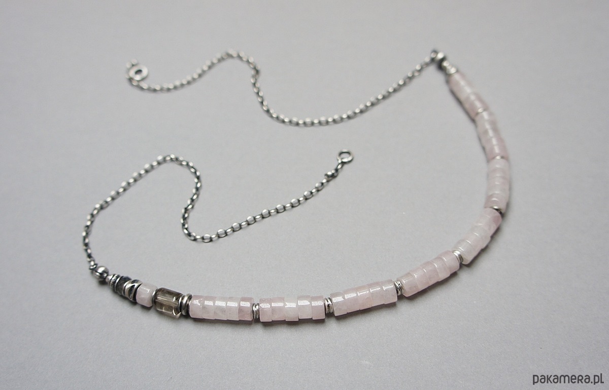Naszyjnik wykonany ze srebra [pr. 925] w połączeniu z krążkami kwarców różowych [6 x 4mm], wałeczkiem kwarcu dymnego [8 x 6mm], fasetowaną oponką labradorytu [6mm]. Całość oksydowana i przetarta. Całkowita długość naszyjnika ok. 53,2cm. Biżuteria ozdobnie zapakowana.