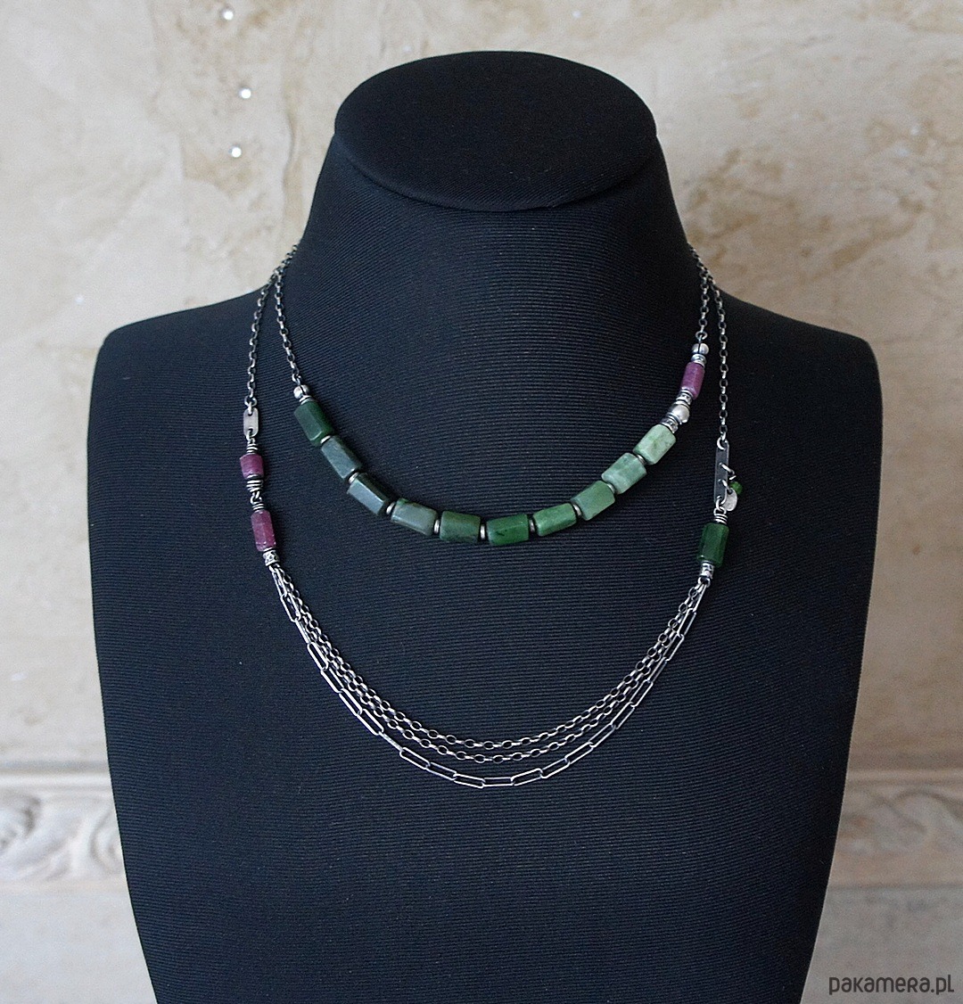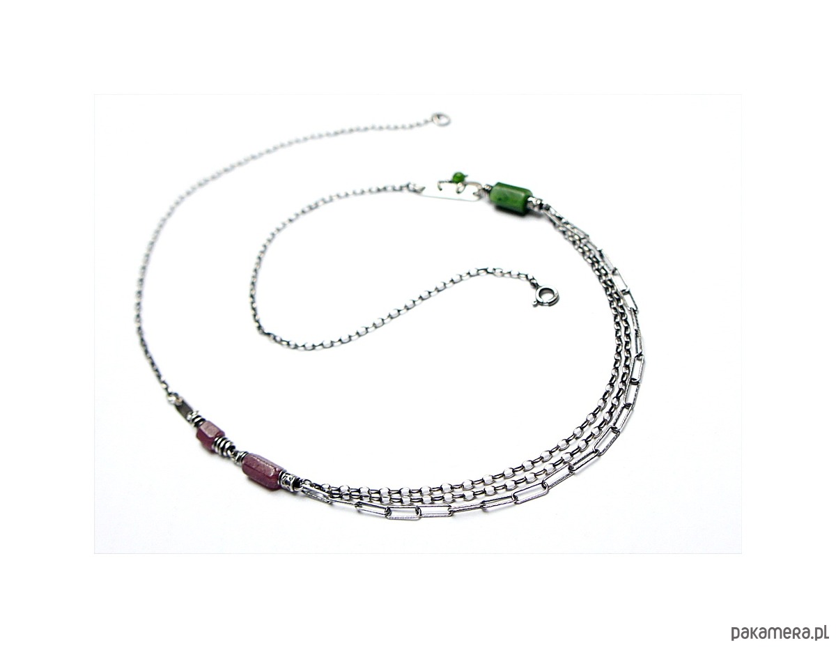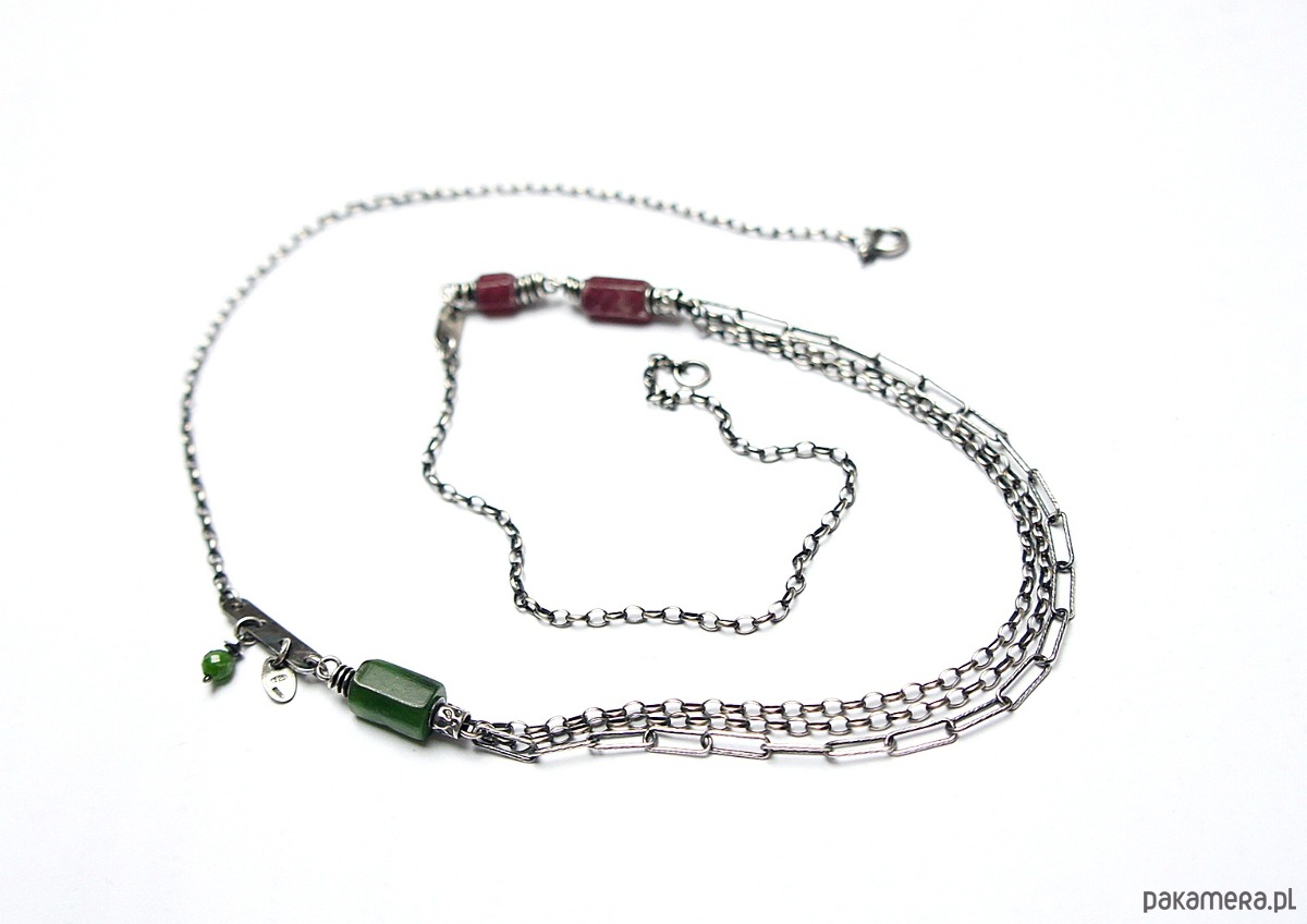 Naszyjnik wykonany ze srebra [pr. 925] w połączeniu z fasetowanymi wałeczkami surowego rubinu i nefrytu [7mm ,10mm i 11mm] oraz kuleczką diopsydu [4mm]. Całość oksydowana i przetarta. Całkowita długość naszyjnika 60cm. Biżuteria ozdobnie zapakowana.
