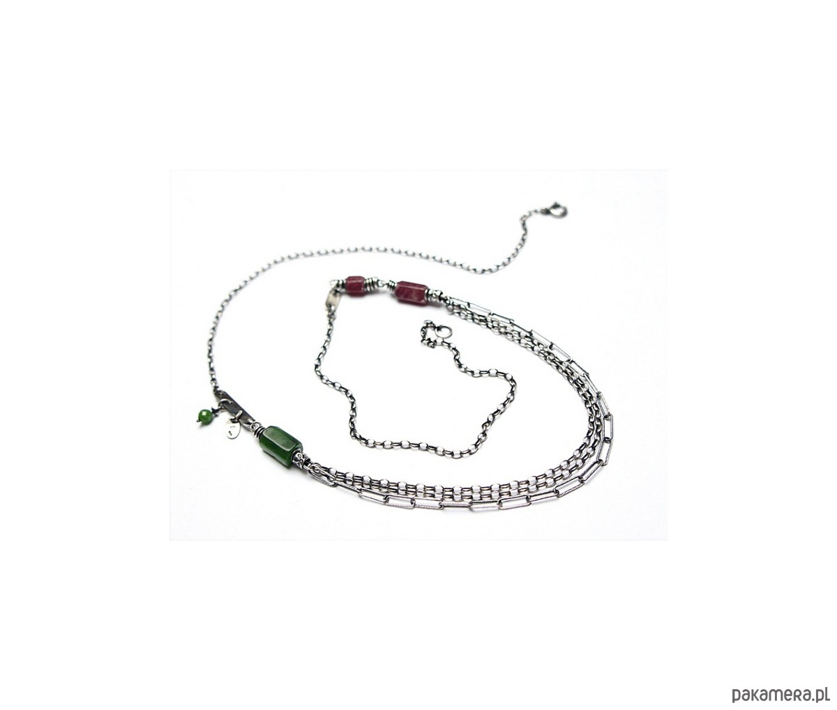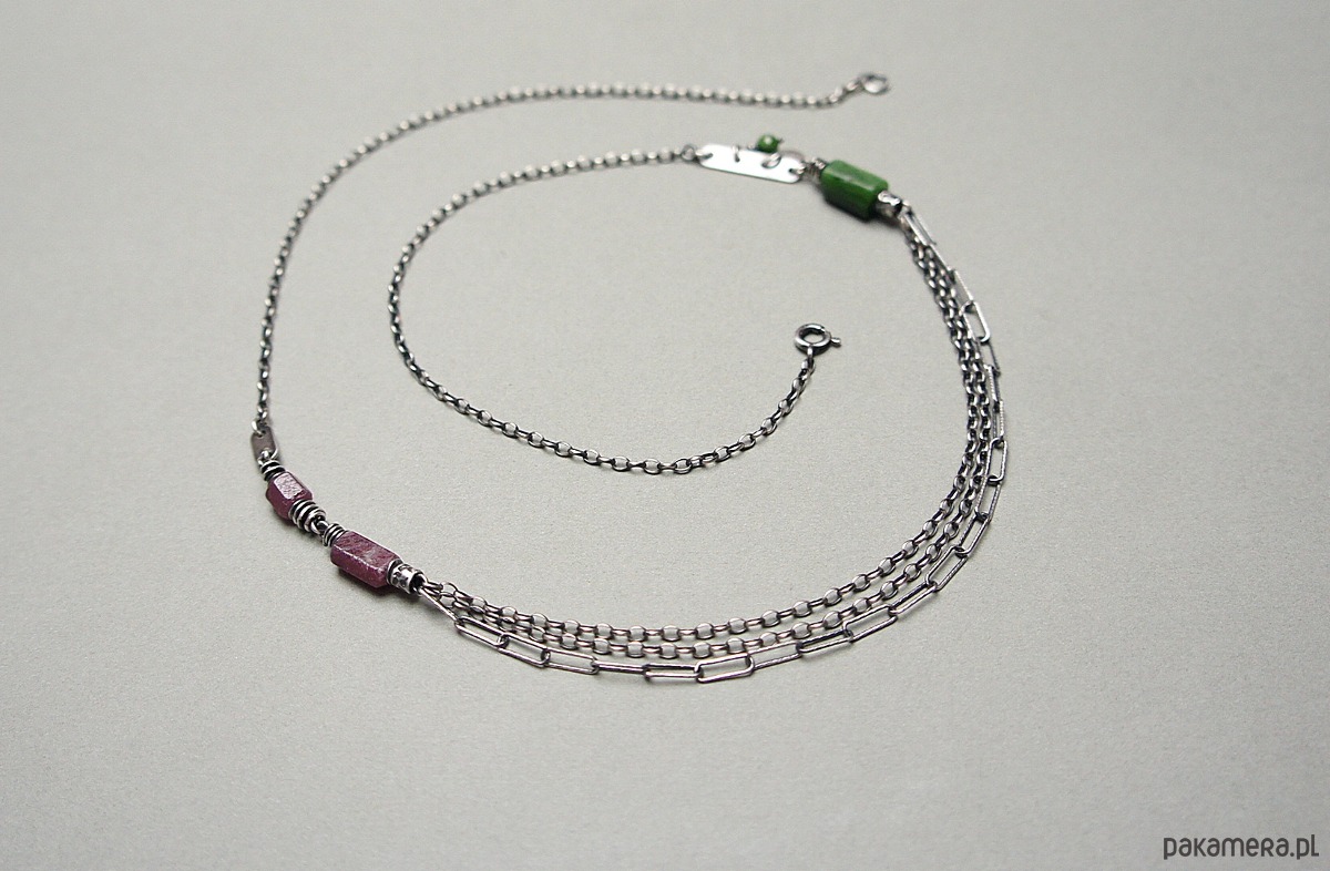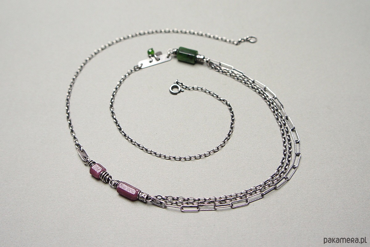 Naszyjnik wykonany ze srebra [pr. 925] w połączeniu z fasetowanymi wałeczkami surowego rubinu i nefrytu [7mm ,10mm i 11mm] oraz kuleczką diopsydu [4mm]. Całość oksydowana i przetarta. Całkowita długość naszyjnika 60cm. Biżuteria ozdobnie zapakowana.