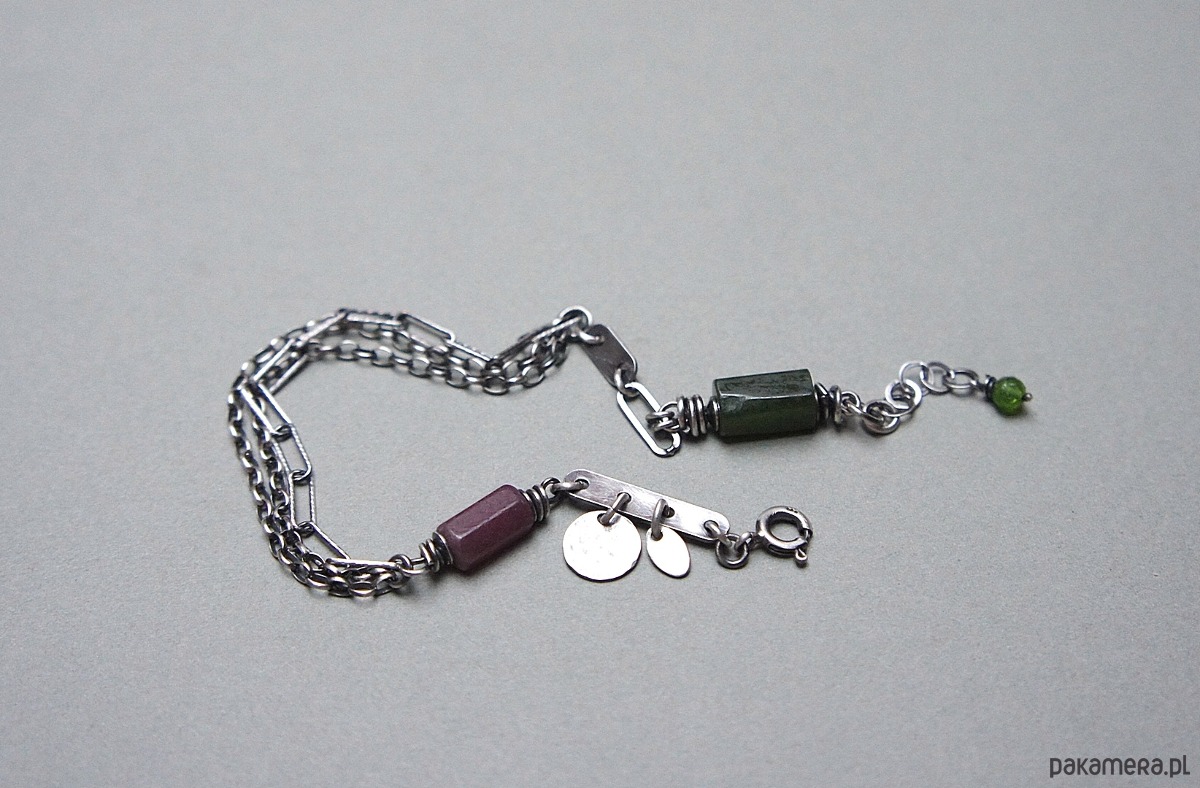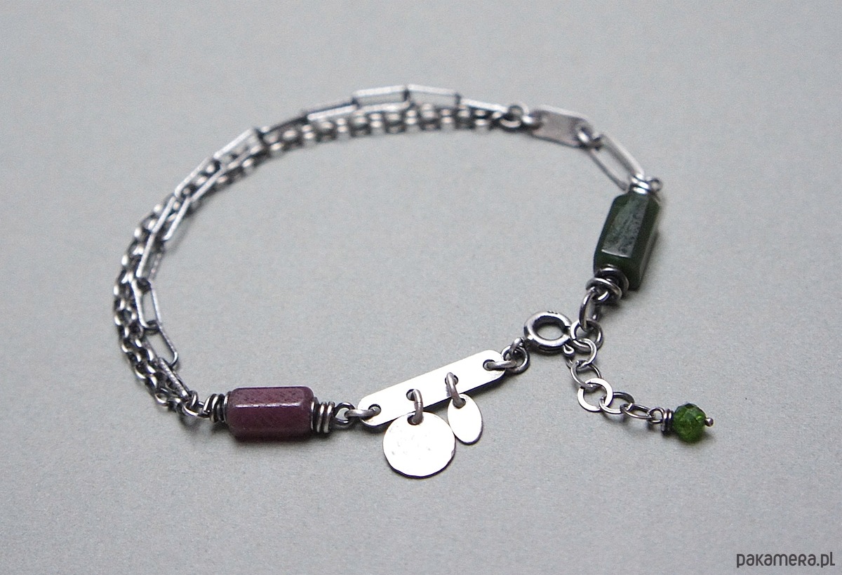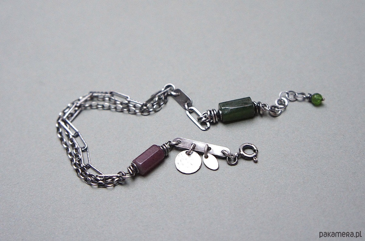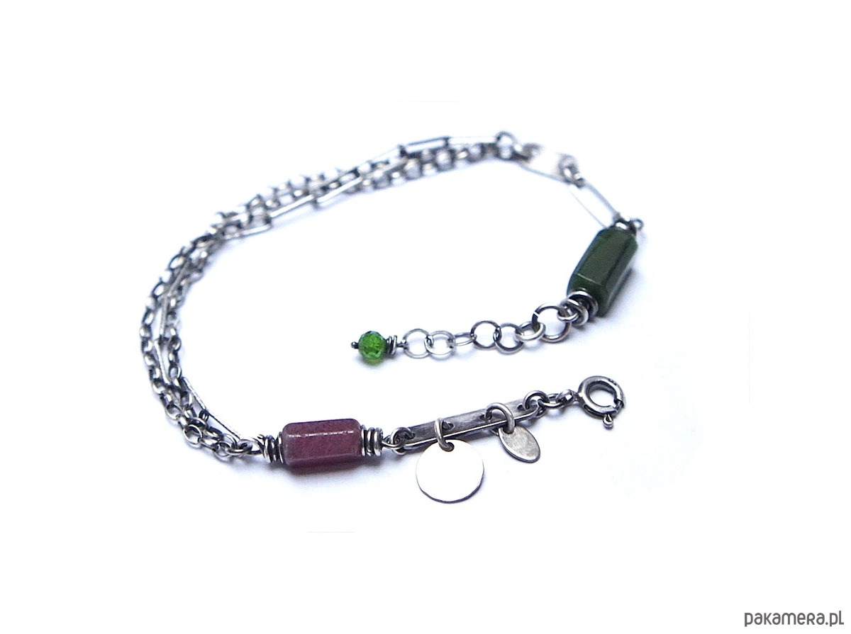 Bransoletka wykonana ze srebra [pr. 925] w połączeniu z fasetowanymi wałeczkami surowego rubinu i nefrytu [10mm i 11mm] oraz kuleczką diopsydu [4mm]. Całość oksydowana i przetarta. Całkowita długość bransoletki 19cm plus przedłużka. Biżuteria ozdobnie zapakowana.