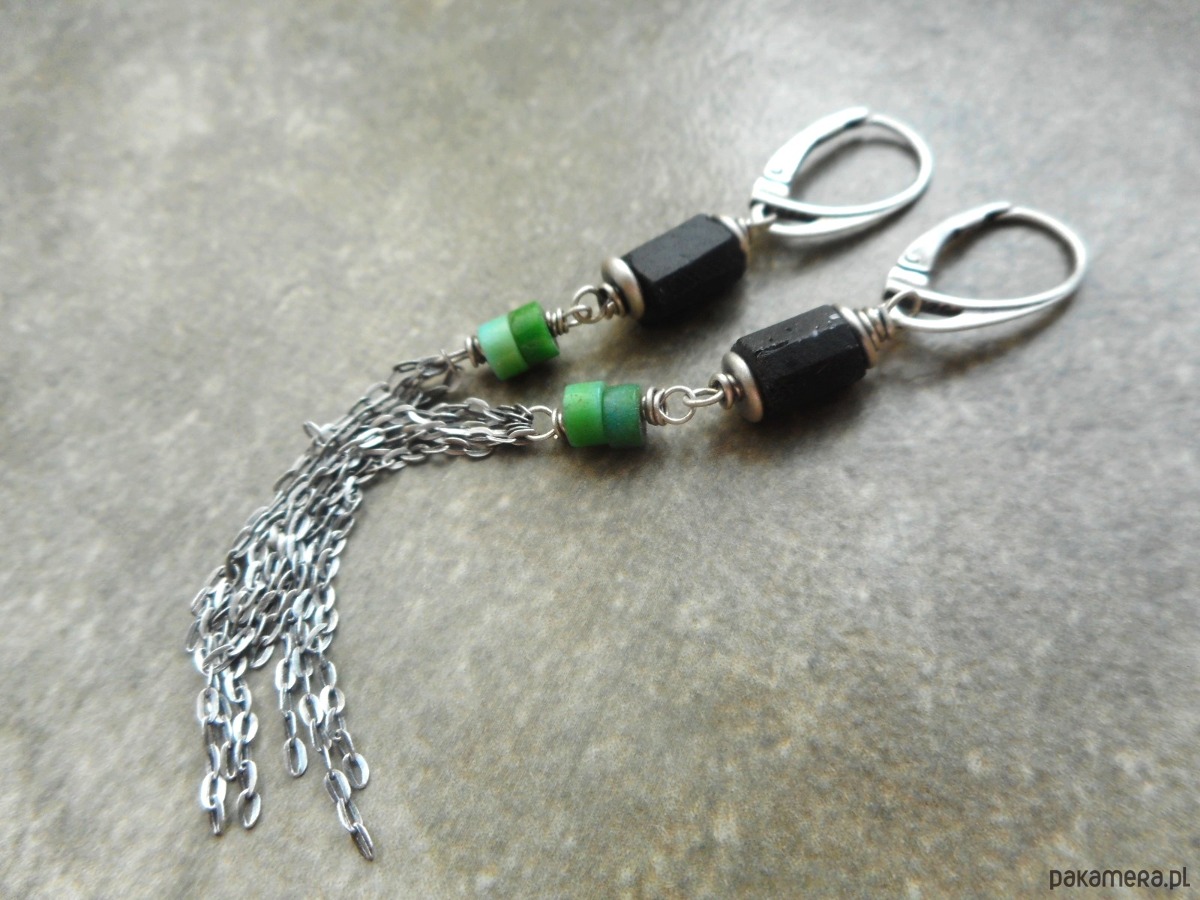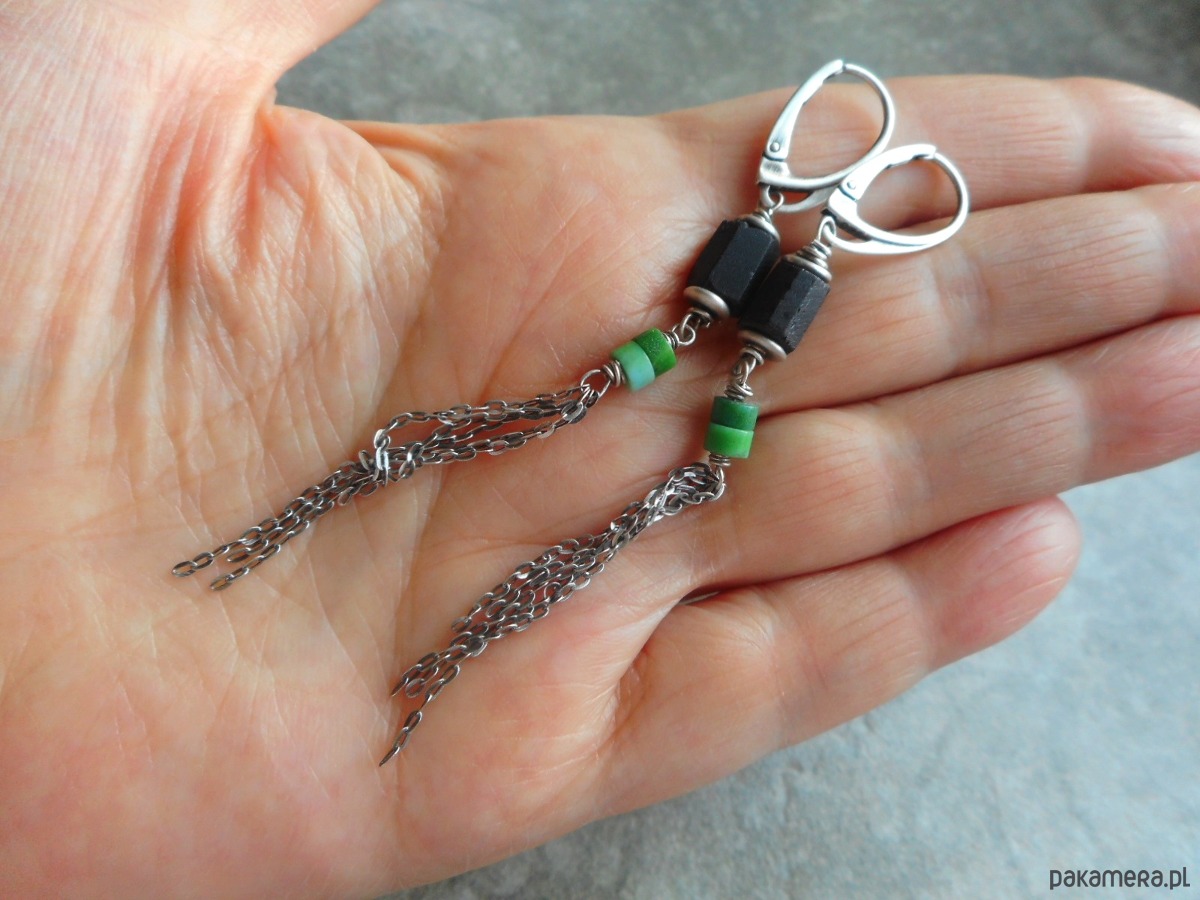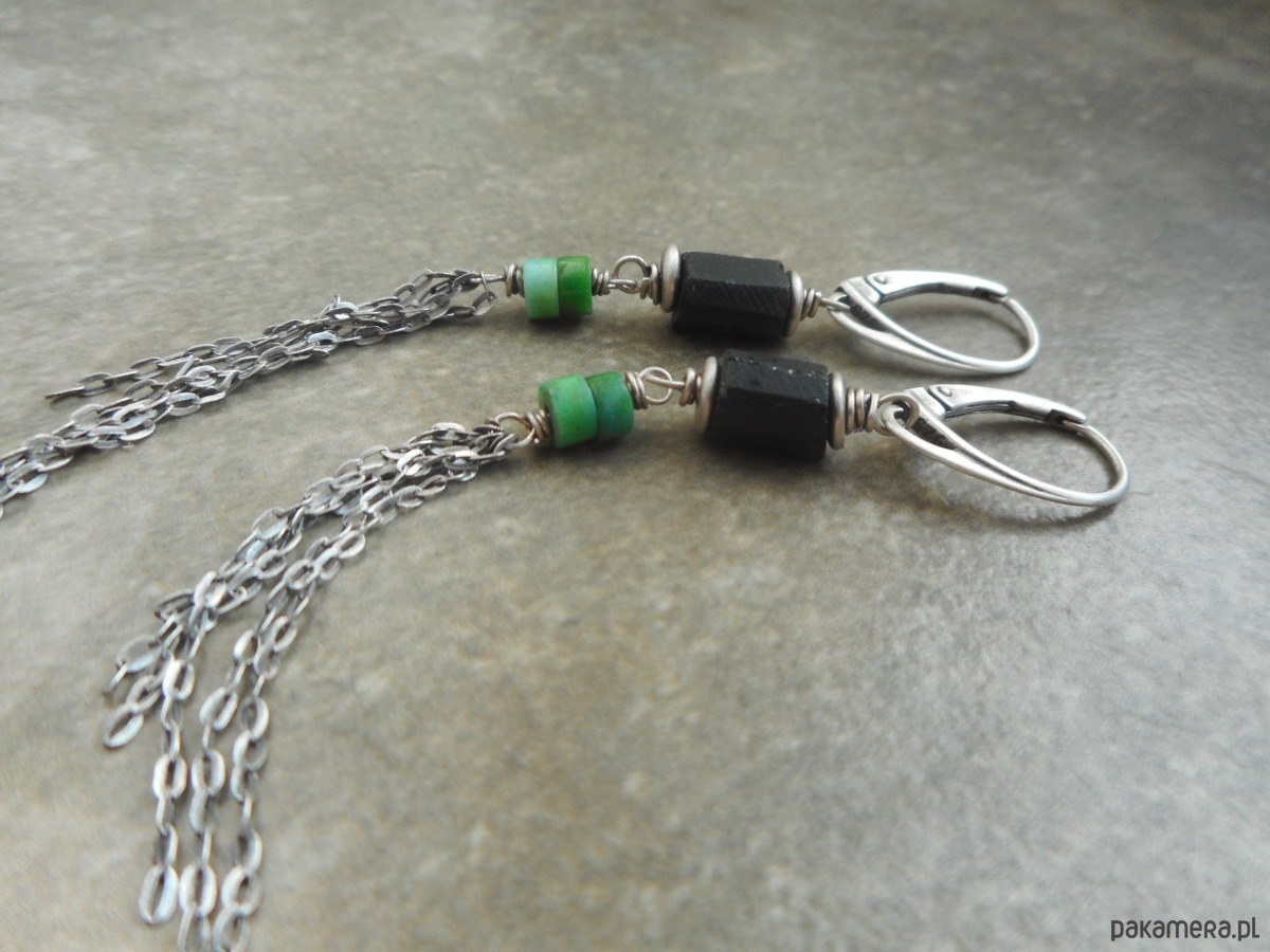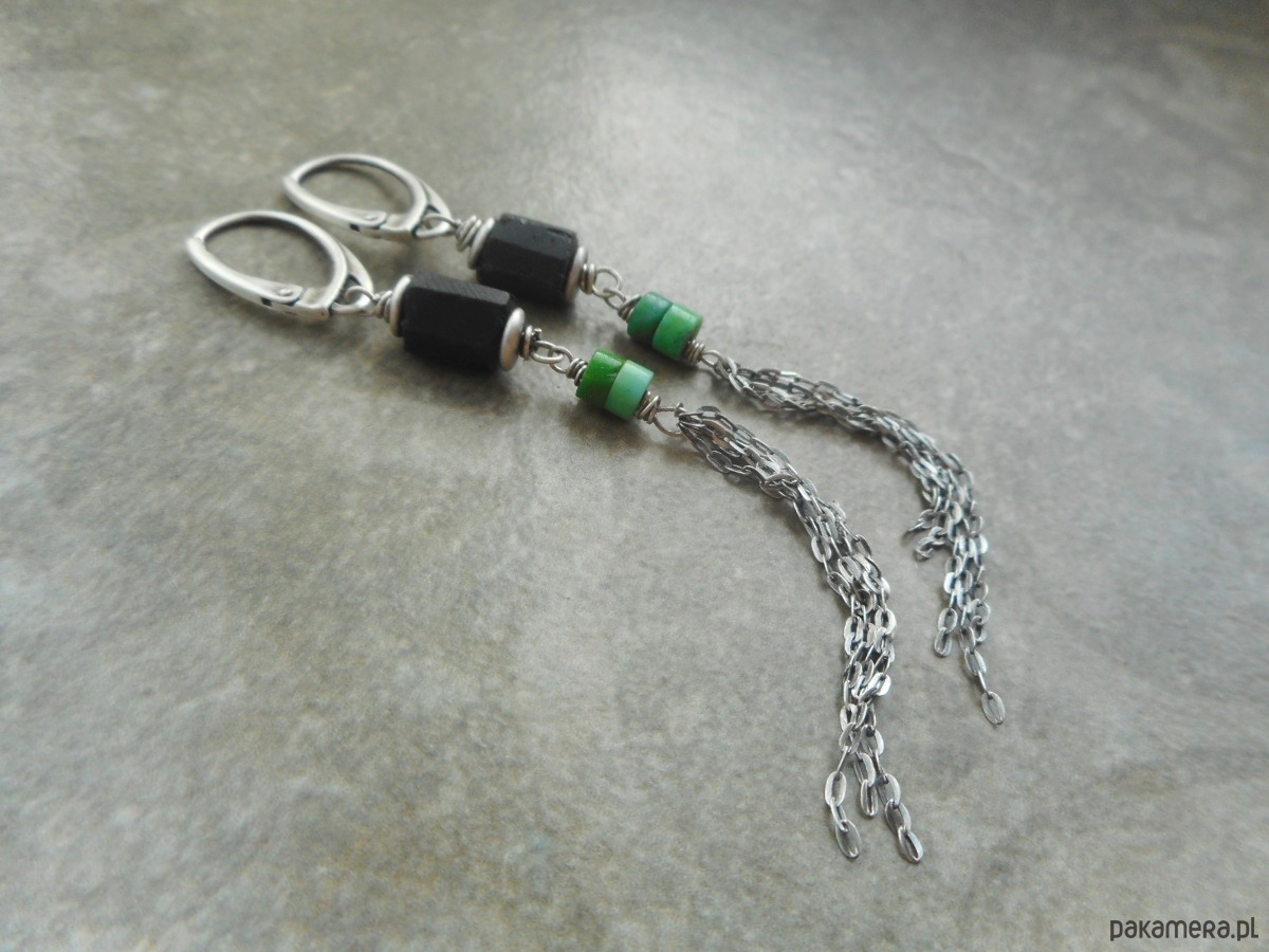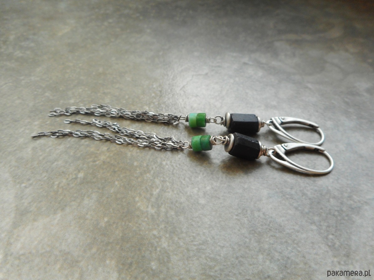 Wyjątkowe kolczyki z kamieni naturalnych i szlachetnego srebra; smukłe, nie obciążające ucha, o surowym charakterze.