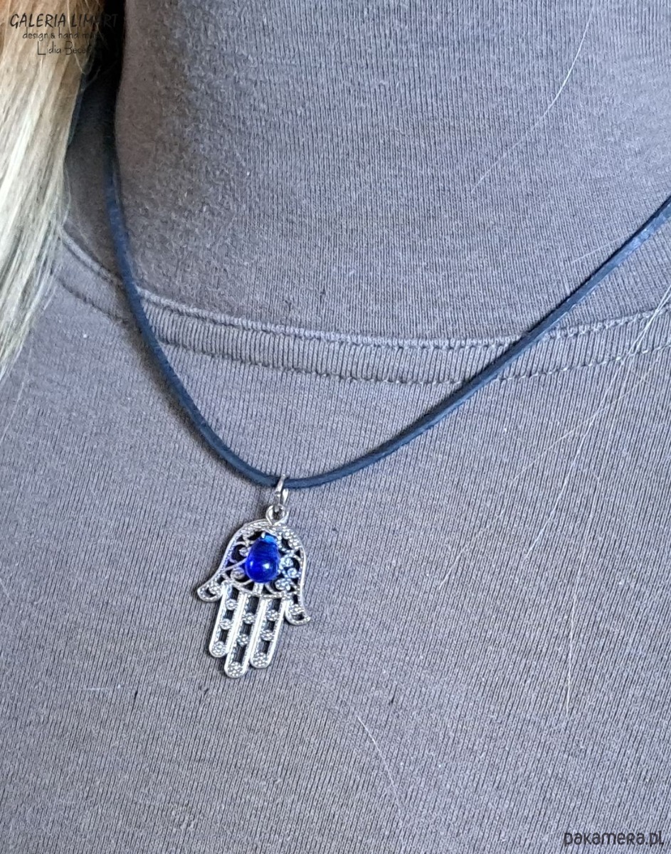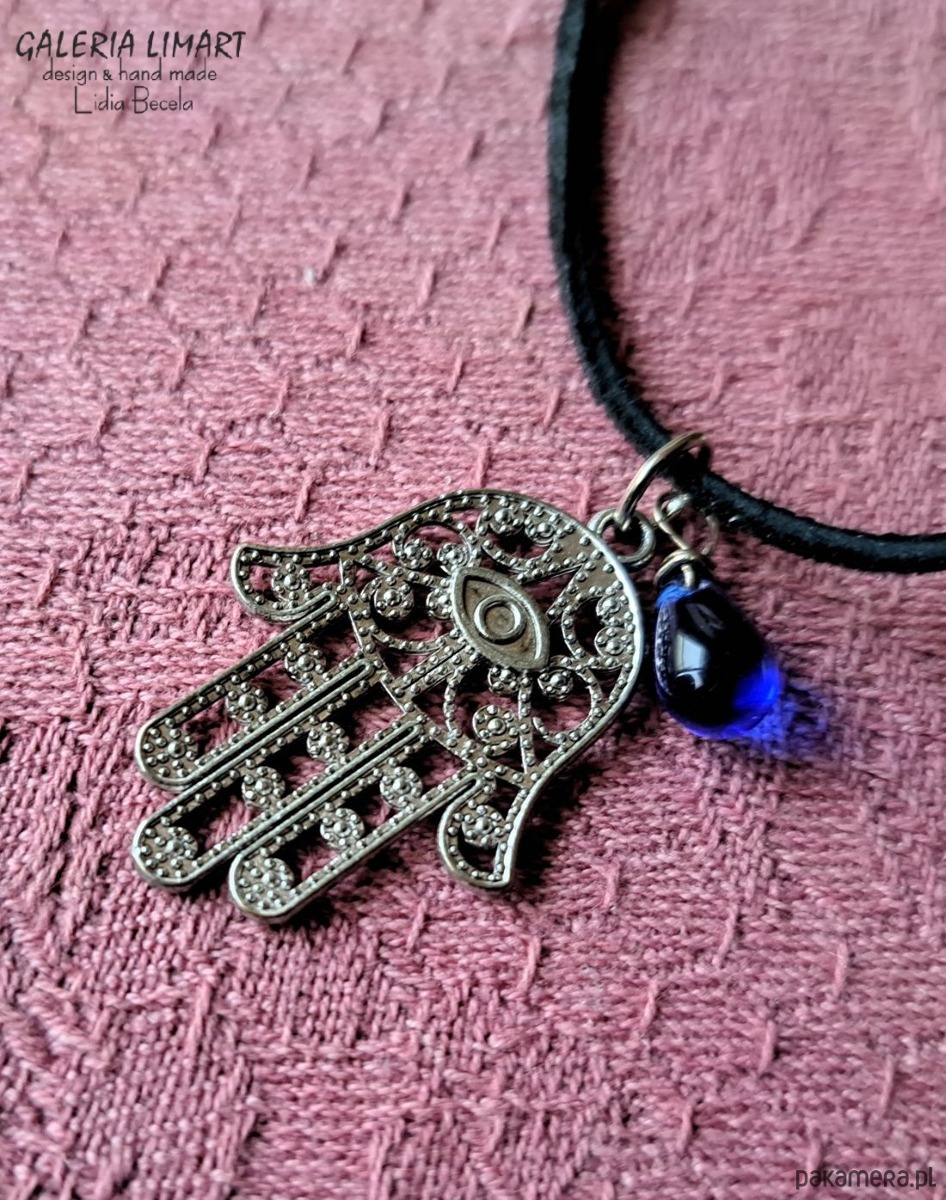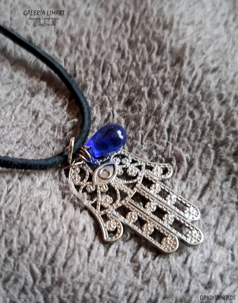 Z hamsą chroniącą od zła Uroczy wisiorek ręka Fatimy i kobaltowa kropelka