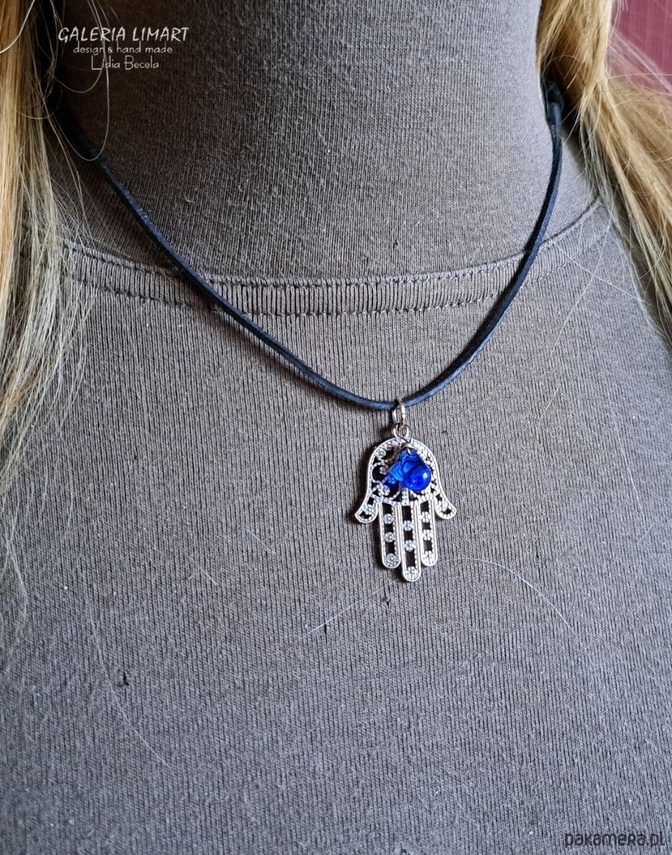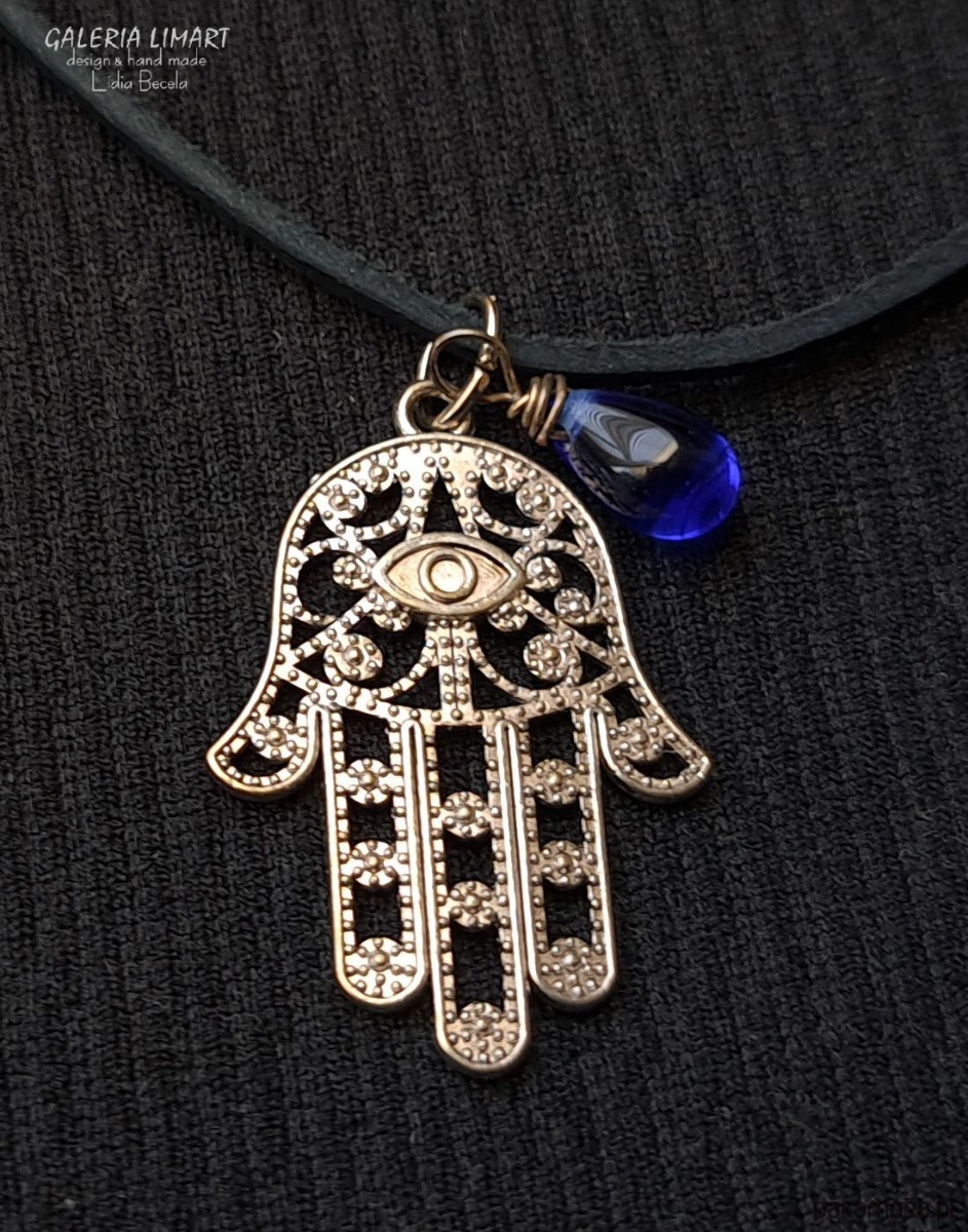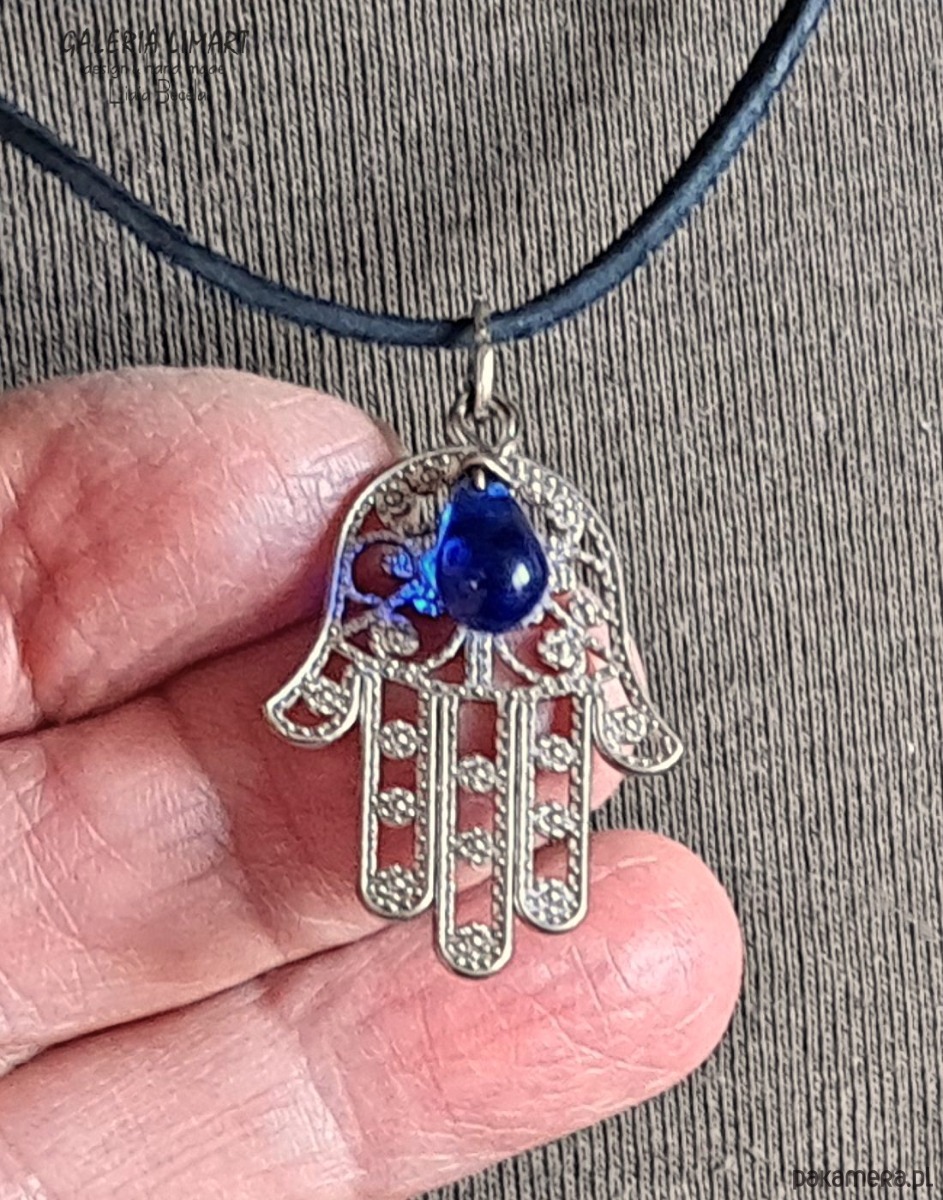 wisiorek, talizman z piękną w swej formie podwieszoną hamsą.