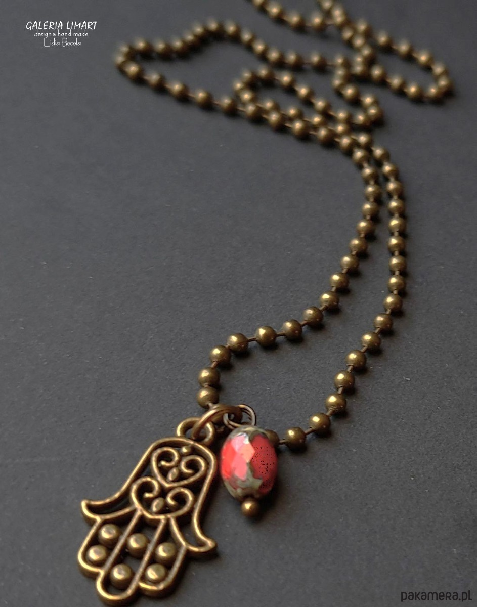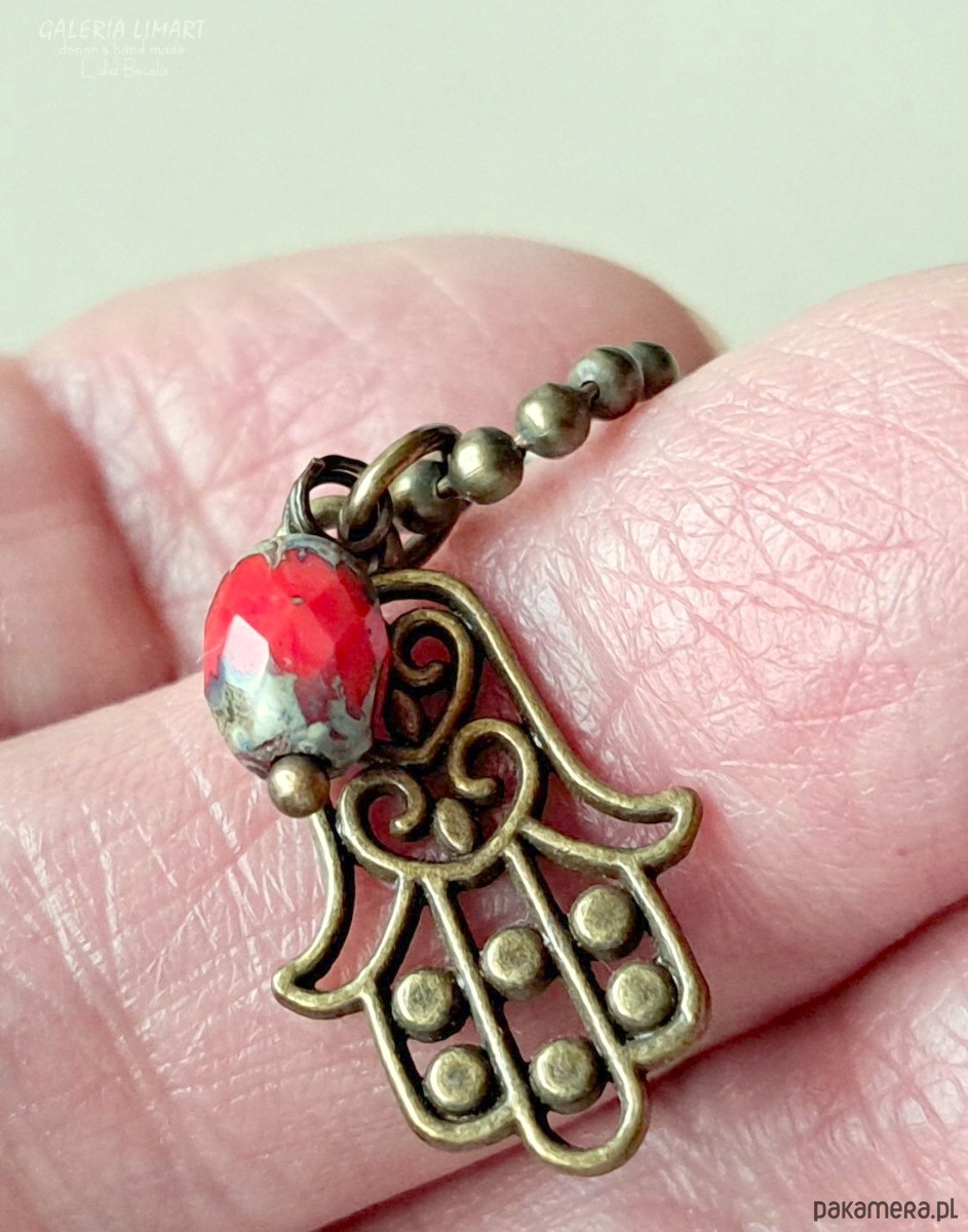Hamsa w kolorze starego złota z mosiądzu została dodatkowo ozdobiona czerwonym kryształkiem z czeskiego szkła.
