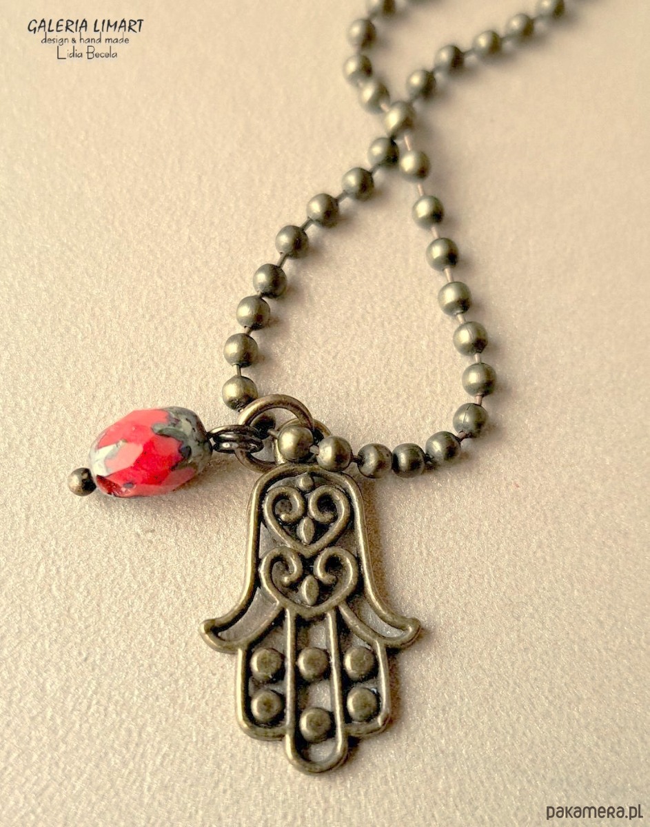 wisiorek, talizman z piękną w swej formie podwieszoną hamsą.