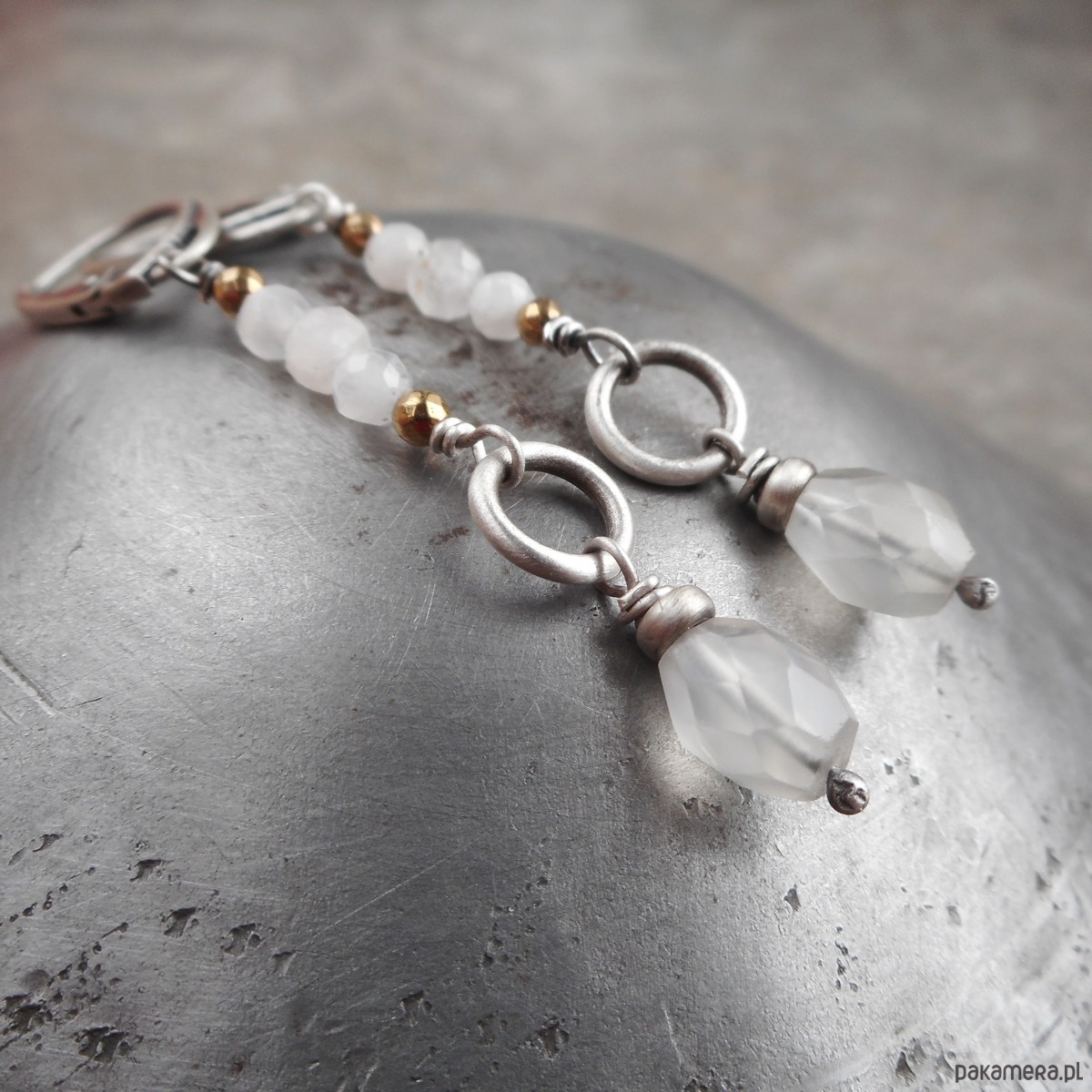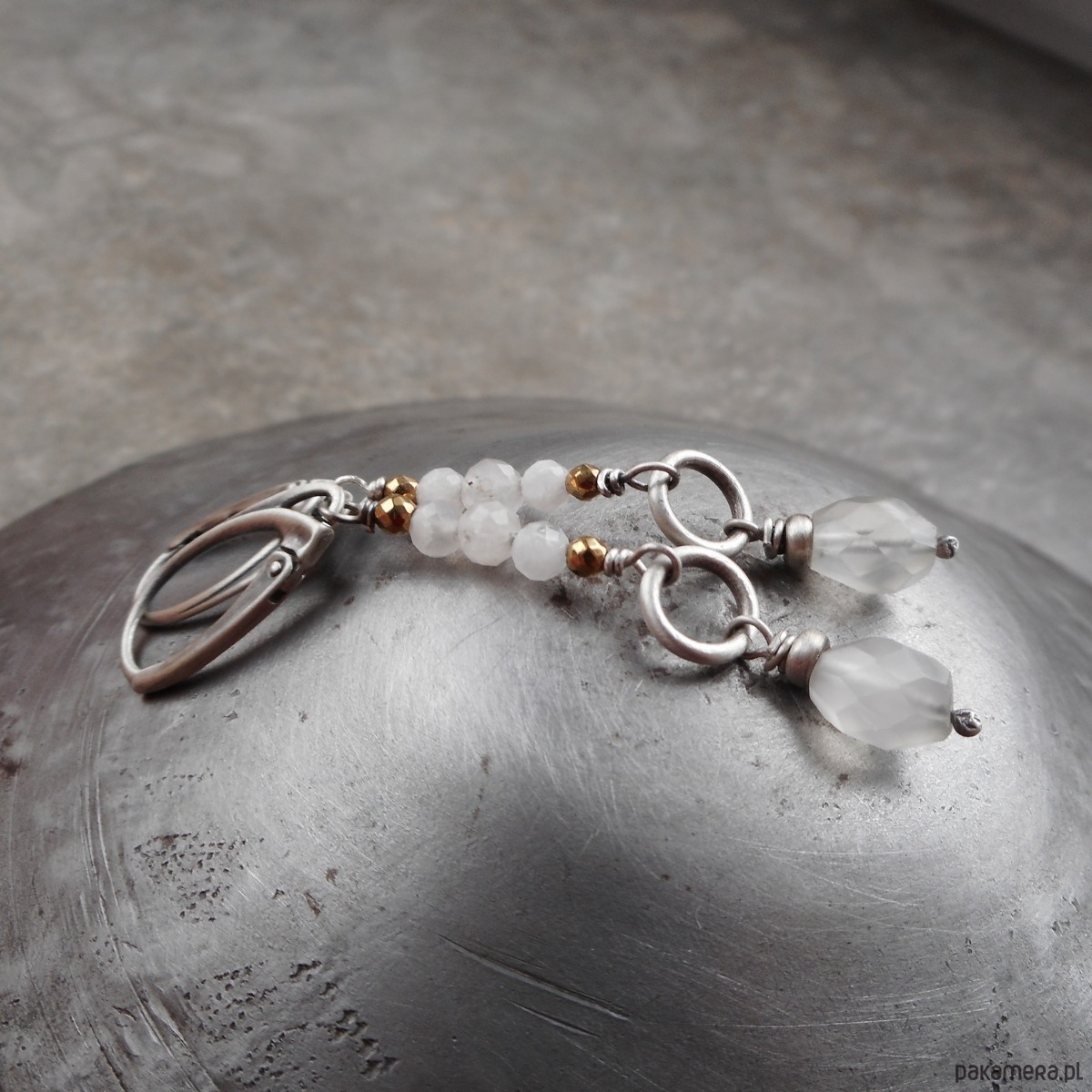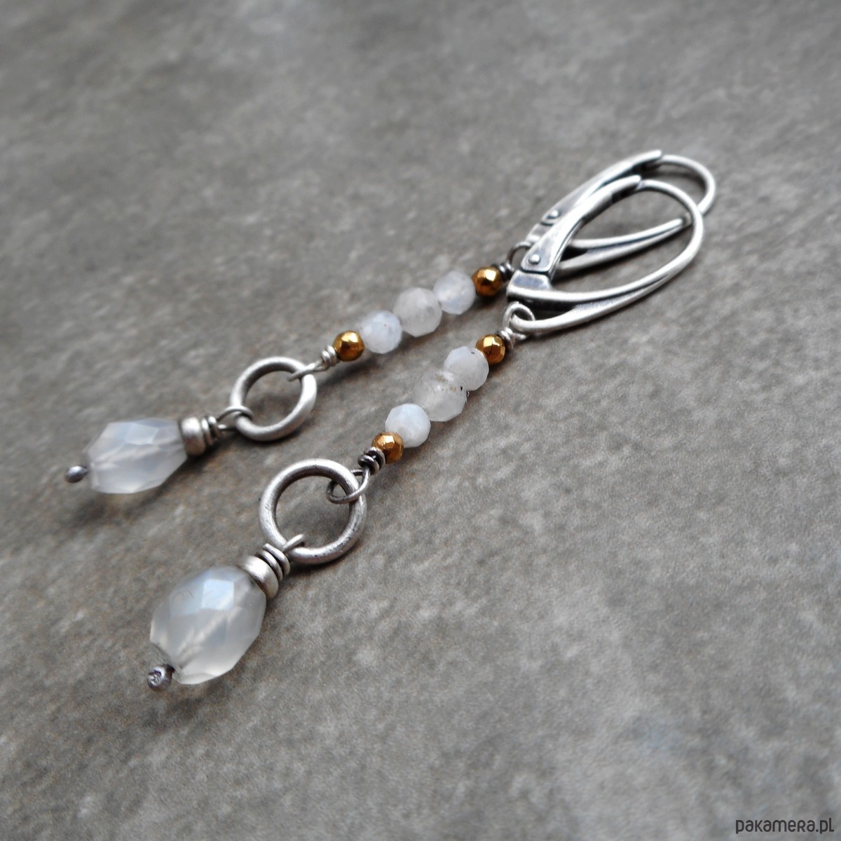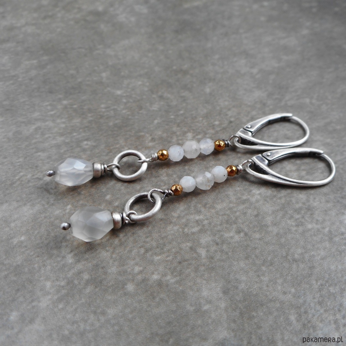 Stylowe kolczyki z kamieni naturalnych i szlachetnego srebra; wygodne, nie obciążające ucha, połączenie srebra i fasetowanych kamieni księżycowych.
