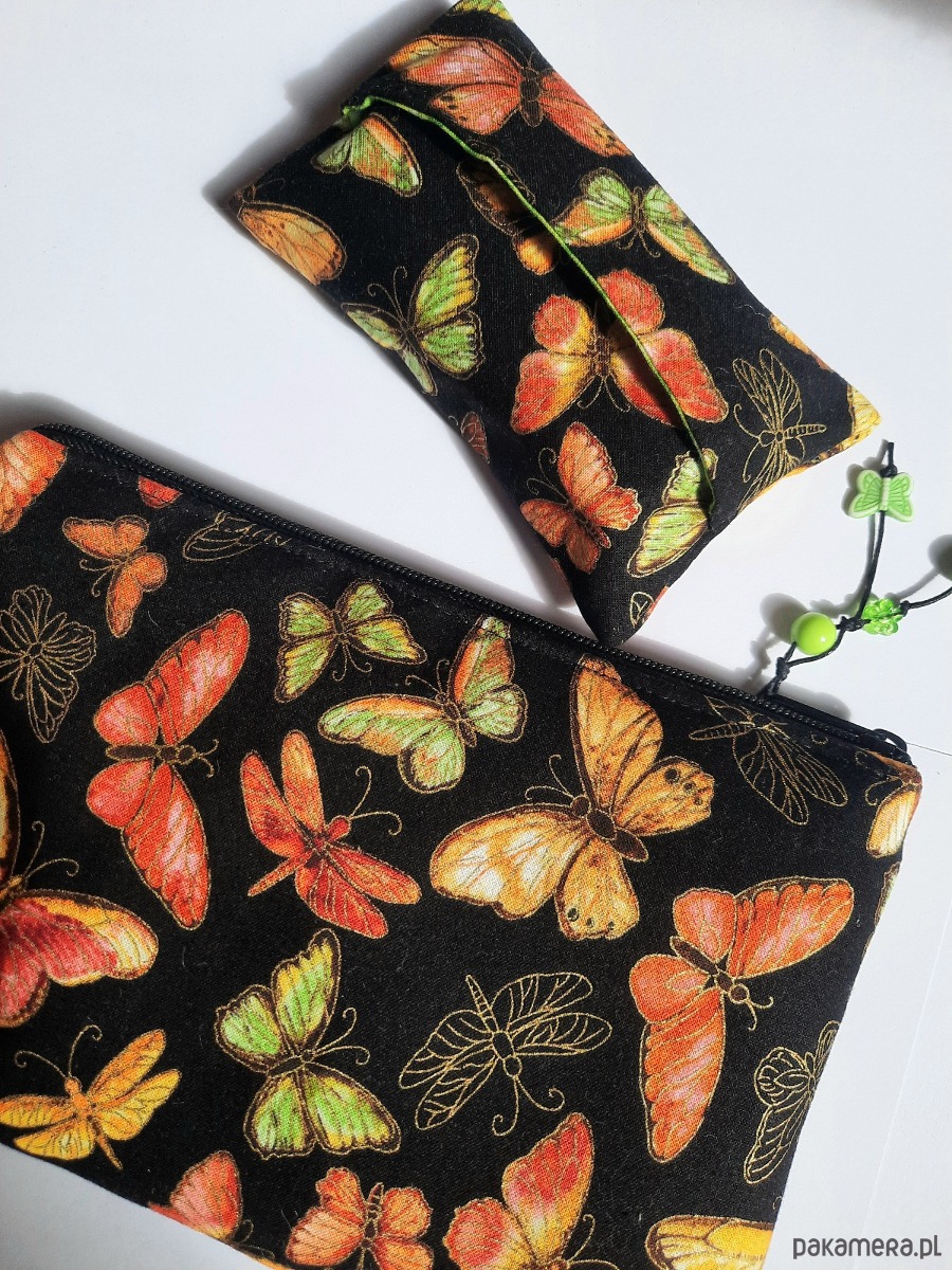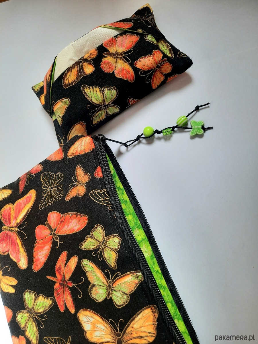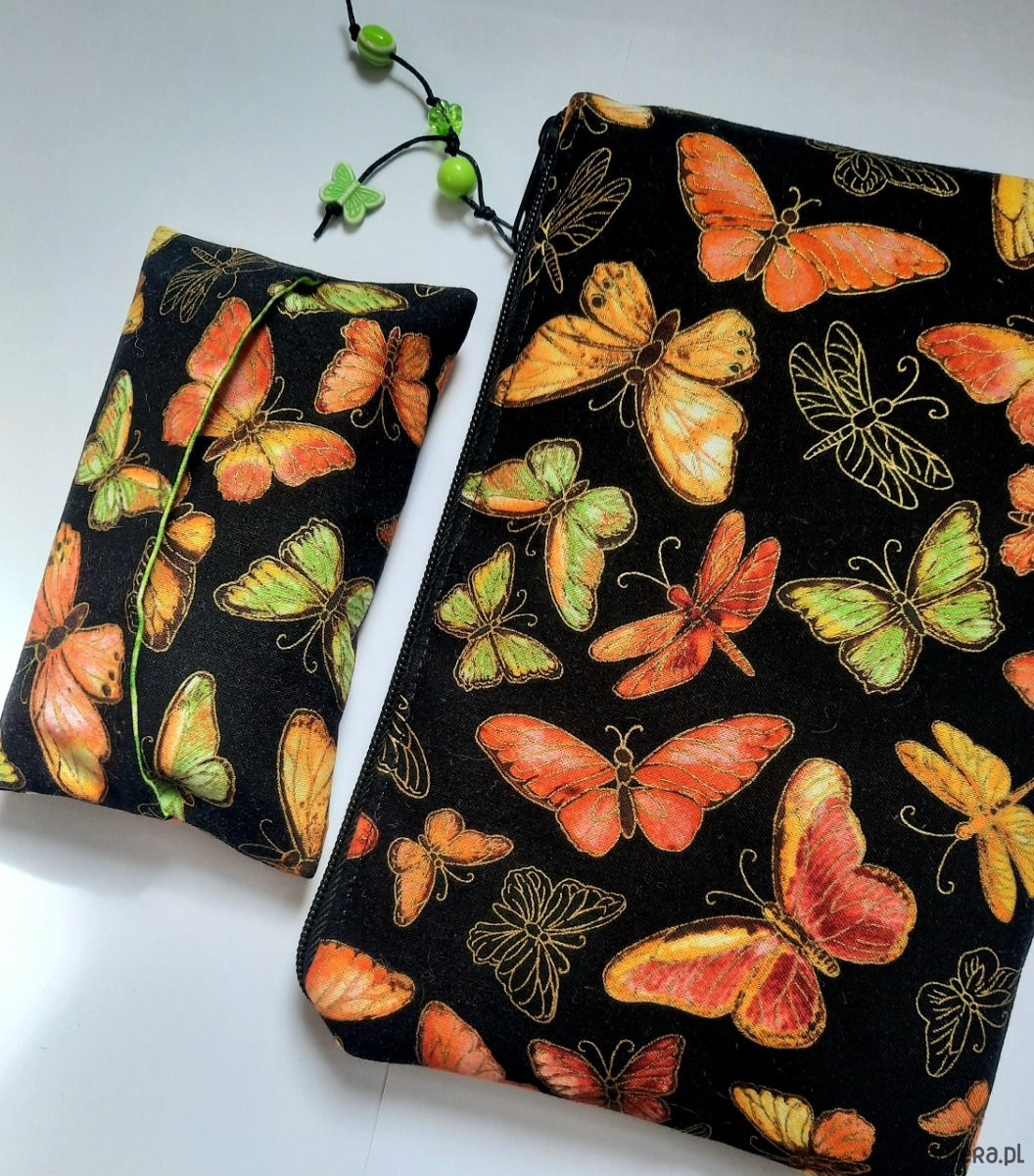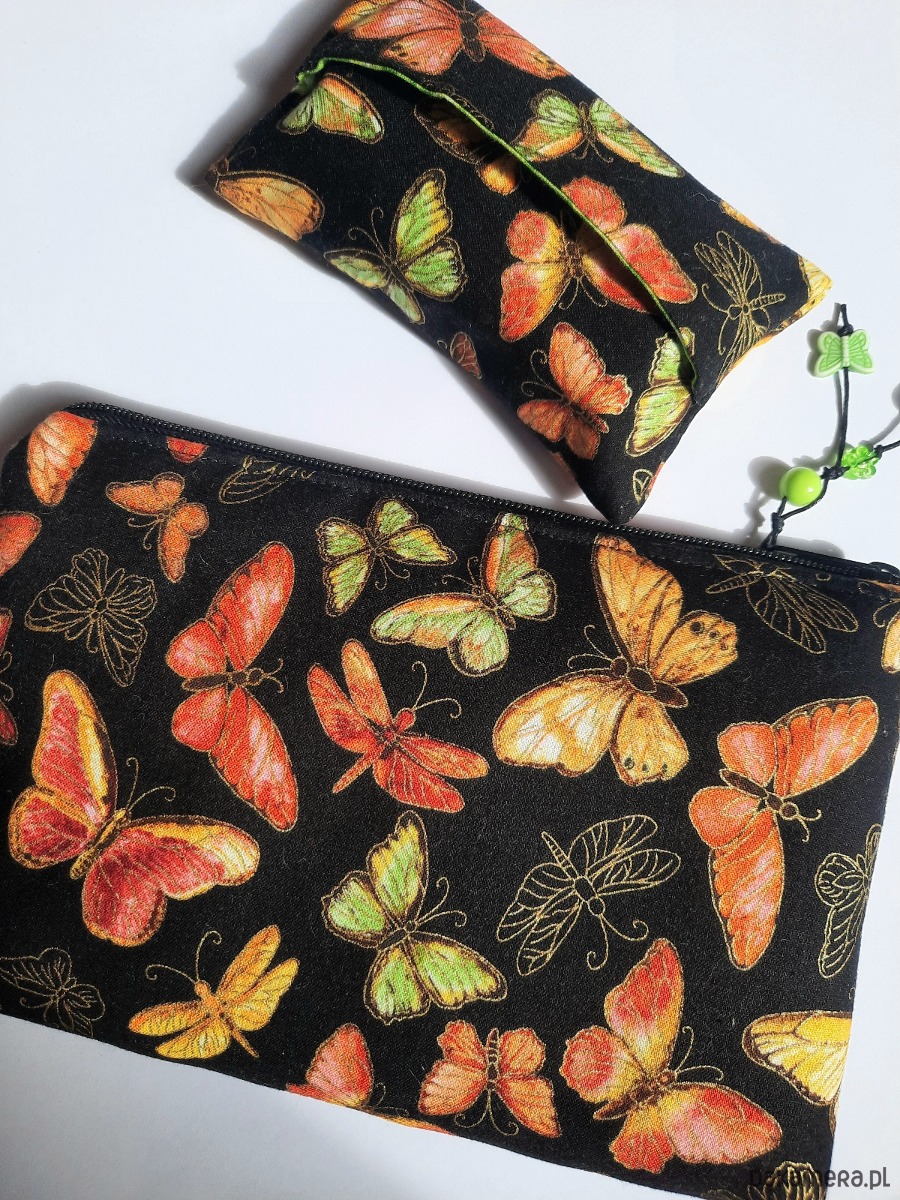 Komplet skladajacy się z kosmetyczki i etui na chusteczki. Wykonany jest z amerykańskiej bawełny najlepszej jakości. Kontury motylków złocone.