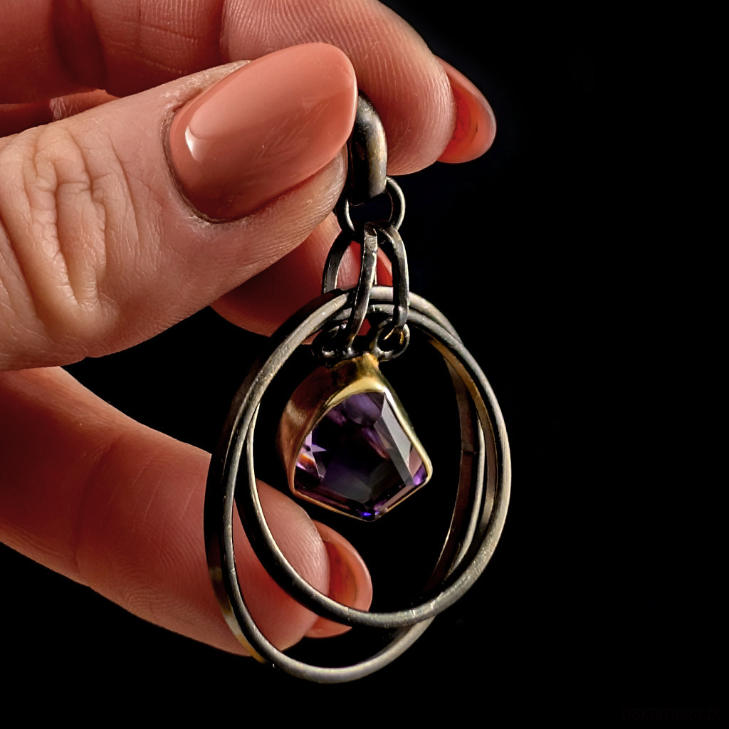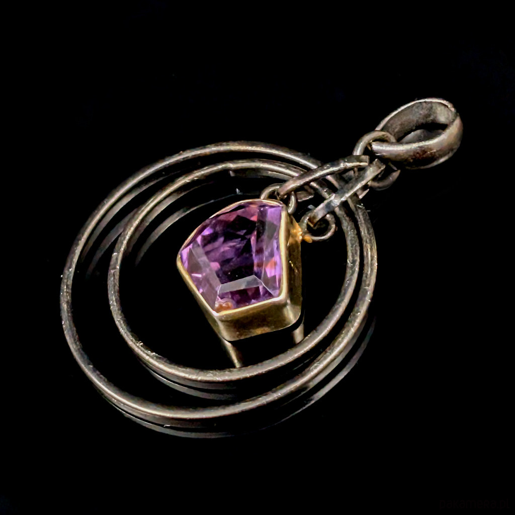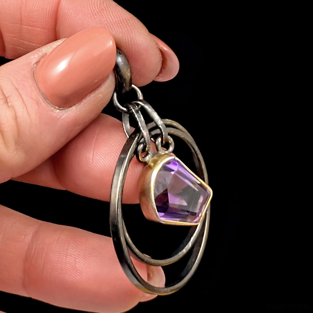 Oryginalny wisior wykonany z oksydowanego srebra próby 925 oraz przepięknego kryształu ametystu o precyzyjnym szlifie. Srebro w oprawie kamienia złocone, delikatne powłoki, które z czasem mogą się ścierać. Wymiary oprawy kamienia 13 x 12 mm. rednica największego kola 33 mm. Waga 10 g Wisior zostanie wysłany w ozdobnym pudełeczku. Wykonany przez dostawcę kamieni.