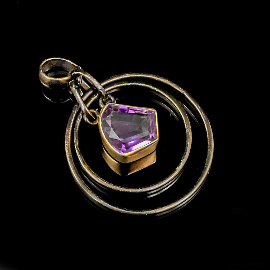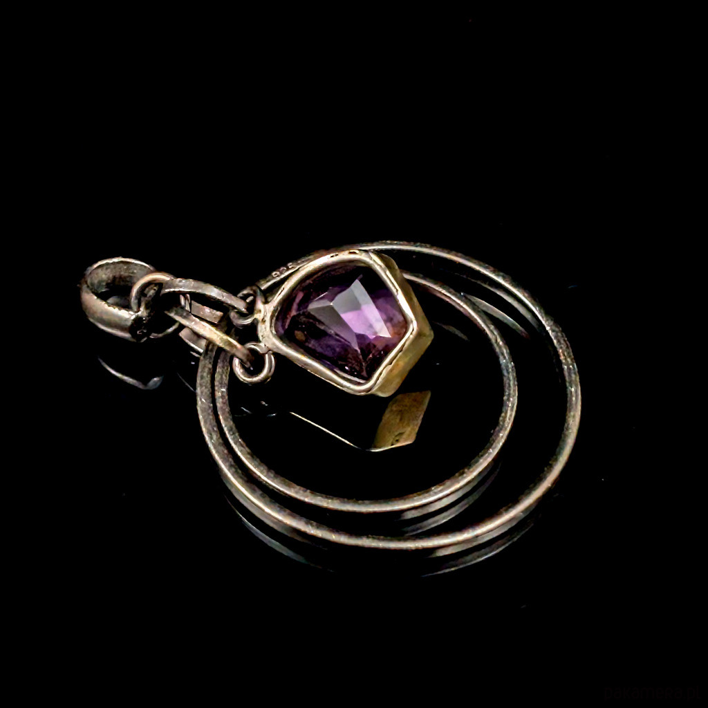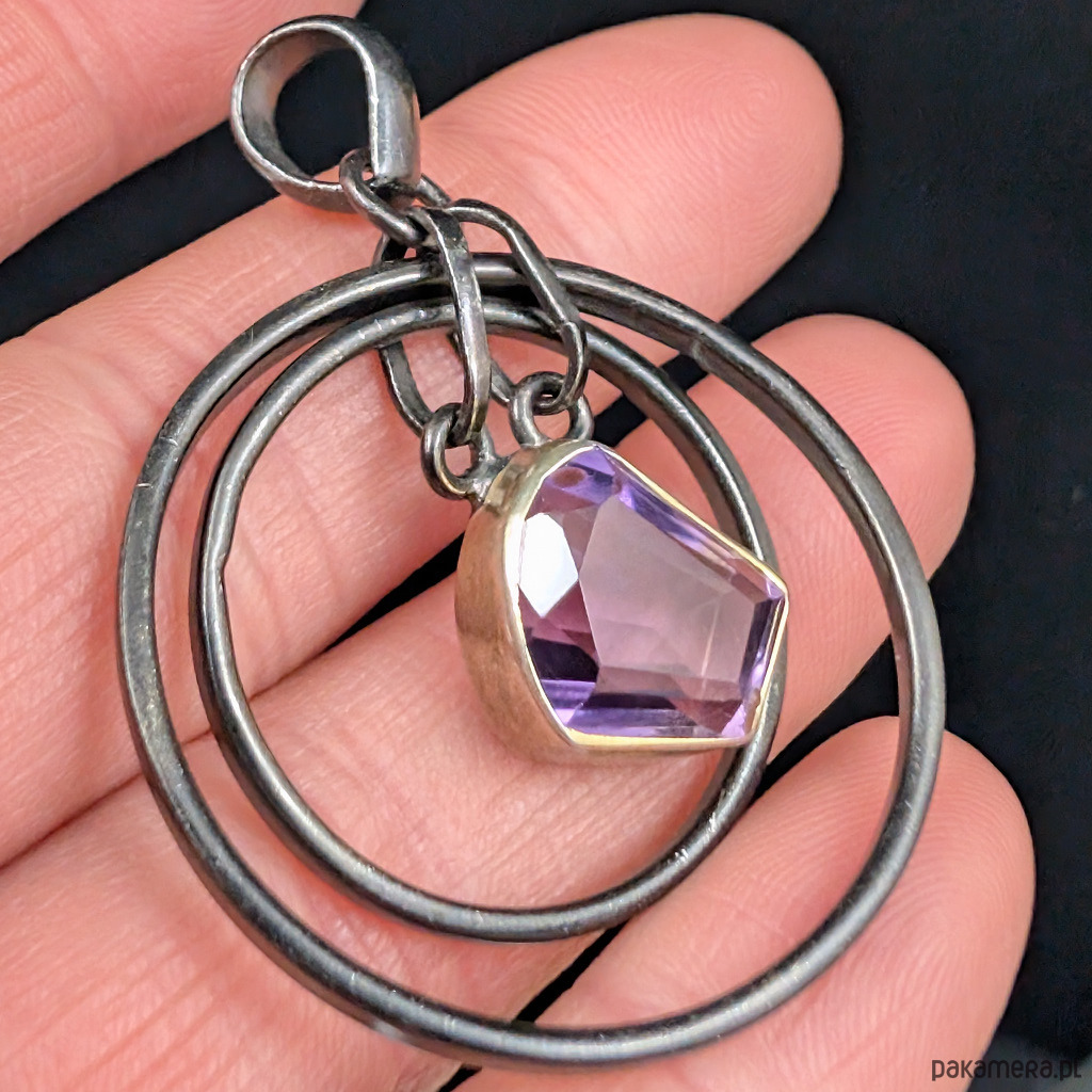 Oryginalny wisior wykonany z oksydowanego srebra próby 925 oraz przepięknego kryształu ametystu o precyzyjnym szlifie. Srebro w oprawie kamienia złocone, delikatne powłoki, które z czasem mogą się ścierać. Wymiary oprawy kamienia 13 x 12 mm. rednica największego kola 33 mm. Waga 10 g Wisior zostanie wysłany w ozdobnym pudełeczku. Wykonany przez dostawcę kamieni.