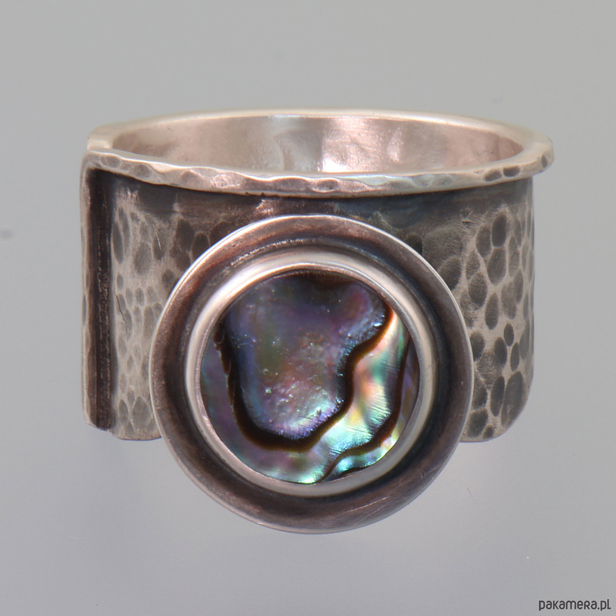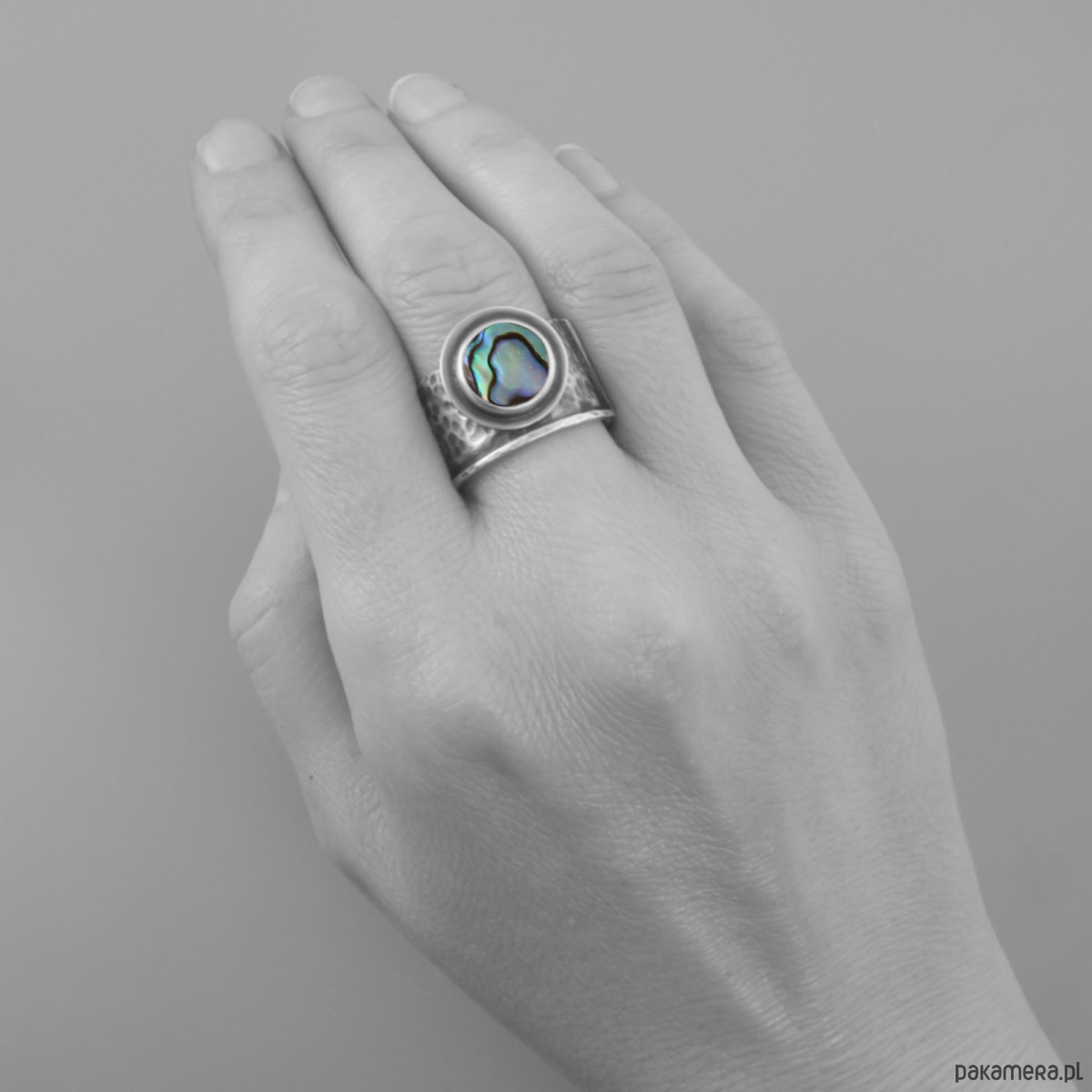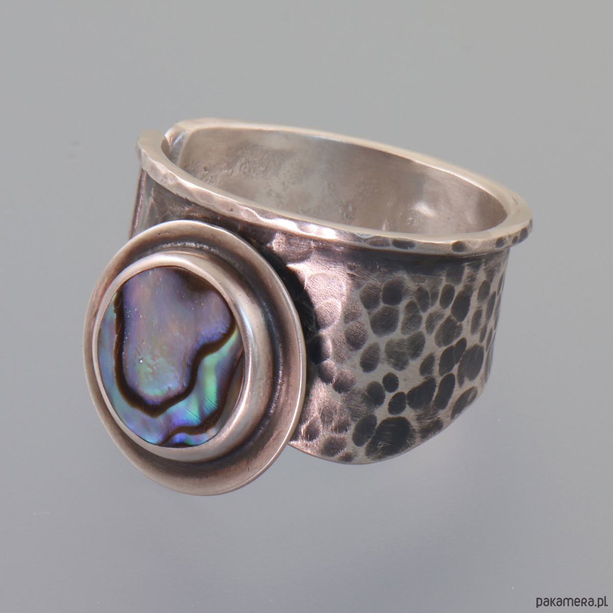 Ręcznie wykonany srebrny pierścionek z muszlą paua. Srebro próby 925 - próba wybita na spodzie. Obrączka w najszerszym miejscu: 1,4 cm. Wymiary muszli paua: 1,2 cm. Rozmiar obrączki regulowany w zakresie od 21 (średnica wewnętrzna 19,33 mm) do 24 (średnica wewnętrzna 20,33 mm). Waga pierścionka: 6,1 g.