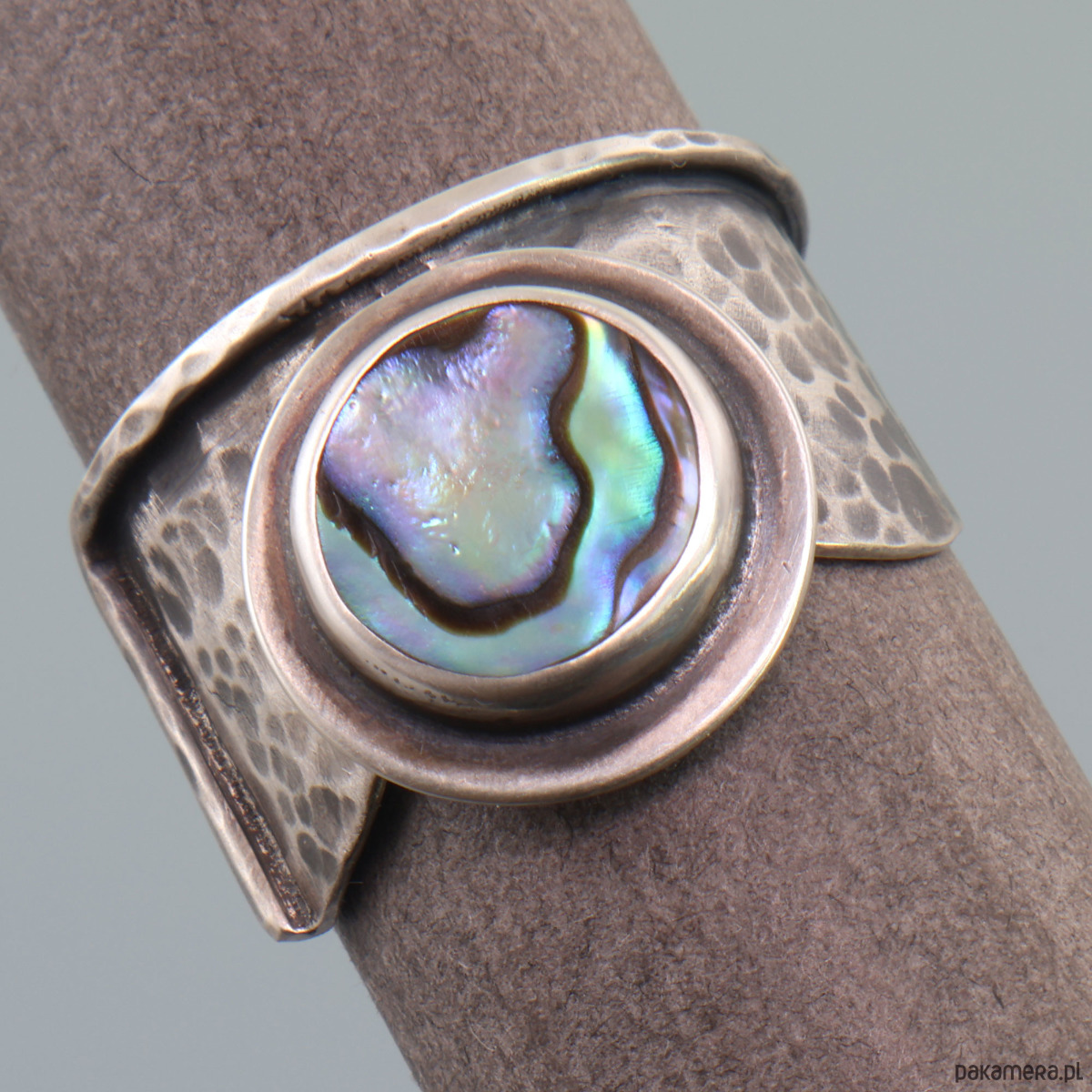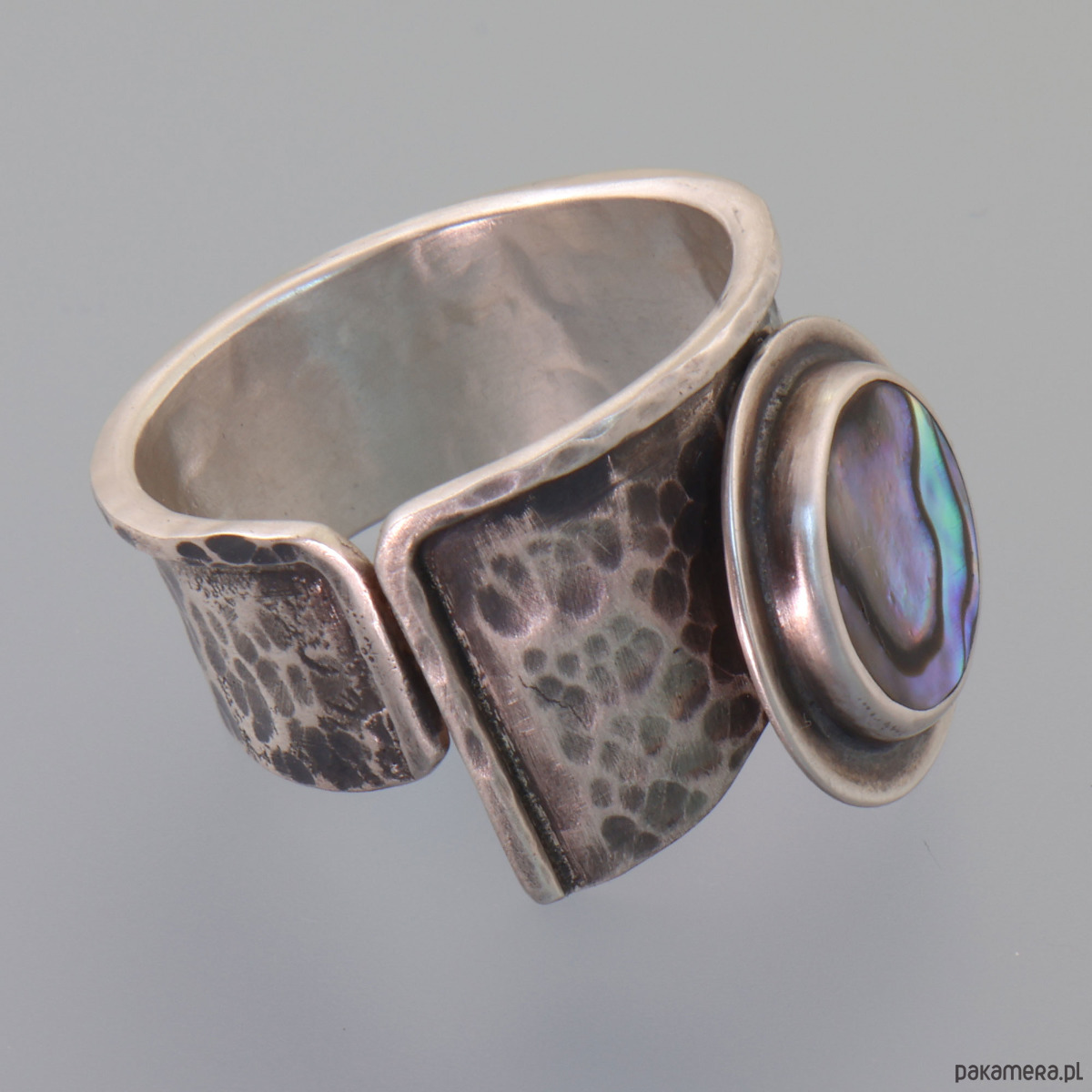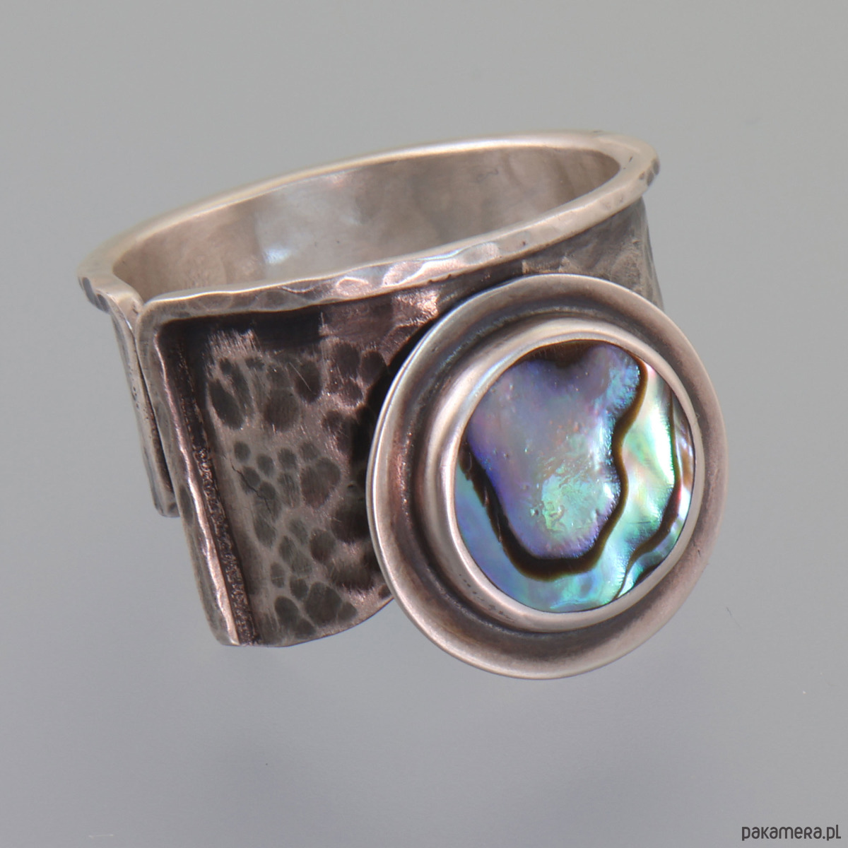 Ręcznie wykonany srebrny pierścionek z muszlą paua. Srebro próby 925 - próba wybita na spodzie. Obrączka w najszerszym miejscu: 1,4 cm. Wymiary muszli paua: 1,2 cm. Rozmiar obrączki regulowany w zakresie od 21 (średnica wewnętrzna 19,33 mm) do 24 (średnica wewnętrzna 20,33 mm). Waga pierścionka: 6,1 g.