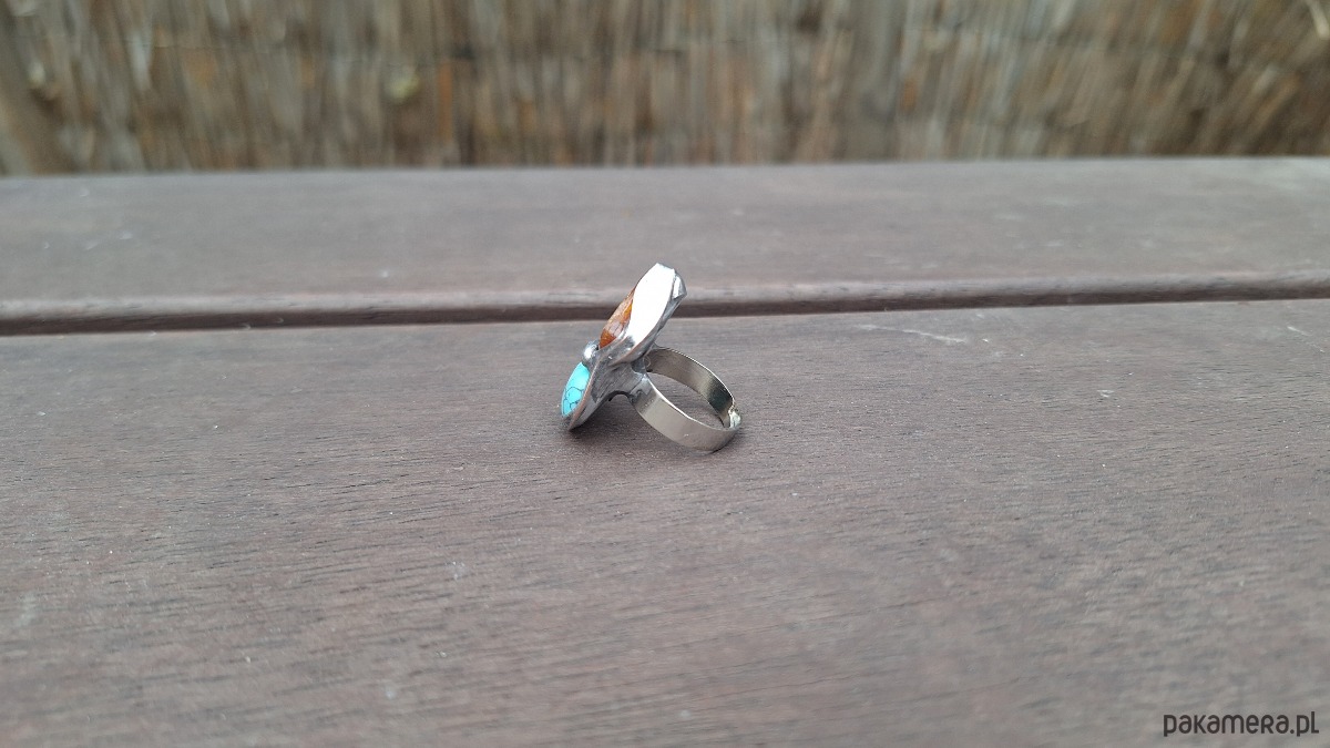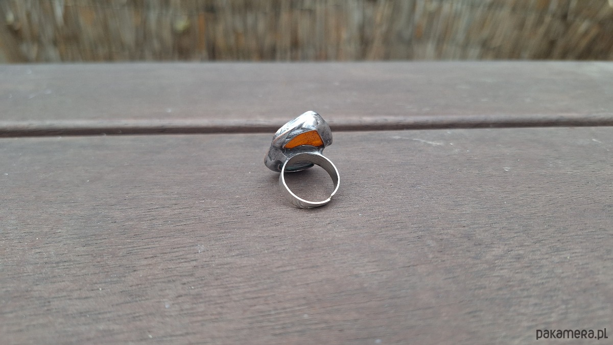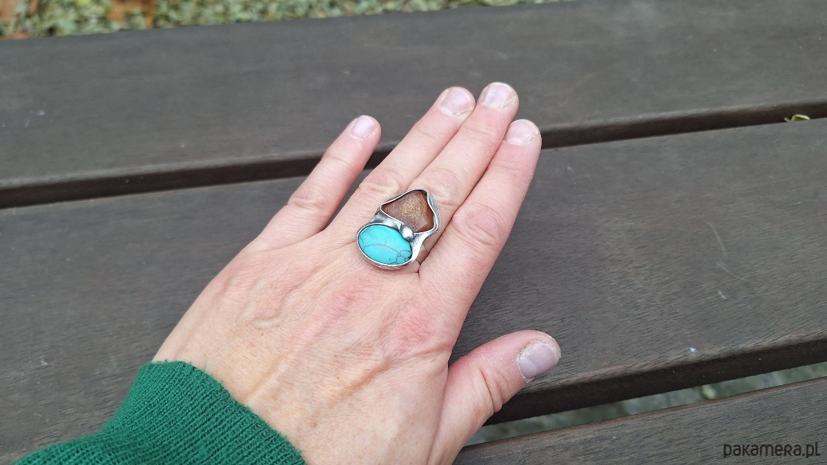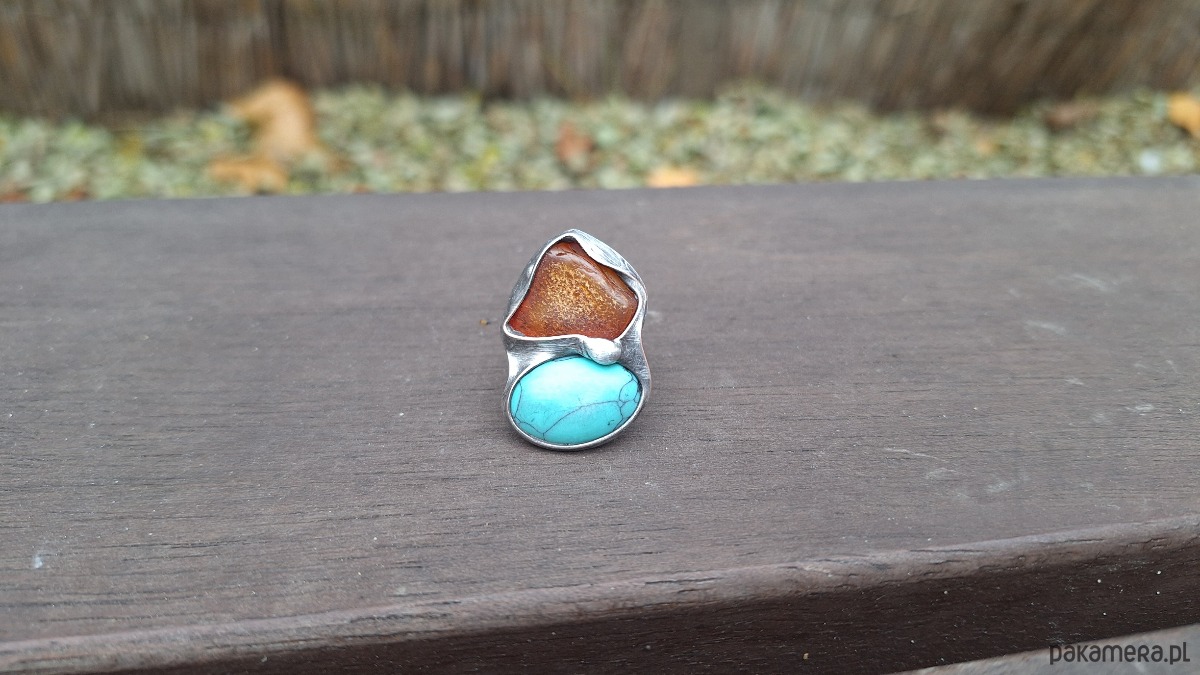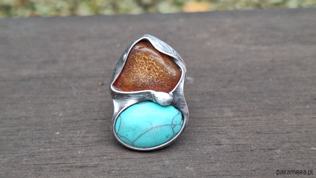 Pierścionek wykonany z miedzi, cyny, howlitu i bursztynu. Wymiary ok. 2.7 na 2 cm. Regulowany. Nie jest ciężki.