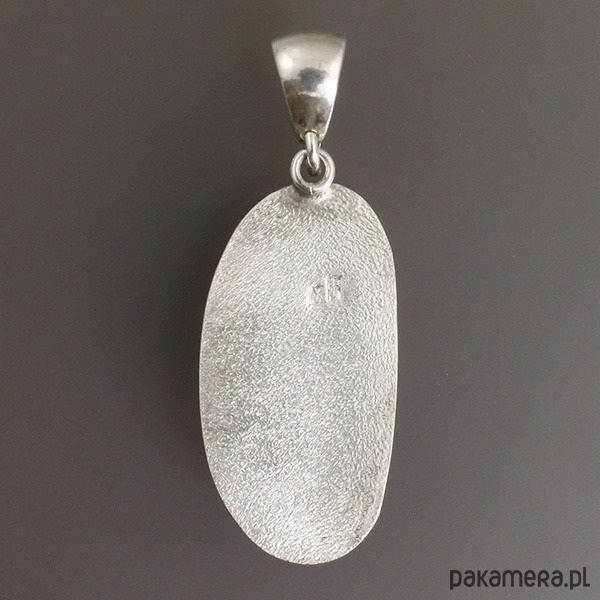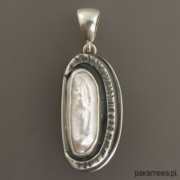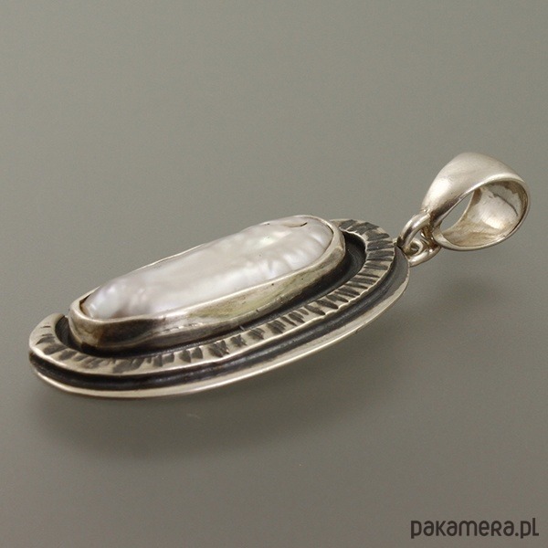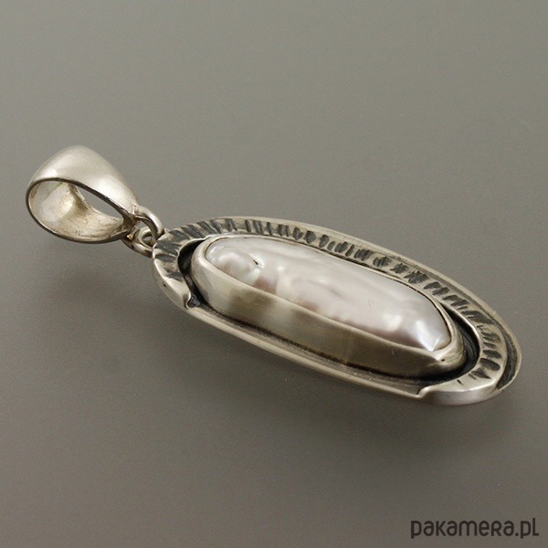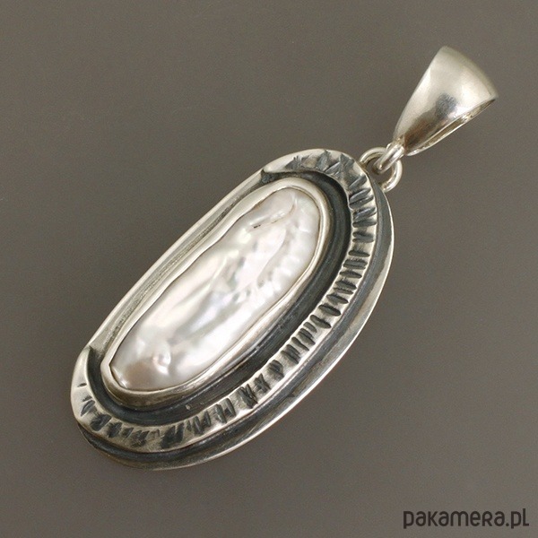 Ręcznie wykonany srebrny wisiorek z perłą. Srebro próby 925 - próba wybita z tyłu. Wymiary wisiorka: 3,4 cm x 1,6 cm; długość wisiorka razem z zawieszką: 4,4 cm. Wymiary wewnętrzne ucha do przełożenia rzemienia, łańcuszka...itp.: 0,7 cm x 0,5 cm. Waga wisiorka: 5,7 g.