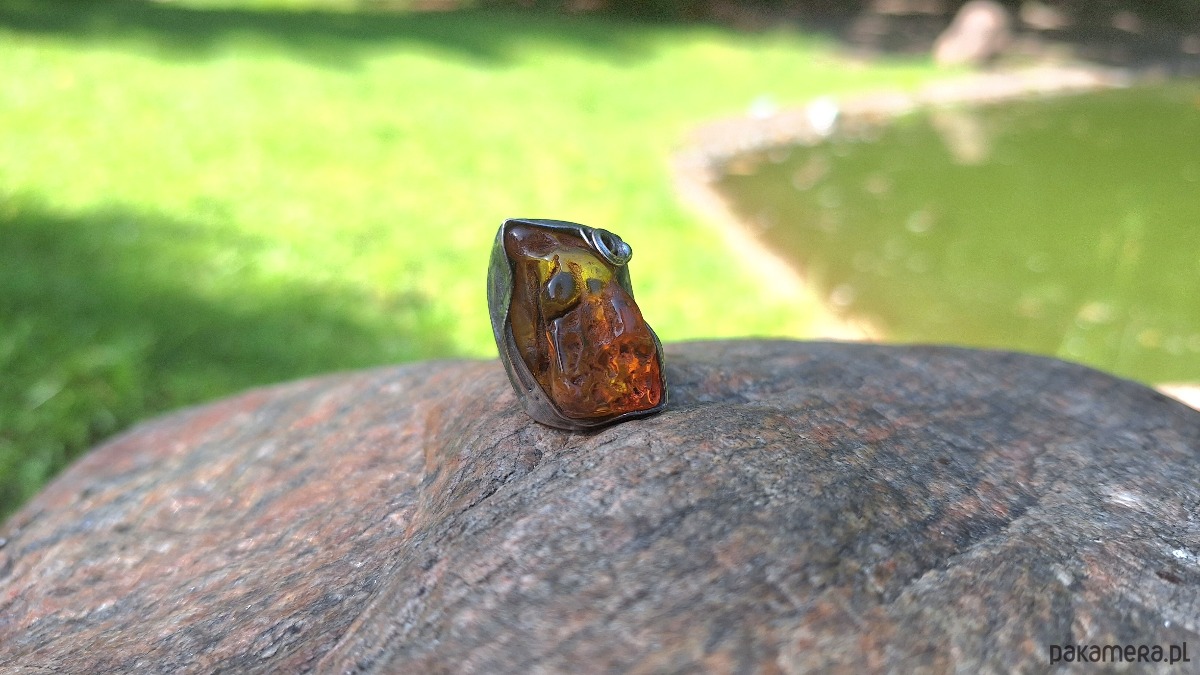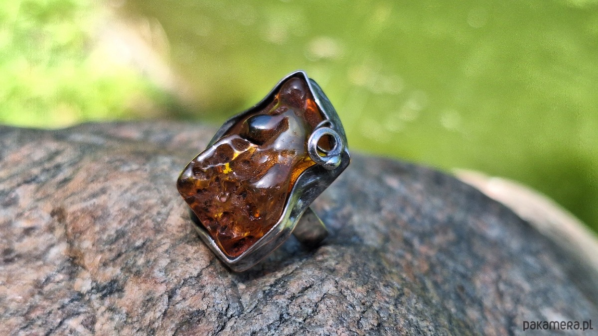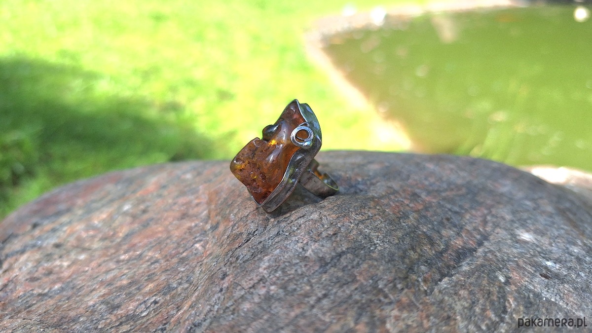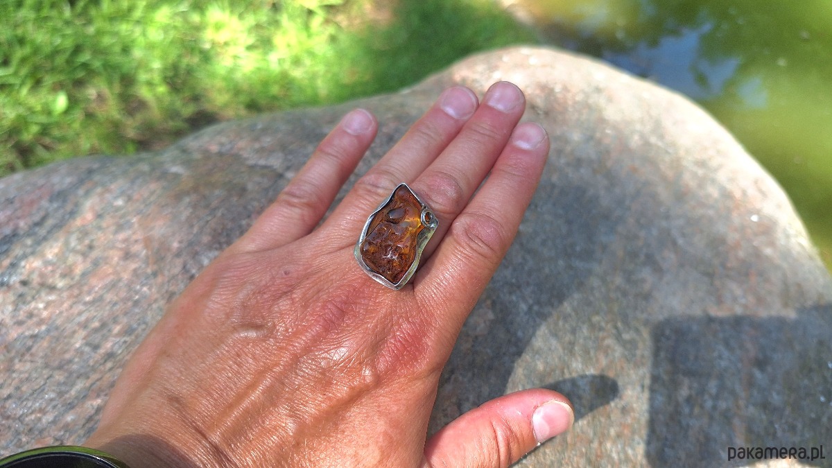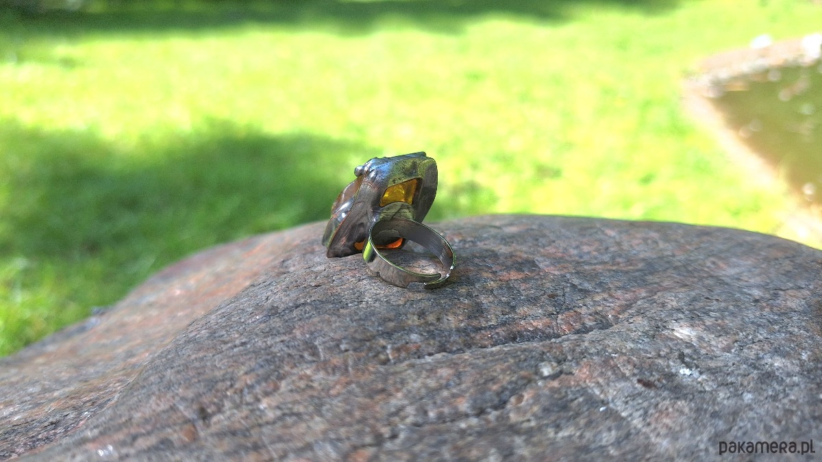 Pierścionek wykonany z miedzi, cyny i bursztynu. Wymiary ok. 2.5 na 2 cm. Regulowany. Nie jest ciężki.