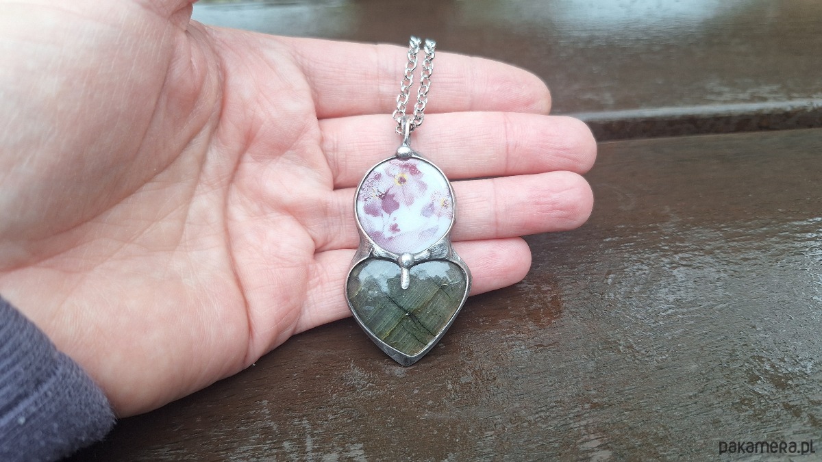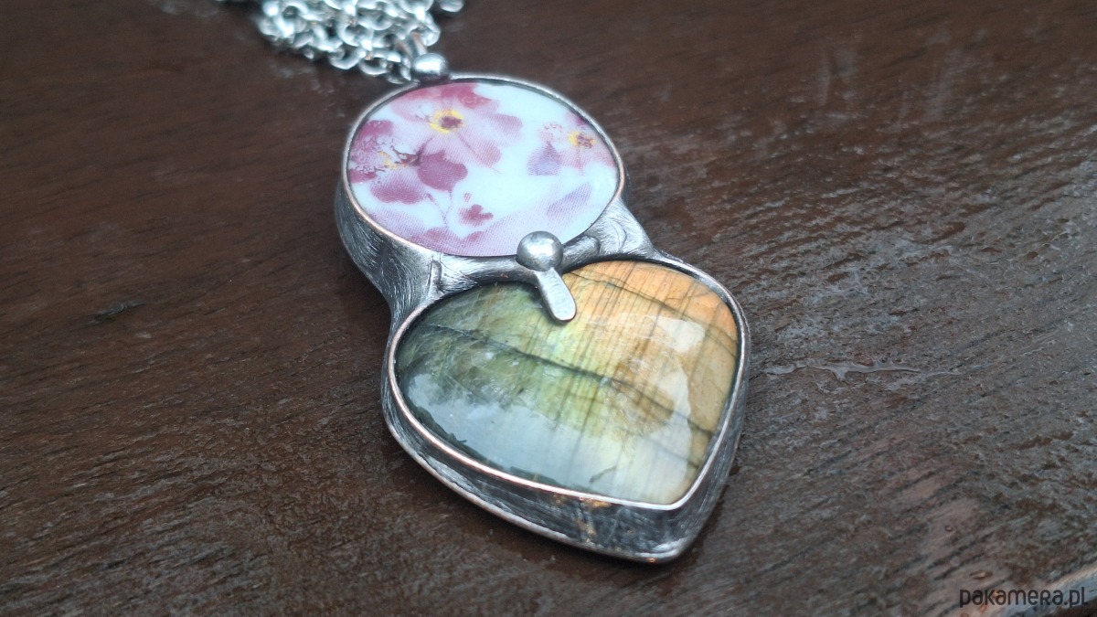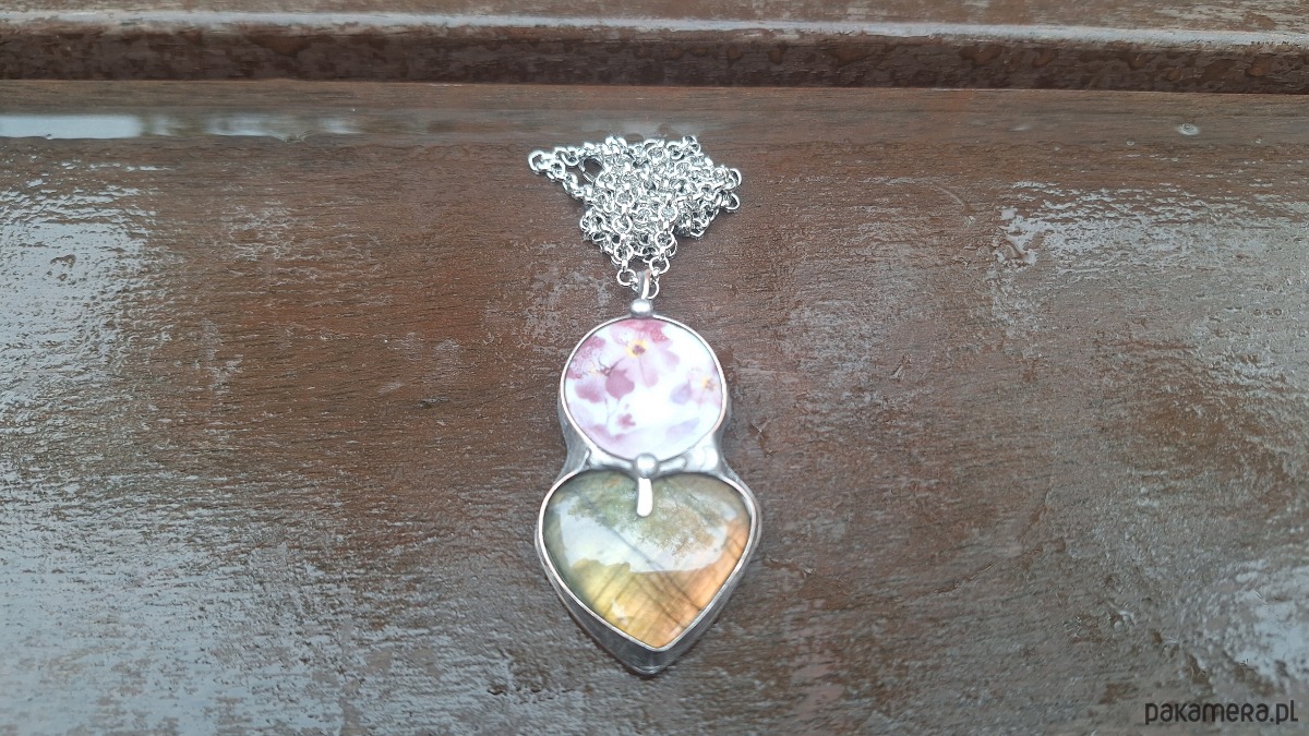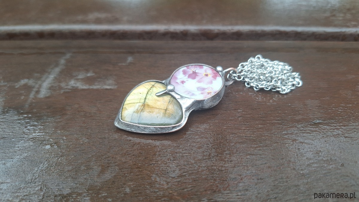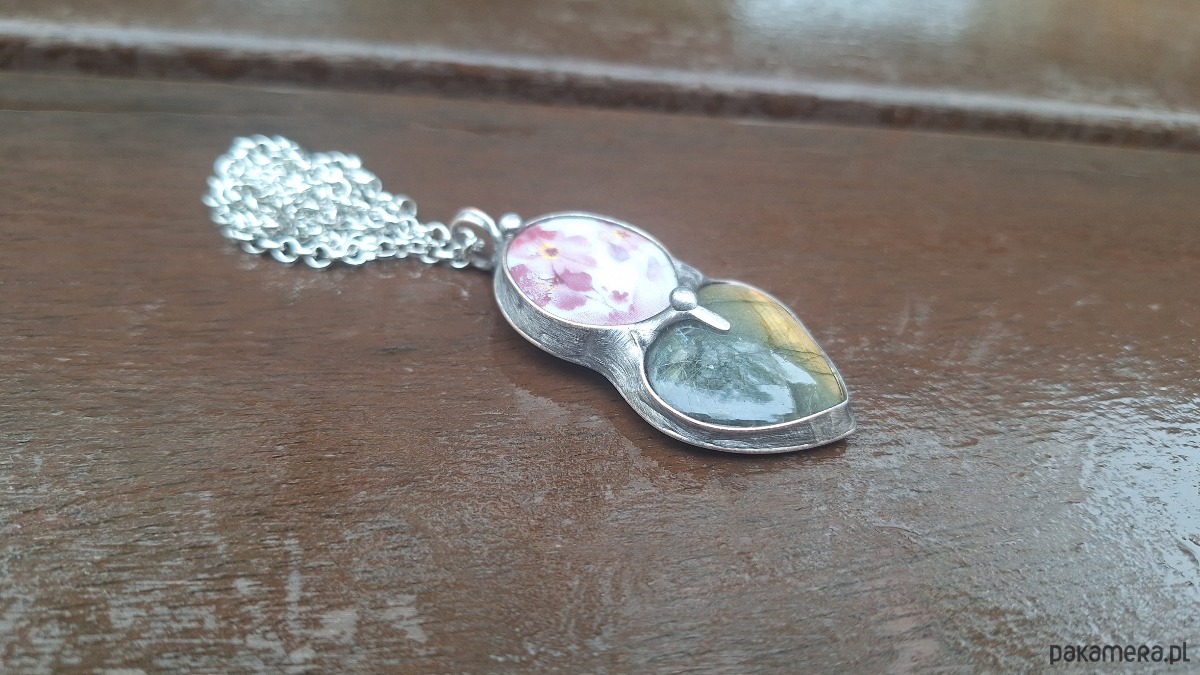 Wisiorek wykonany z miedzi, cyny, ceramiki i labradorytu. Wymiary ok. 5 na 2 cm. Zawieszony na łańcuszku o długości ok. 50 cm.