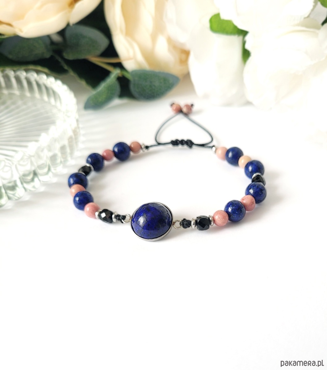 Piękna bransoletka zrobiona z kamieni naturalnych: Lapis Lazuli, Turmalin czarny, Rodonit, Hematytu w kolorze srebra.