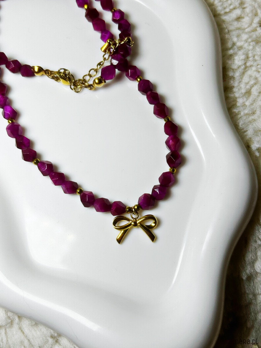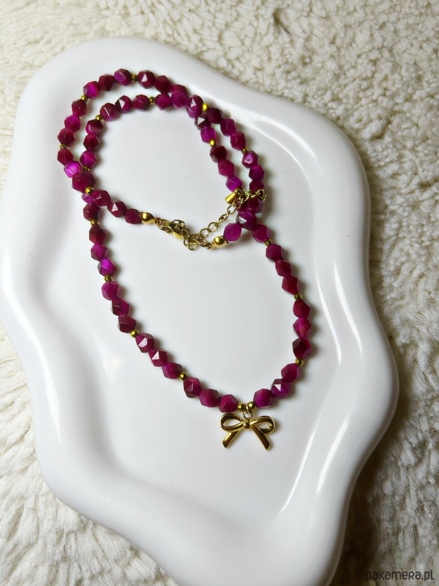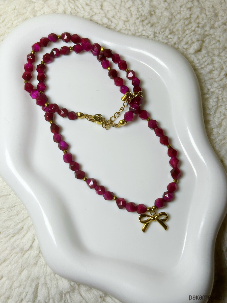 Ten wyjątkowy naszyjnik został wykonany z naturalnych rubinów w głębokim, malinowo-bordowym odcieniu. Fasetowane kamienie pięknie odbijają światło, tworząc wyrazistą, a zarazem elegancką kompozycję. Całość dopełnia delikatna złota zawieszka w kształcie kokardy, symbol subtelności, wdzięku i kobiecego uroku.