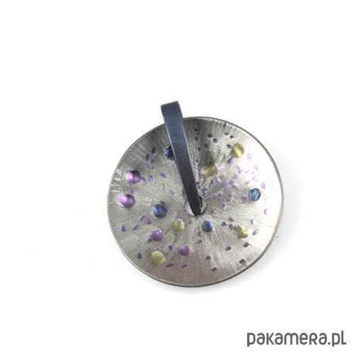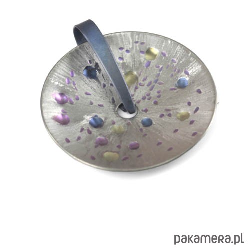 Zawieszka zrobiona jest w całości ręcznie z tytanu ,anodowanego i repusowanego.Wielkość ; średnica 4,0 cm.