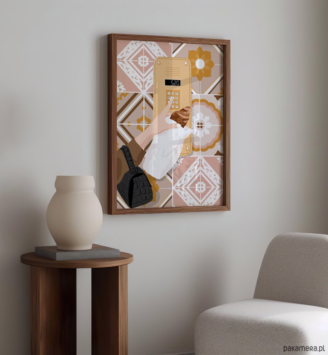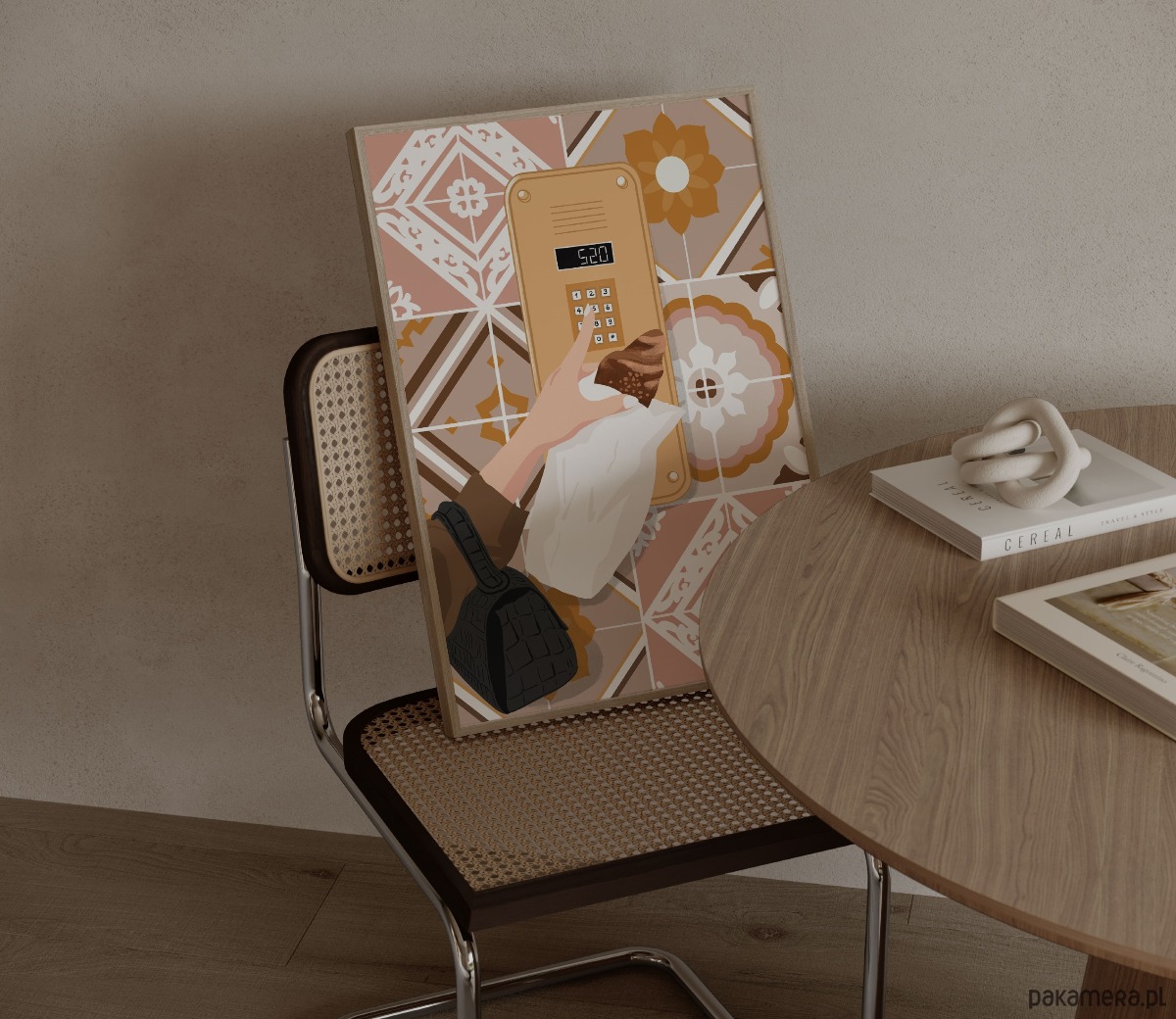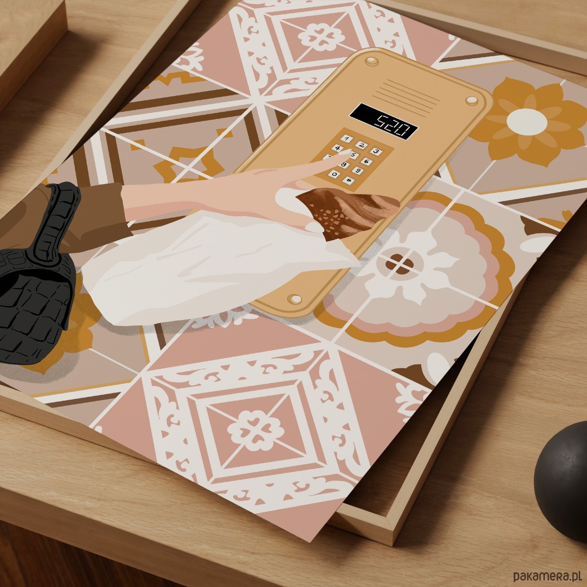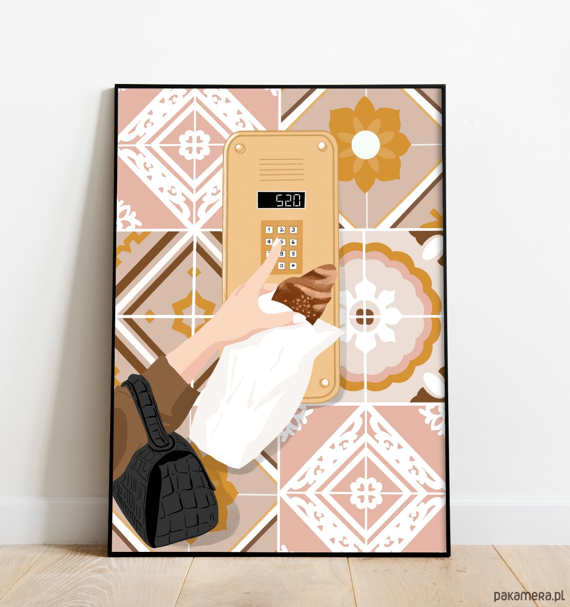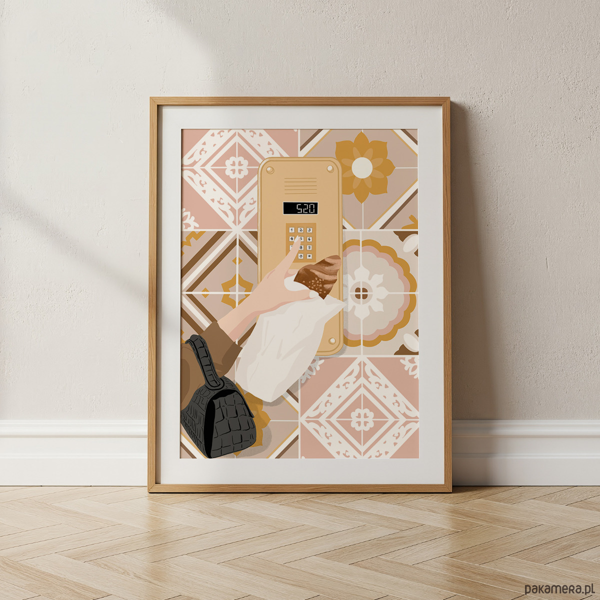 Ilustracyjny plakat inspirowany klimatem Portugalii, codziennymi detalami i charakterystycznymi wzorami azulejos. Scena z domofonem, torbą i papierową torbą z pieczywem oddaje atmosferę miejskiego spaceru i prostych, codziennych momentów uchwyconych w podróży.