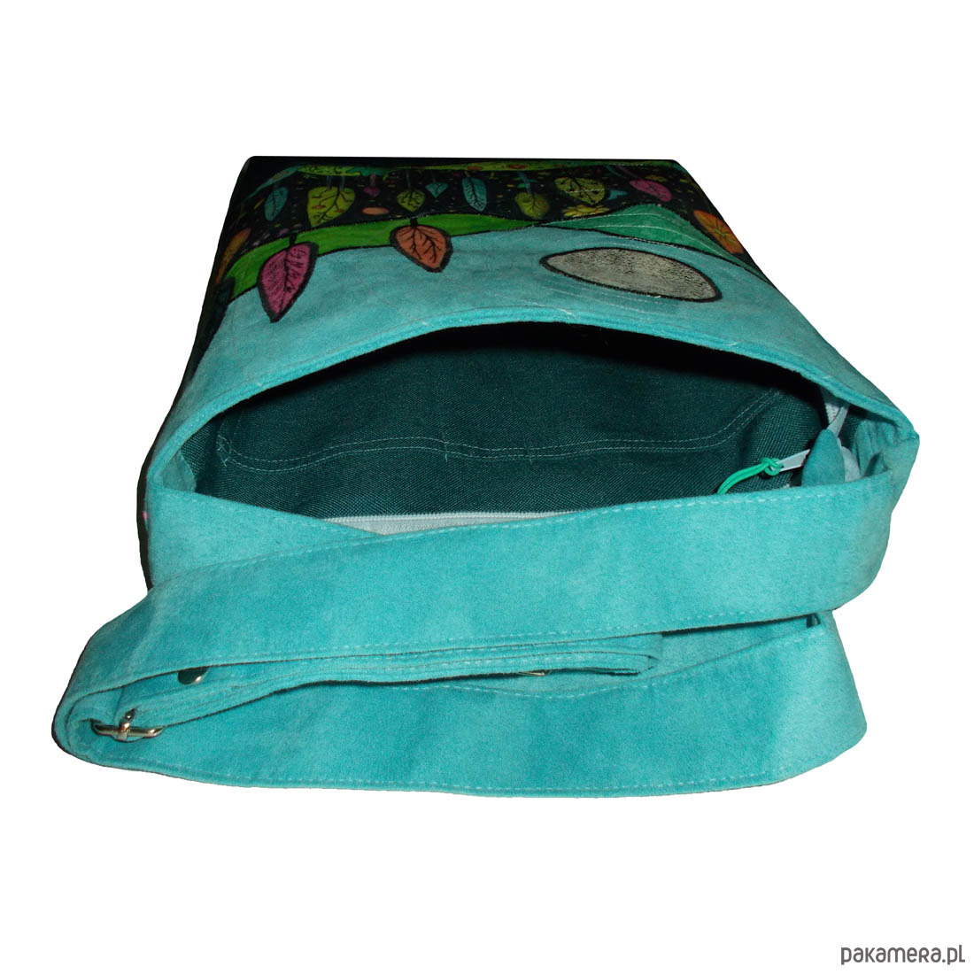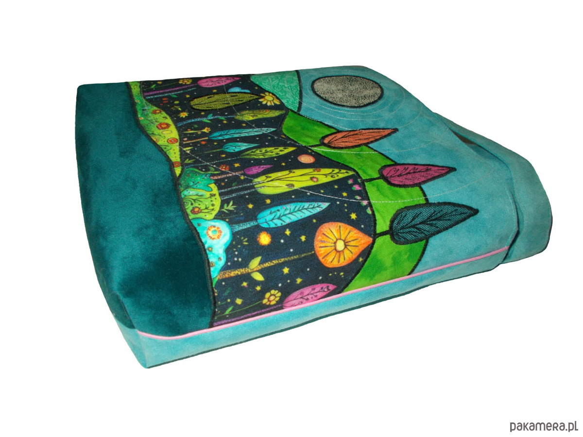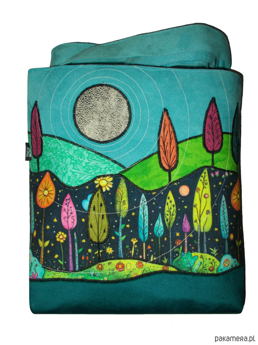 NIEPOWTARZALNA, jedna jedyna, autorska torba z tkaniny obiciowej. Tył torby w kolorze paska (turkus). Pasek z tego samego materiału co całość, z regulacją, wzmocniony nitami, okucia srebrne. Przód zdobią aplikacje układające się w niepowtarzalny pejzaż. Cała torba trzyma kształt. W szwach wypustka. Denko poszerzone. Całość zapinana na zamek. Jedna z wewnętrznych kieszeni jest również zapinana na zamek. Druga kieszeń pomieści telefon, długopis i notesik. szerokość 32cm, wysokość 30cm plus denko 8cm