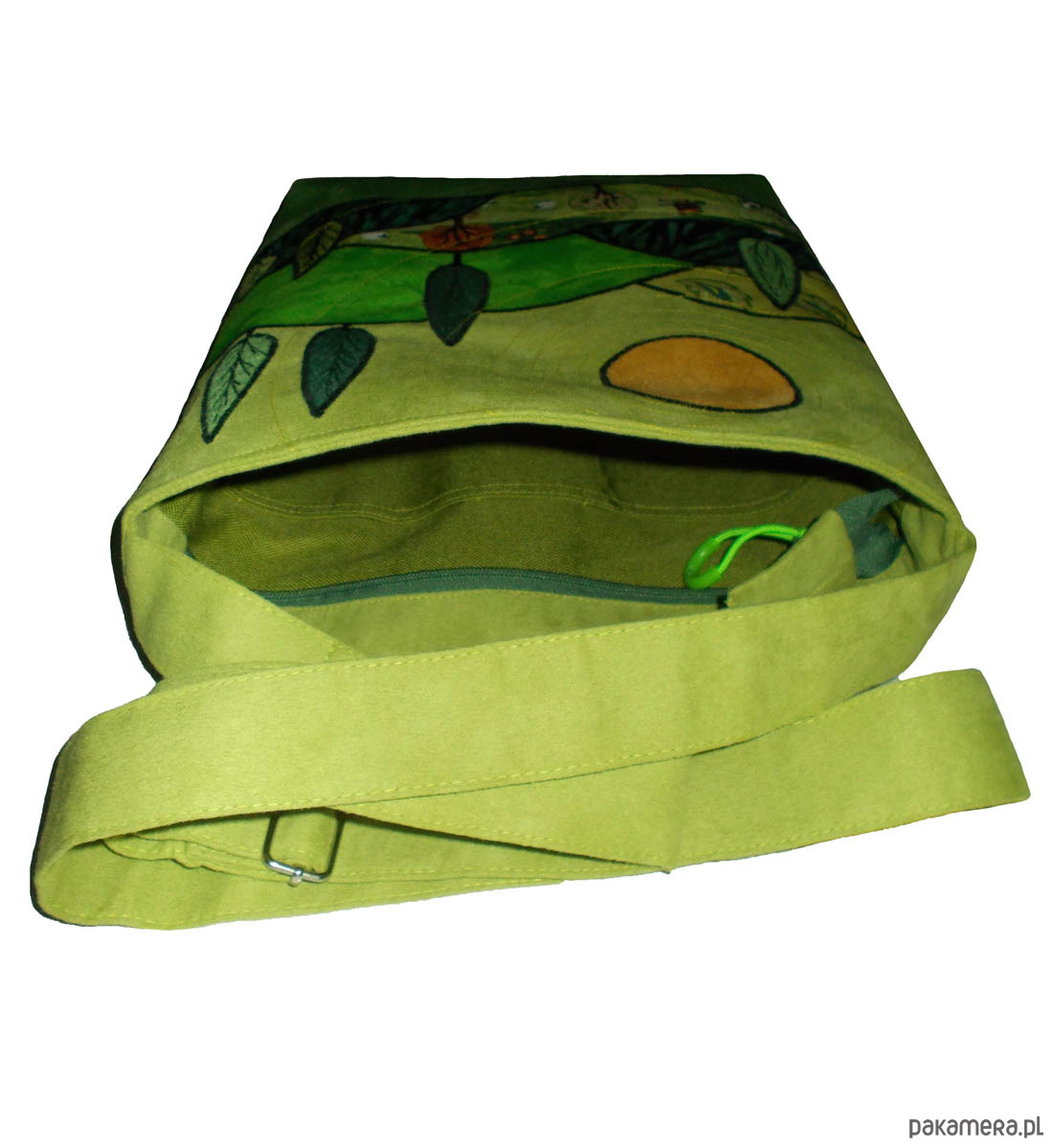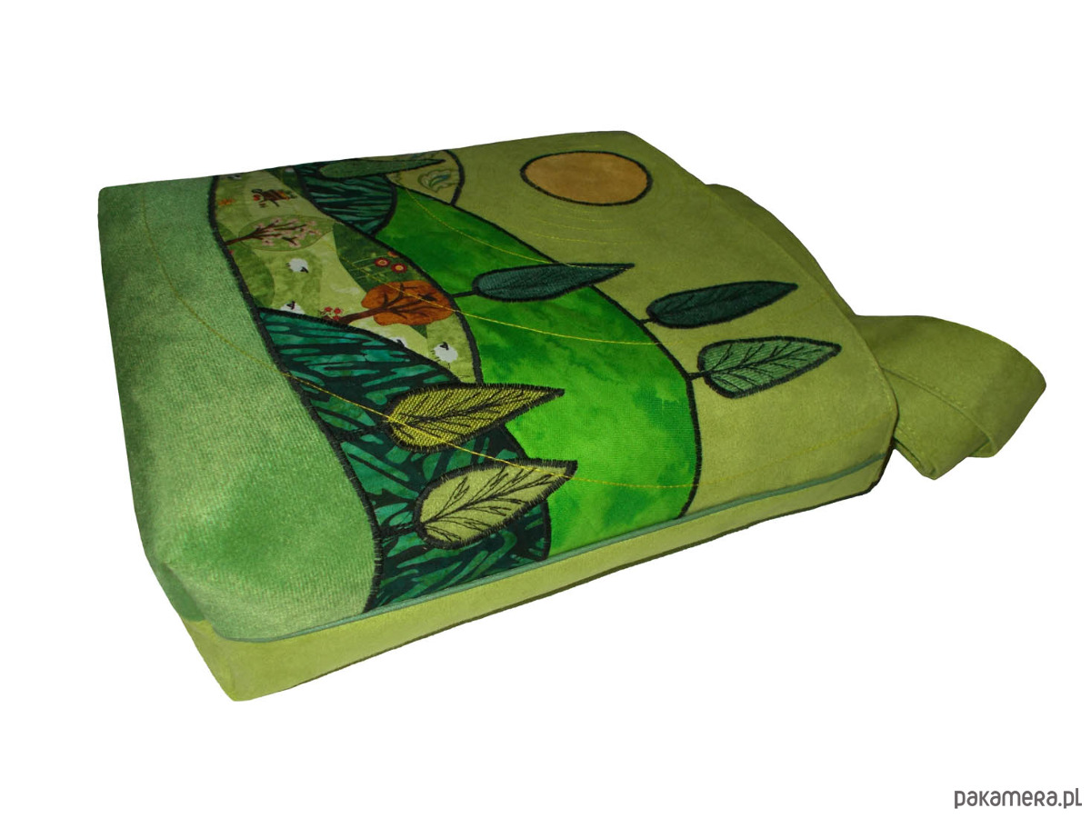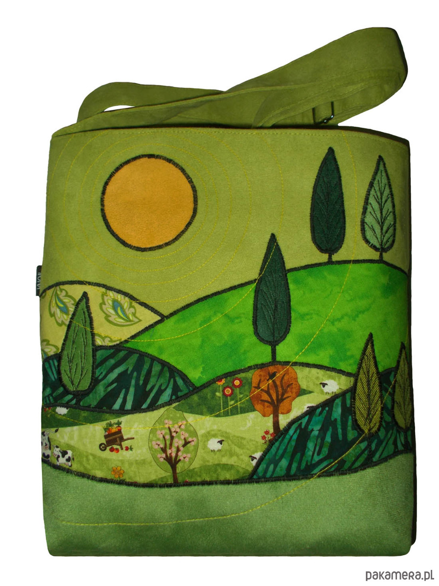 NIEPOWTARZALNA, jedna jedyna, autorska torba z eko zamszu. Tył torby w kolorze paska. Pasek z tego samego materiału co całość, z regulacją, wzmocniony nitami, okucia srebrne. Przód zdobią aplikacje układające się w niepowtarzalny pejzaż. Cała torba trzyma kształt. W szwach wypustka. Denko poszerzone. Całość zapinana na zamek. Jedna z wewnętrznych kieszeni jest również zapinana na zamek. Druga kieszeń pomieści telefon, długopis i notesik. szerokość 32cm, wysokość 30cm plus denko 8cm