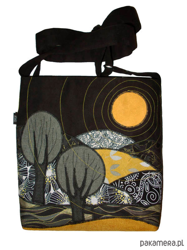 NIEPOWTARZALNA, jedna jedyna, autorska torba z eko zamszu. Tył torby gładki. Pasek z tego samego materiału co całość, z regulacją, wzmocniony nitami, okucia srebrne. Przód zdobią aplikacje układające się w niepowtarzalny pejzaż. Cała torba trzyma kształt. W szwach wypustka. Denko poszerzone. Całość zapinana na zamek. Jedna z wewnętrznych kieszeni jest również zapinana na zamek. Druga kieszeń pomieści telefon, długopis i notesik. szerokość 32cm, wysokość 30cm plus denko 8cm