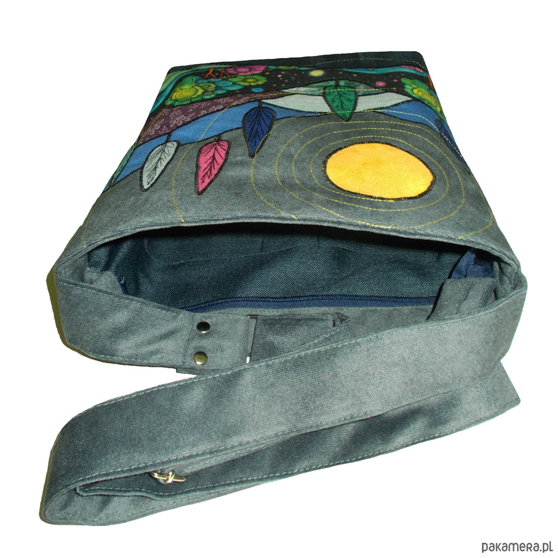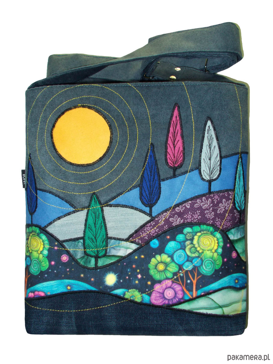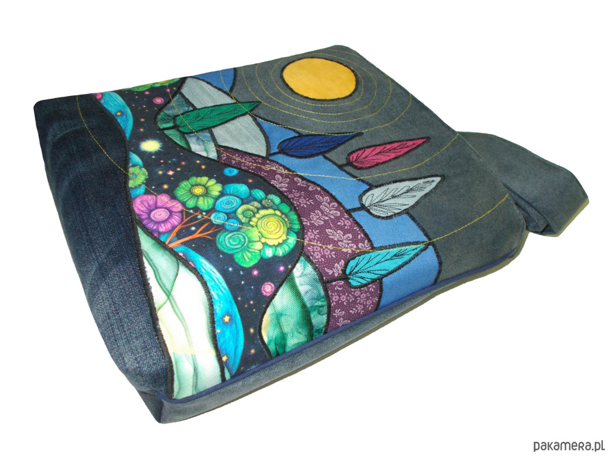NIEPOWTARZALNA, jedna jedyna, autorska torba z tkaniny obiciowej. Tył torby w kolorze paska (zszarzały niebieski). Pasek z tego samego materiału co całość, z regulacją, wzmocniony nitami, okucia srebrne. Przód zdobią aplikacje układające się w niepowtarzalny pejzaż. Cała torba trzyma kształt. W szwach wypustka. Denko poszerzone. Całość zapinana na zamek. Jedna z wewnętrznych kieszeni jest również zapinana na zamek. Druga kieszeń pomieści telefon, długopis i notesik. szerokość 32cm, wysokość 30cm plus denko 8cm