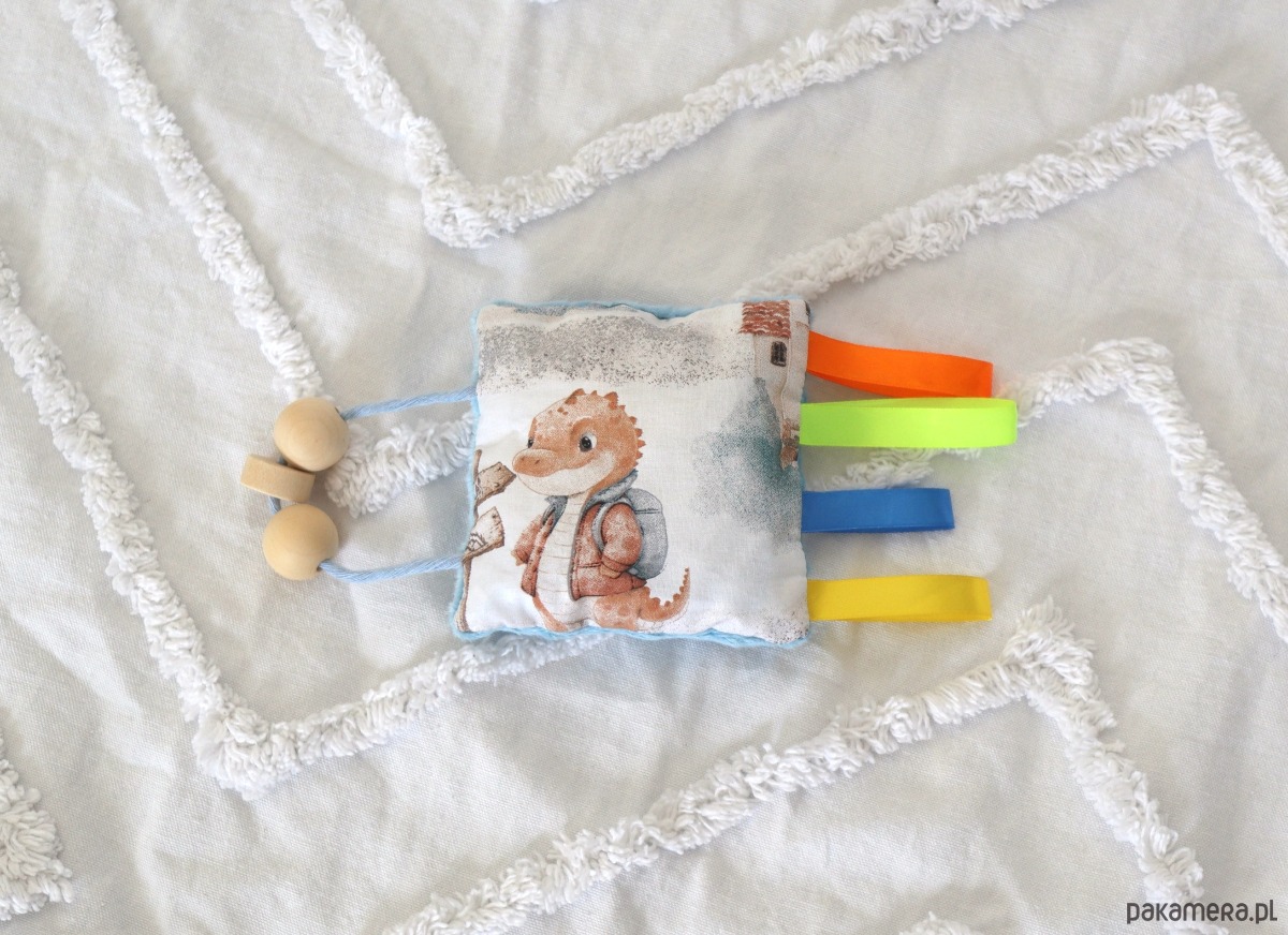Ręcznie wykonana zabawka podusia dla niemowlaka z dzianiny Minky oraz bawełny w smoki.