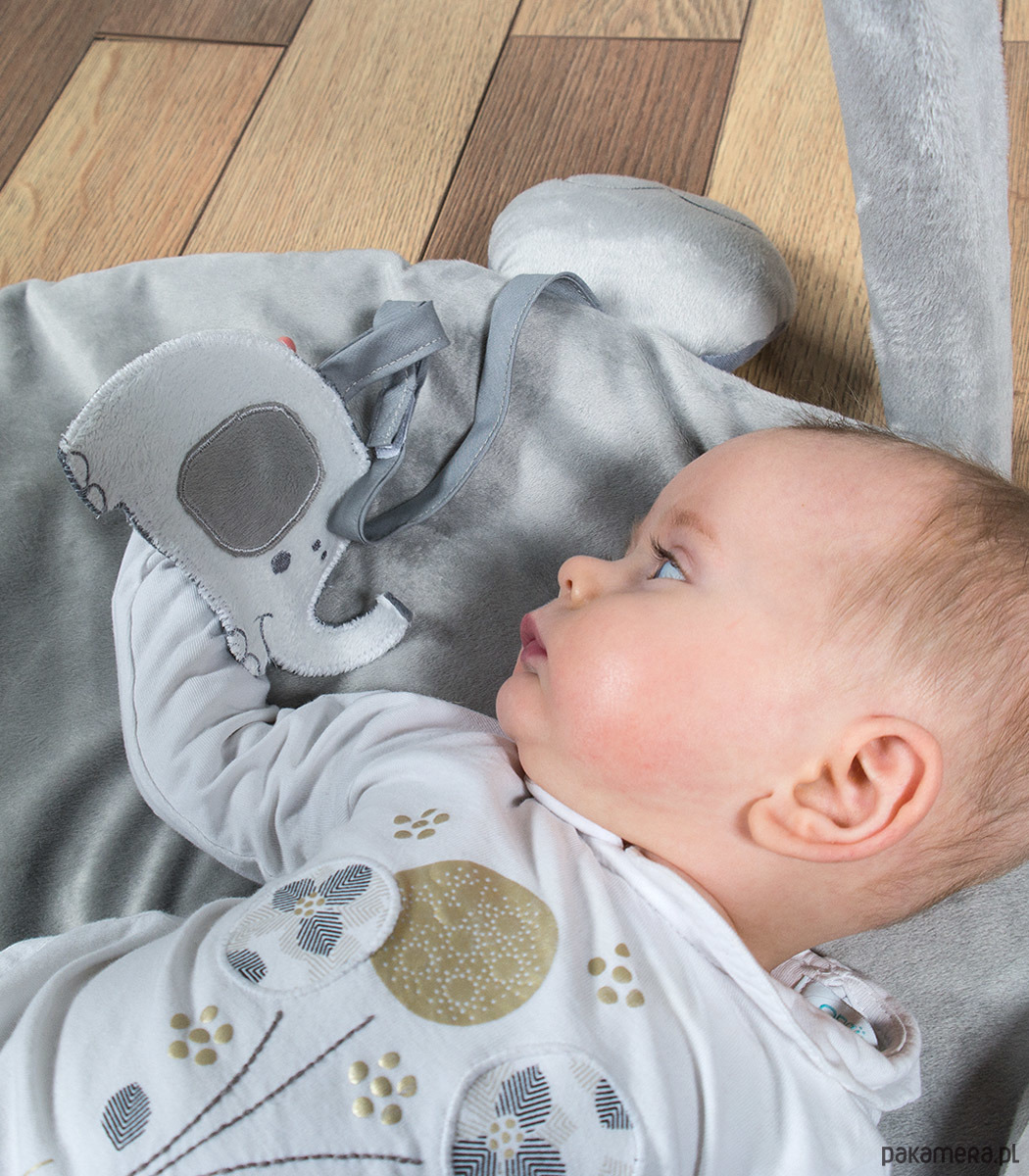 Zabawka od 0+ rozwija zdolność ruchową i wzrokową Twojego dziecka. Dywanik posiada dwa stabilne pałąki, na których na odpinanych zaczepach przymocowane są zabawki 4 zabawki (gwiazdki z grzechotkami i półkula z lusterkiem) oraz kolorowe dzwoneczki i plastikowe kółeczka. Mata jest wykona z wysokogatunkowych surowców, bezpieczna dla dzieci. Maluch odnajdzie na niej drewniany gryzaczek oraz grzechocącą piłeczkę.
