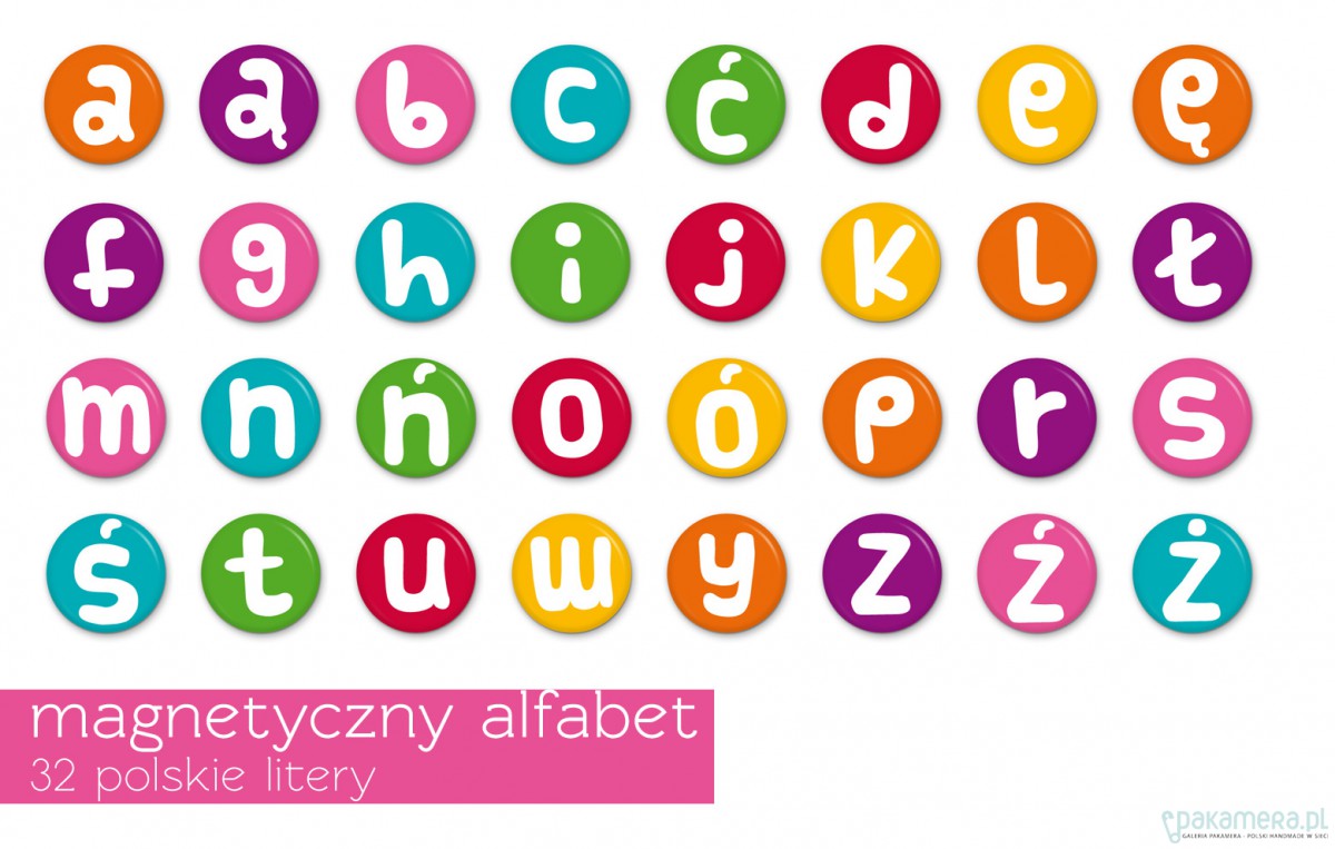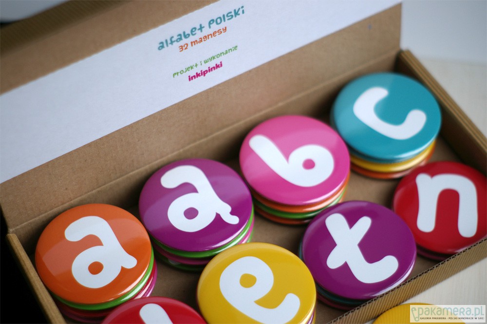 Magnetyczny alfabet zawiera 32 szt. dużych magnesów (średnica 57 mm) z wszystkimi literami polskiego alfabetu. Magnesy zapakowane są w kartonowe pudełeczko - gotowe na prezent. Soczyste, kolorowe literki będą pomocne w nauce alfabetu przez dzieci, udekorują też sporą część lodówki :)