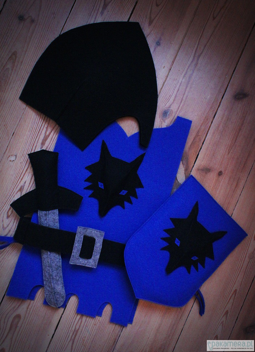 Ten mały acz waleczny rycerz należy do klanu szarych wilków. Strzeżcie się jego ostrego miecza! Przebranie składa się z hełmu, miecza, tarczy, zbroi i pasa. Wszystkie elementy uszyte z niebieskiego, czarnego i szarego filcu. Rozmiar uniwersalny-od 3 lat w górę. Wykonane ręcznie w pracowni Pana Pepe.