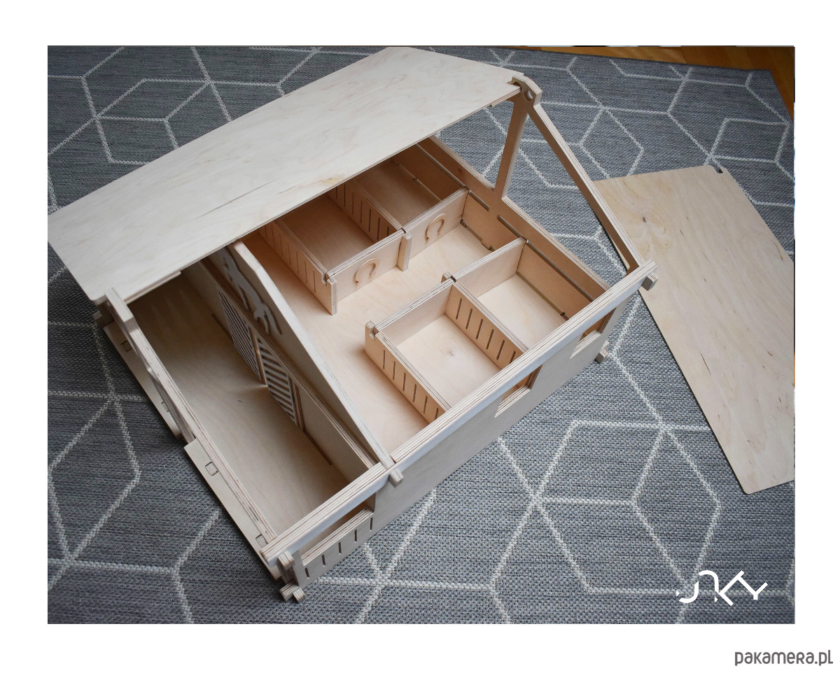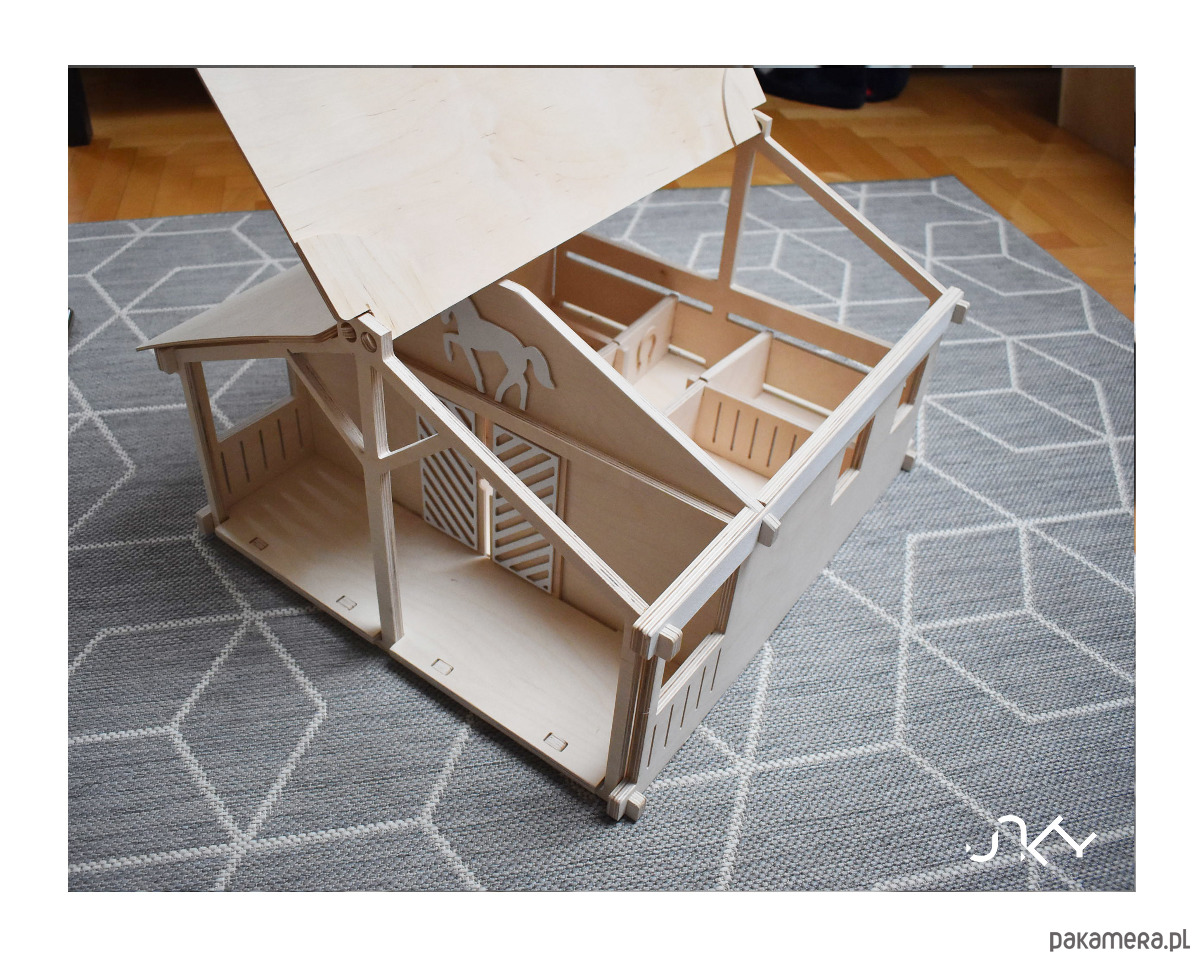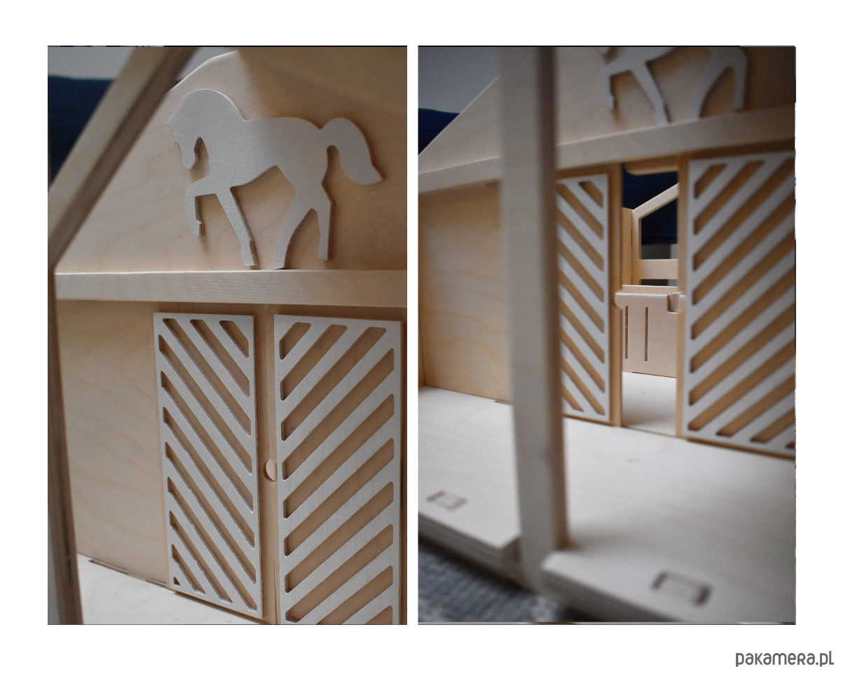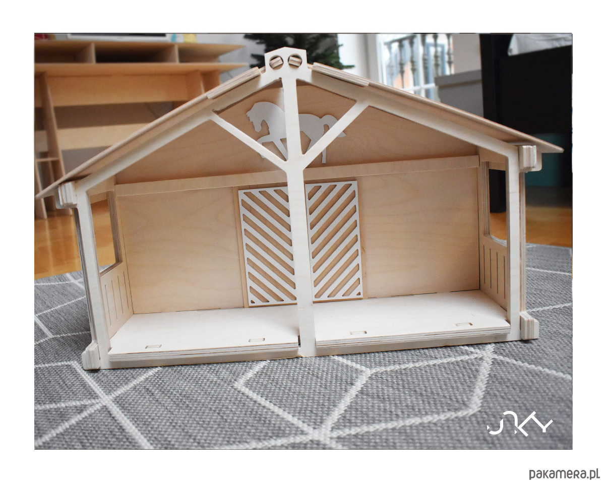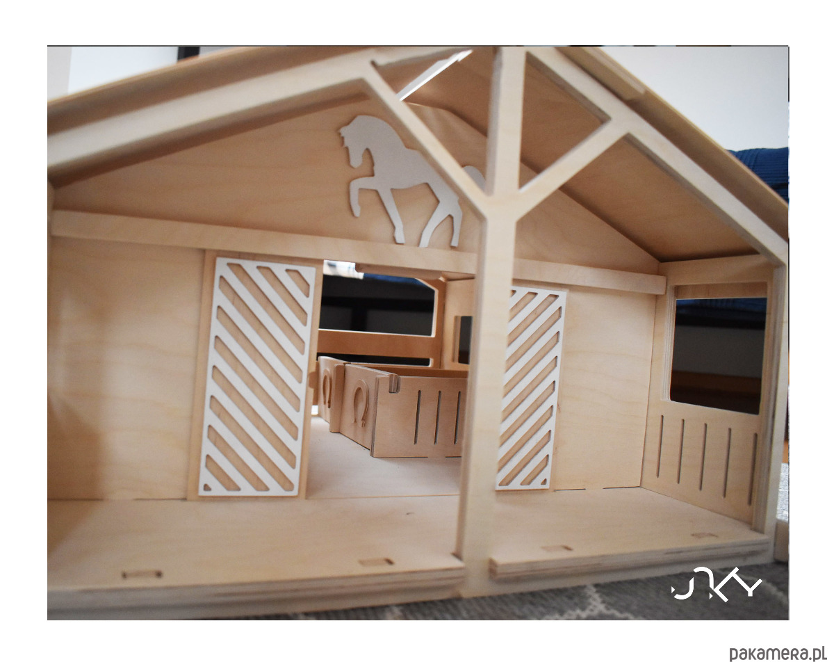 Stajnia, wykonana ze sklejki brzozowej grubości 10mm. (elementy dekoracyjne - malowane na biało oraz dach - sklejka o grubości 3mm)