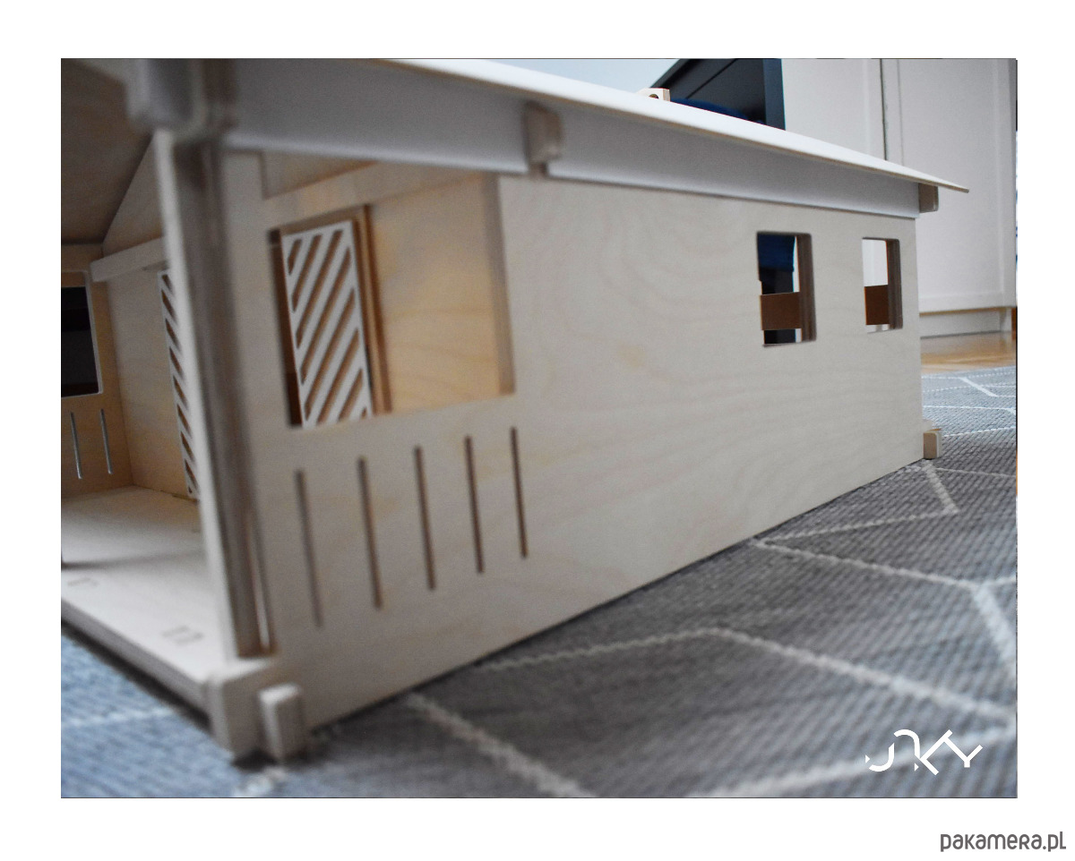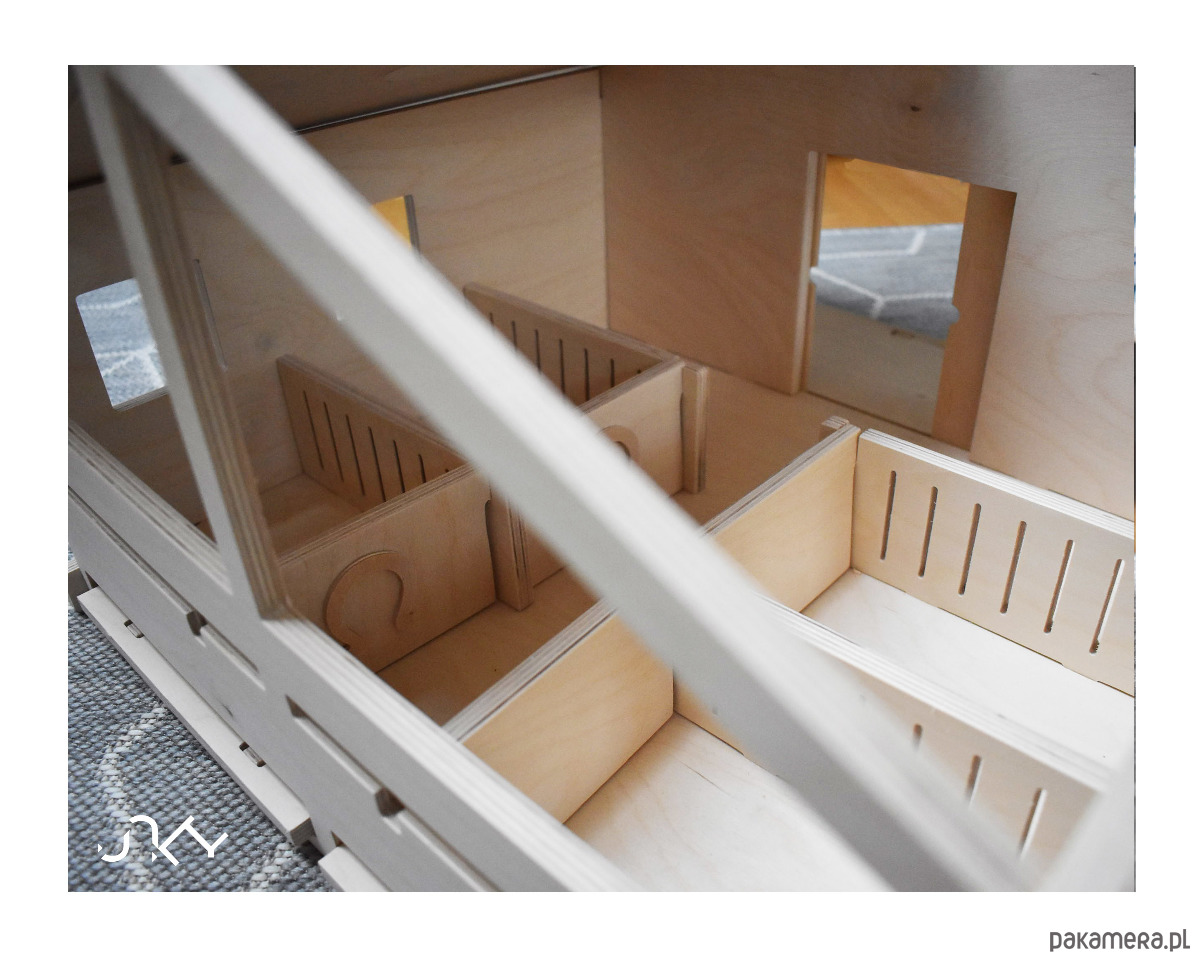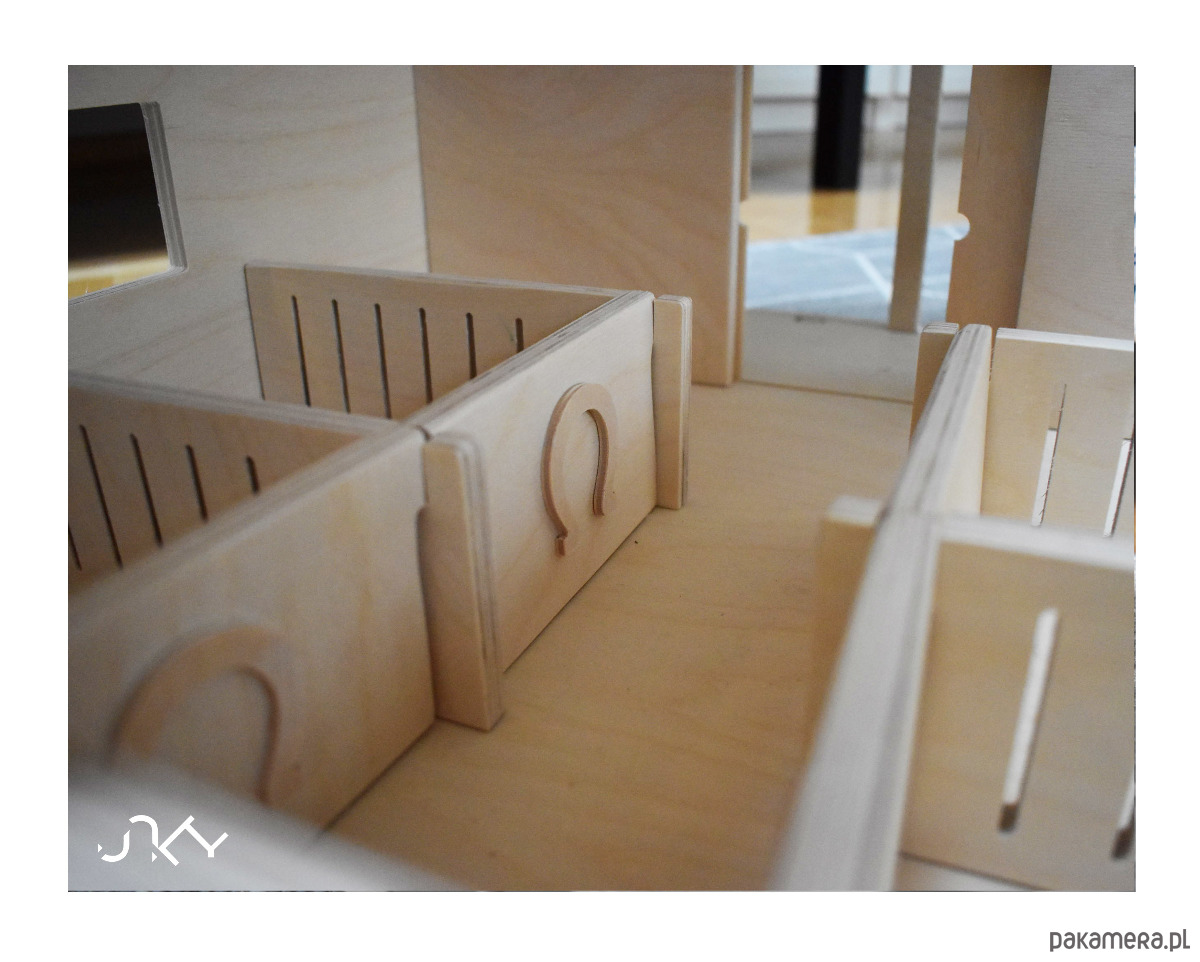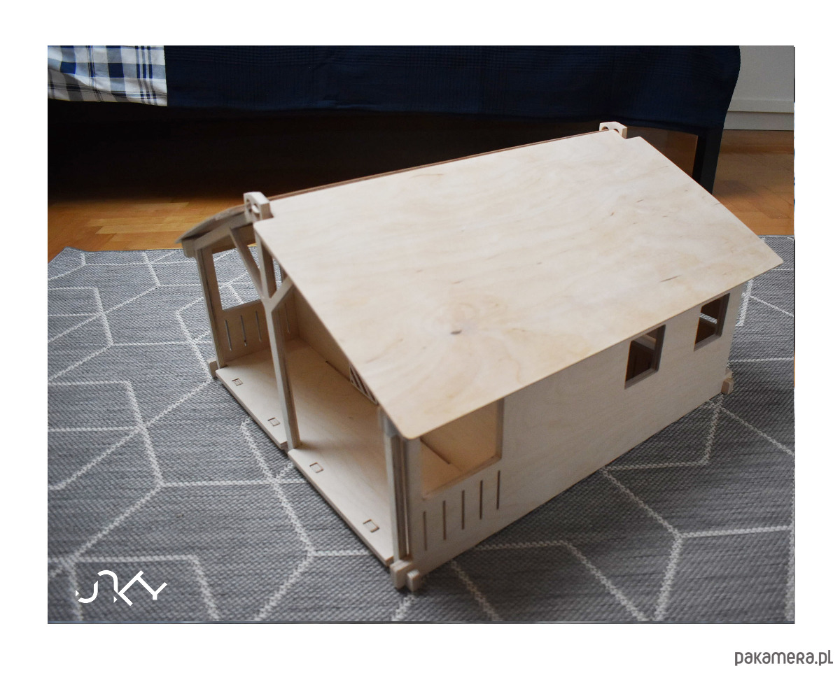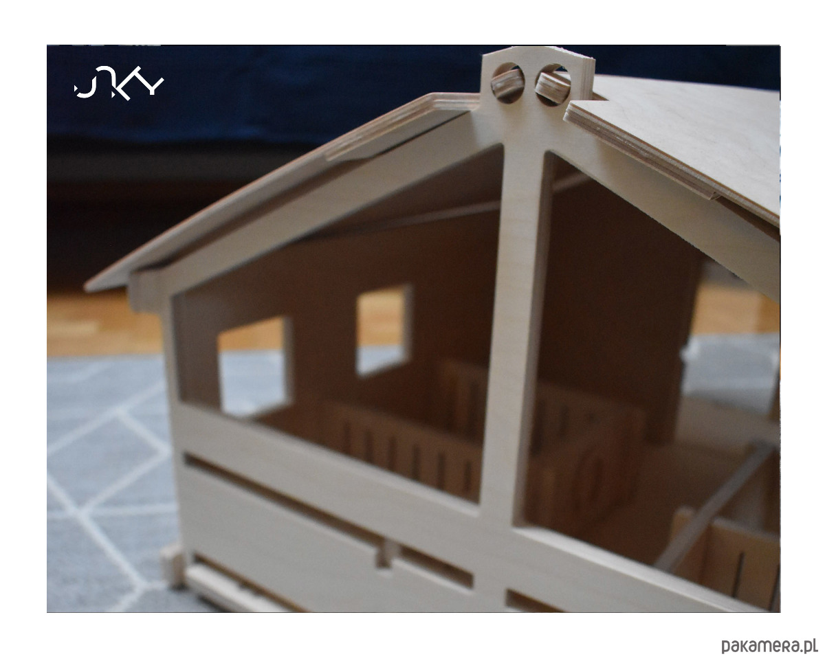 Stajnia, wykonana ze sklejki brzozowej grubości 10mm. (elementy dekoracyjne - malowane na biało oraz dach - sklejka o grubości 3mm)