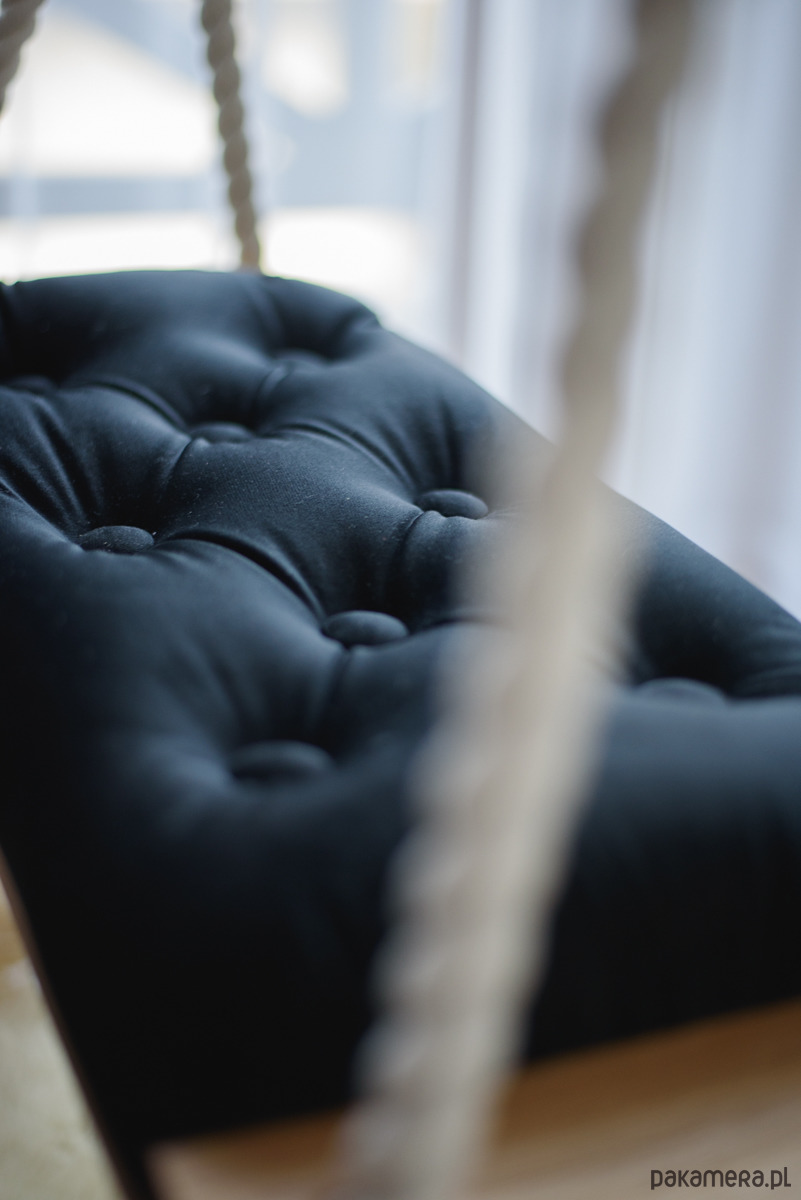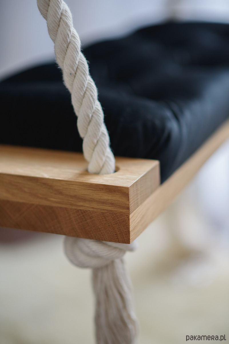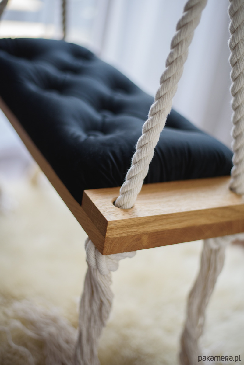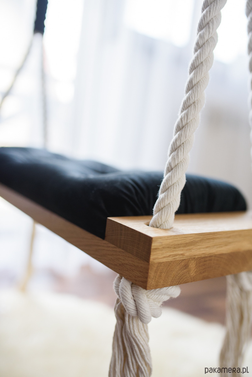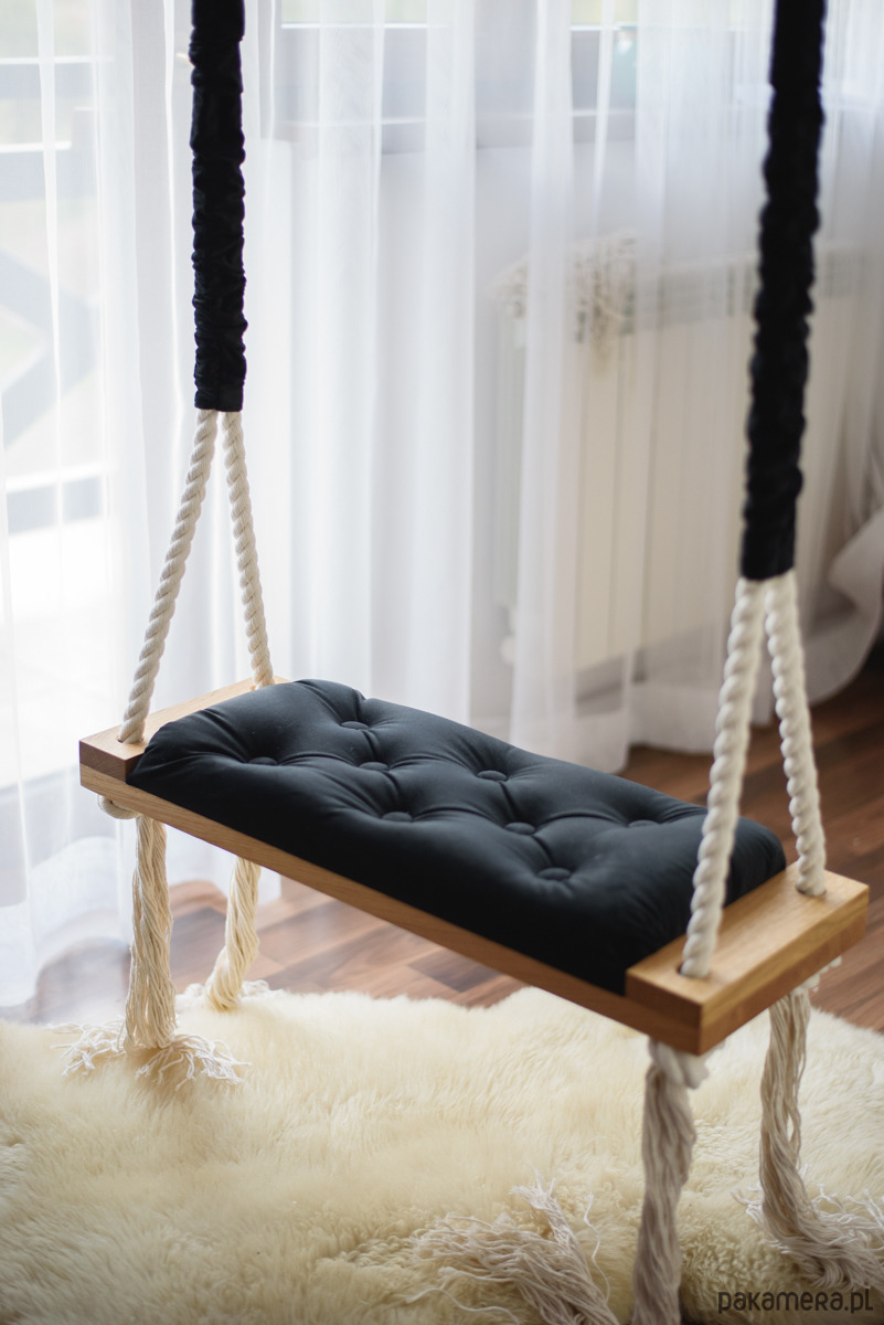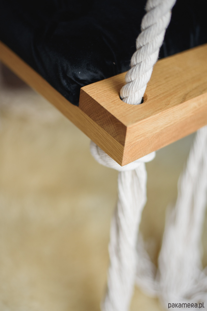 Bukowa huśtawka na linach z siedziskiem w kolorze NATURALNYM z czarnym siedziskiem. Huśtawka będzie idealną dekoracją w pokoju dziecięcym albo salonie w stylu skandynawskim czy boho. Huśtawka jest wykonana z litych dębowych dech, zabezpieczona jest olejem.