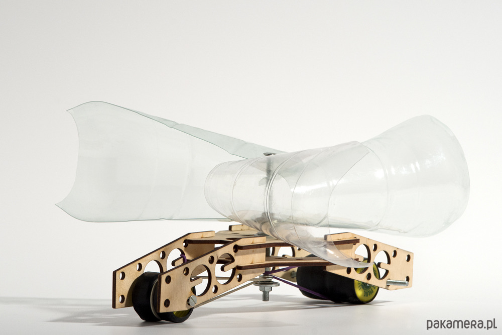 Oto nasz nowy zestaw części dzięki któremu można zbudować 3 pojazdy. Uniwersalne części wykonane ze sklejki pozwolą na wykonanie dwóch pojazdów jeżdżących, oraz jednego pływającego. Może wymyślicie coś jeszcze? Pierwszy pojazd ma napęd na żagiel z turbiną rotorową. Świetnie jeździ na wietrze( można tez rozpędzić go suszarką lub odkurzaczem:). Drugi posiada prosty napęd „na gumkę”, możemy go nakręcać i mknie około 3 m do przodu. Ostatni to wodny poduszkowiec, napędzany balonikiem. Wystarczy nadmuchać balonik i mknie po tafli wody niczym motorówka.