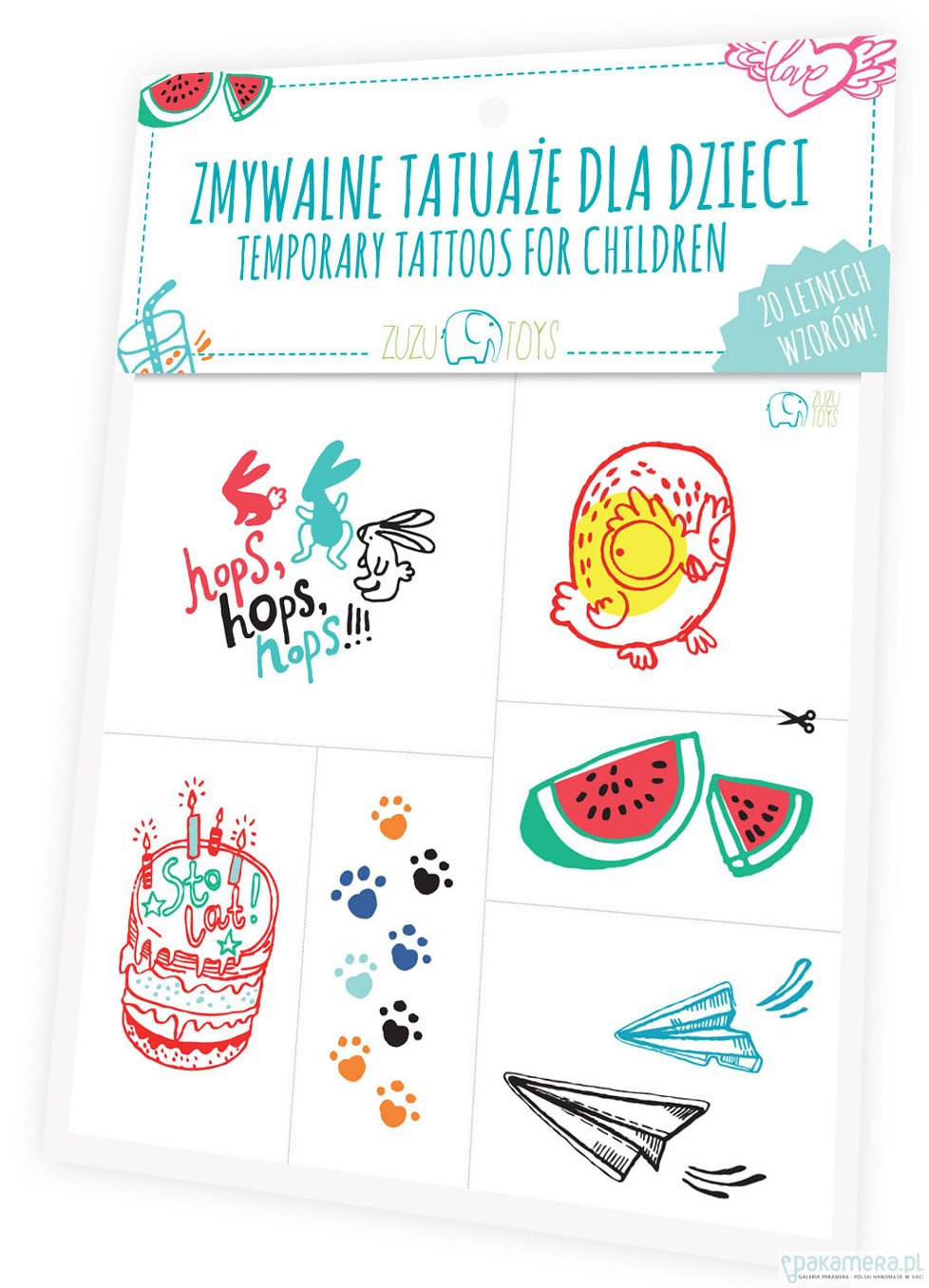 Zestaw 20 zmywalnych tatuaży dla dzieci przedstawiających letnie wzory.