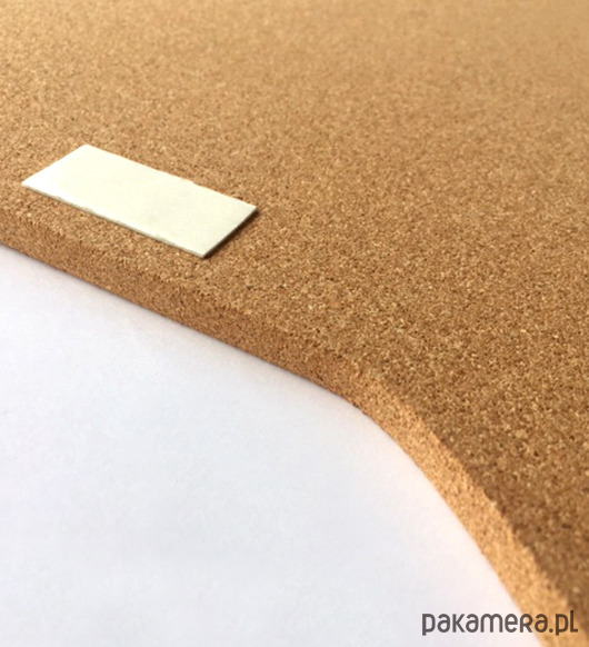 Tablica korkowa wykonana jest z korka o grubości 8 mm. Montaż na ścianę za pomocą taśmy piankowej, dwustronnej dołączonej do tablicy.