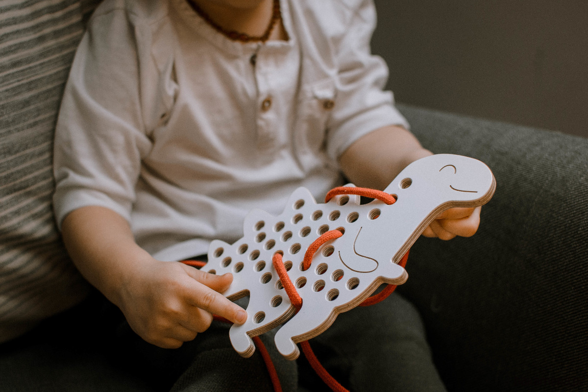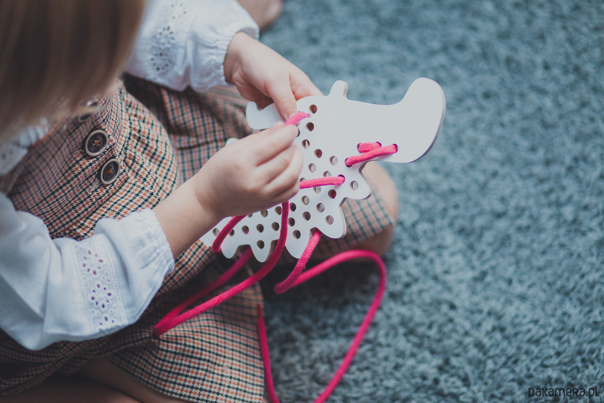 Przeplatanie sznurówki przez dziurki rozwija wzrok, kreatywność, wyobraźnię, umiejętności motoryki małej.