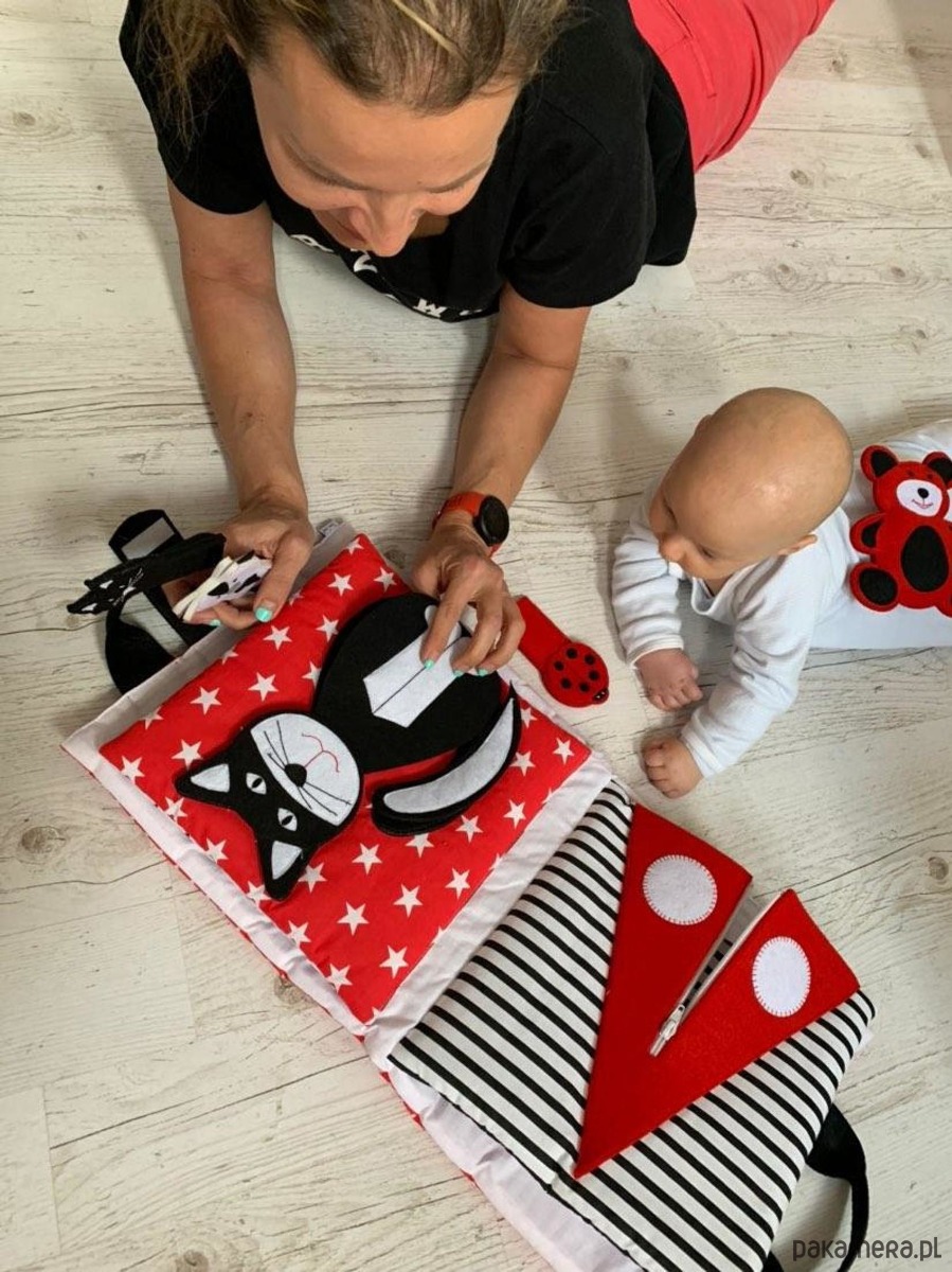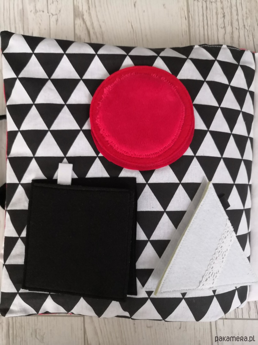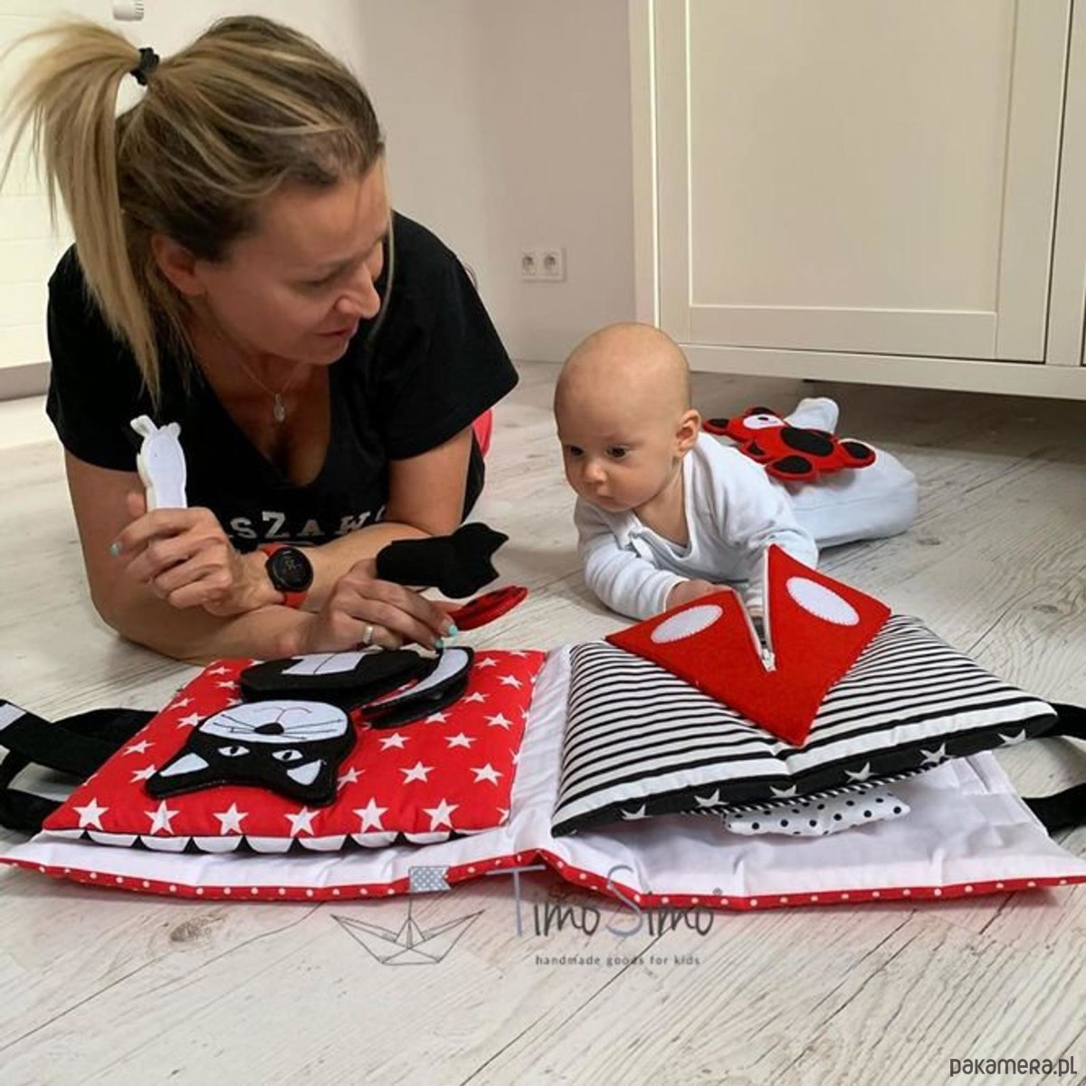 Książeczka sensoryczna 0+ przeznaczona dla dzieci od pierwszych dni życia. Kontrastowa. Zaprojektowana w taki sposób, aby stymulować rozwój wzroku niemowląt. Kolory: biel, czerń i czerwony to barwy, które rozpoznaje dziecko na początku swojego życia. Książeczka wpływa na rozwój zmysłów dziecka.