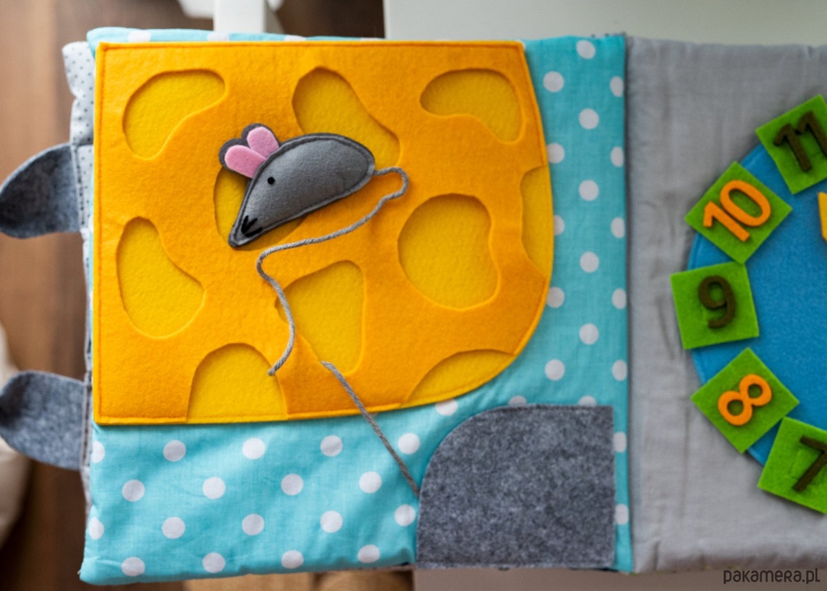 Kolejna strona to: myszka, która chętnie powędruje między dziurkami w serku, dzięki temu dziecko uczy się przeplatania.