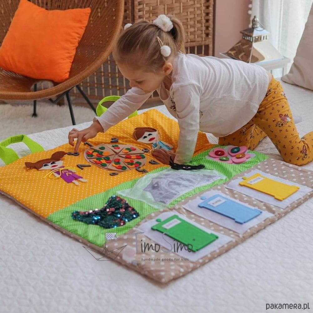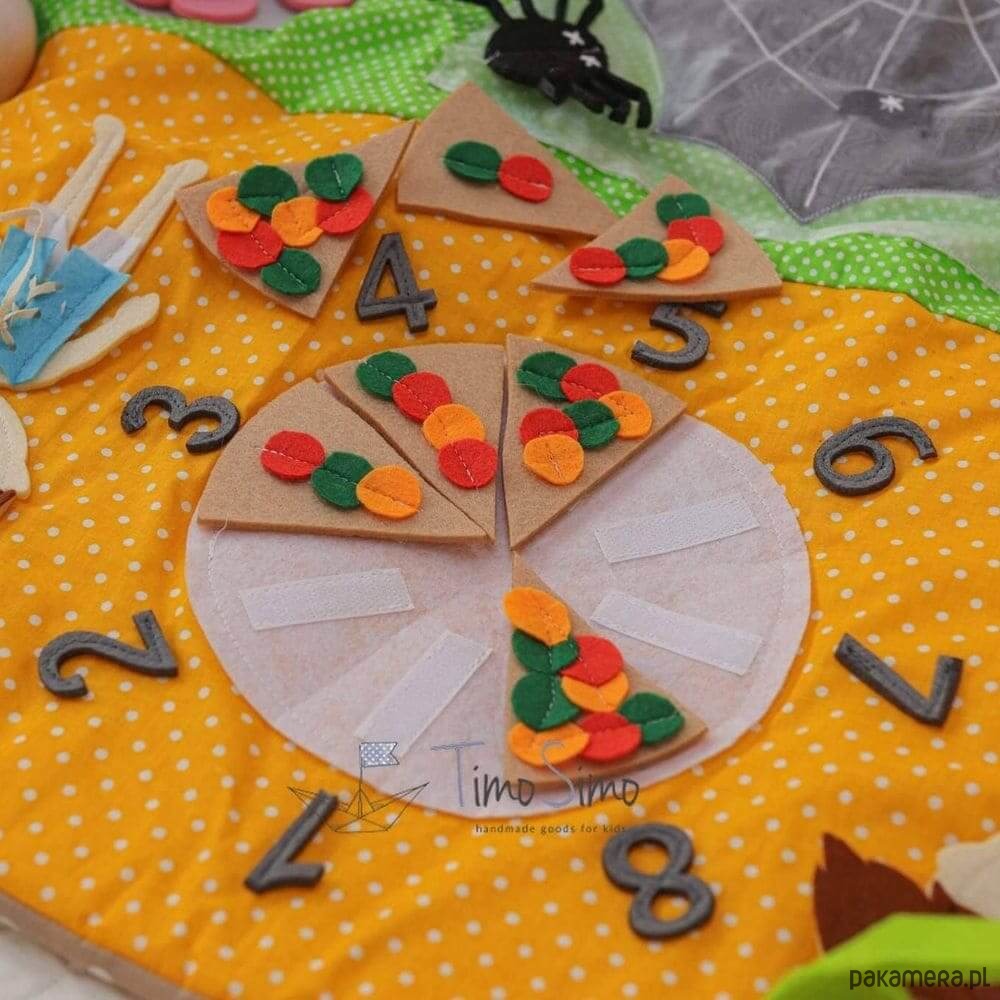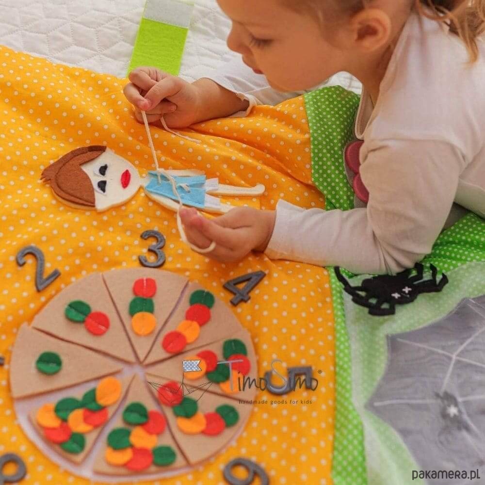 Górna strefa: nauka sznurowania i przeplatania ubranek dzieci, a także nauka matematyki - przyporządkowania określonej liczby elementów do przedstawionej cyfry. Wszystko podane na talerzu z pyszną pizzą :)