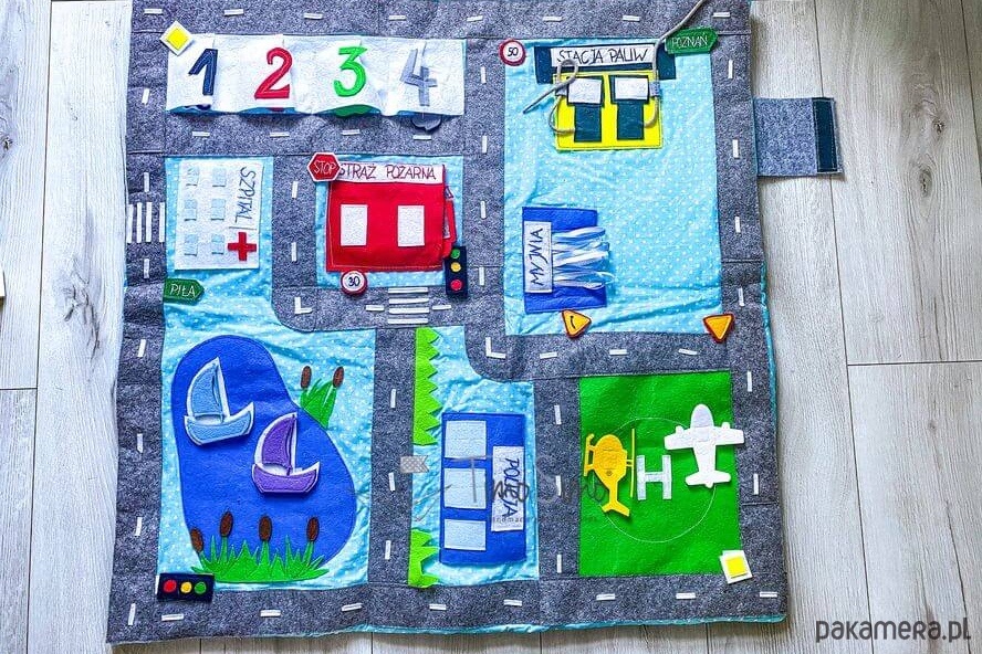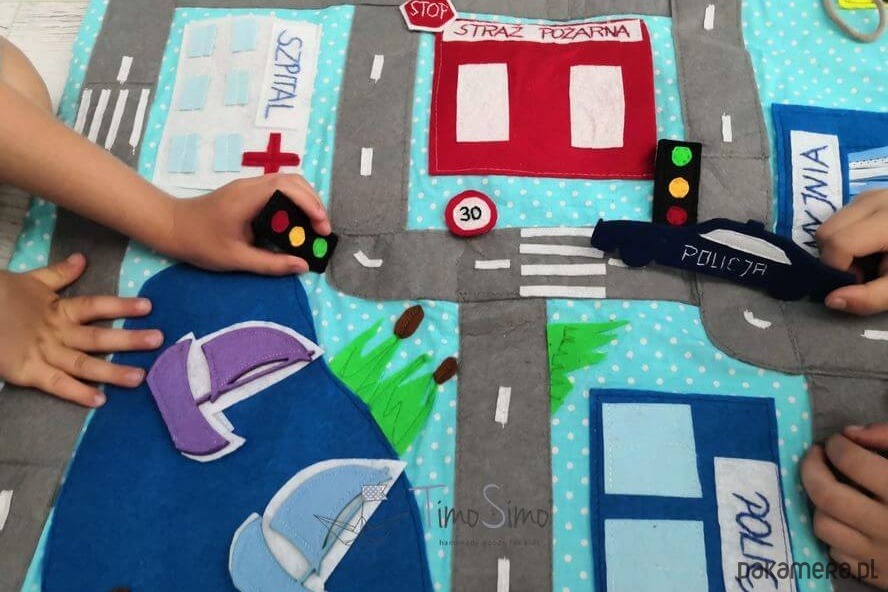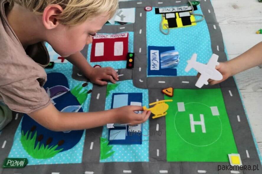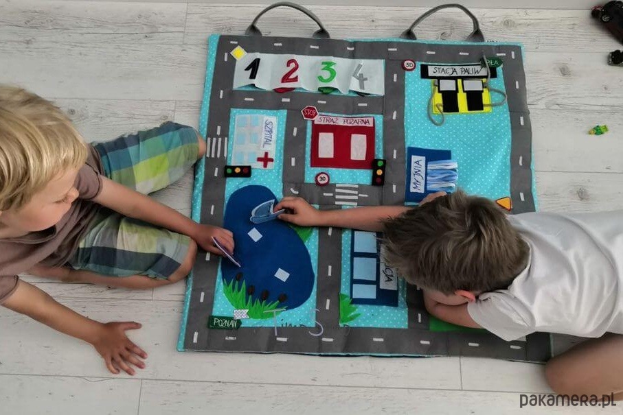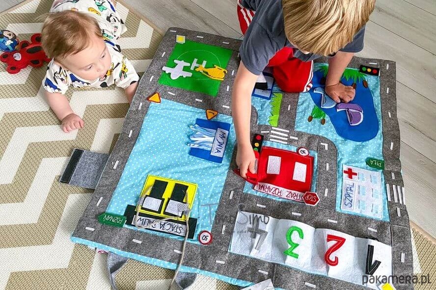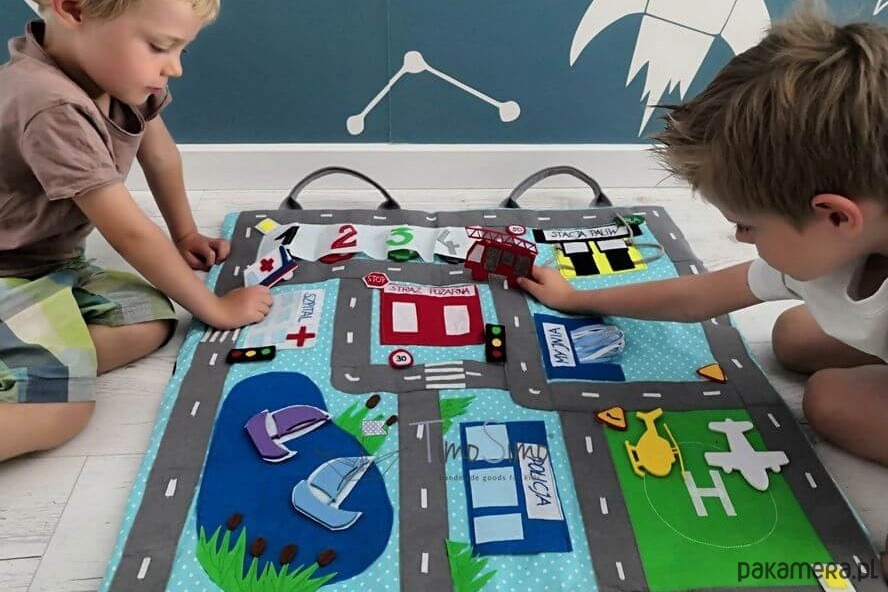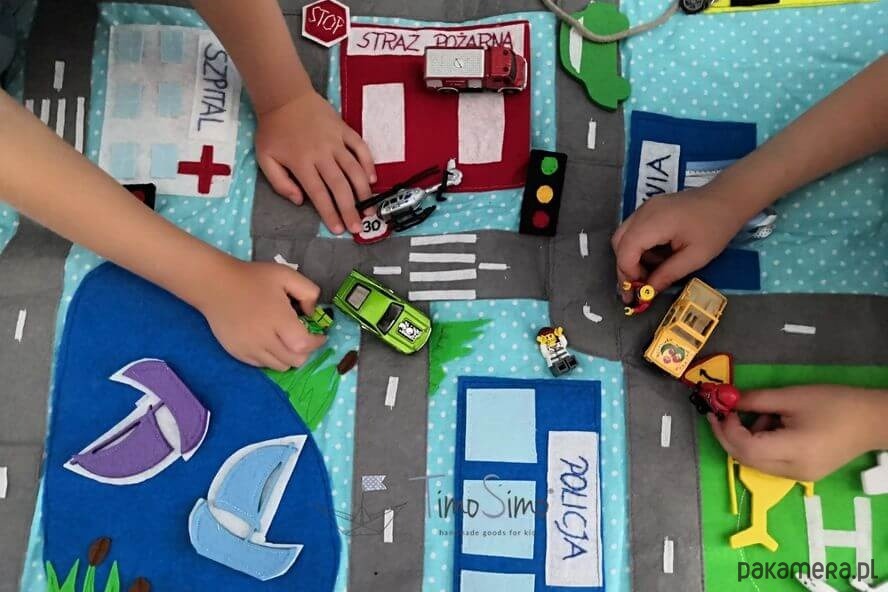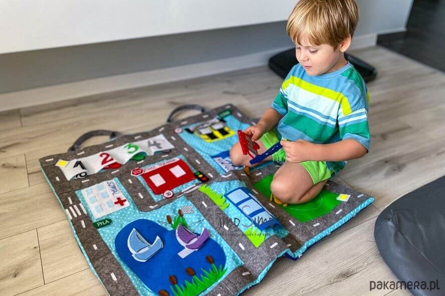 Warto do zabawy na macie używać także własne resoraki, drewniane tory z kolejką, czy pojazdy i ludziki lego. Dzięki temu można zbudować na podłodze pokoju dziecka- prawdziwe miasteczko! Ogranicza nas tylko wyobraźnia!